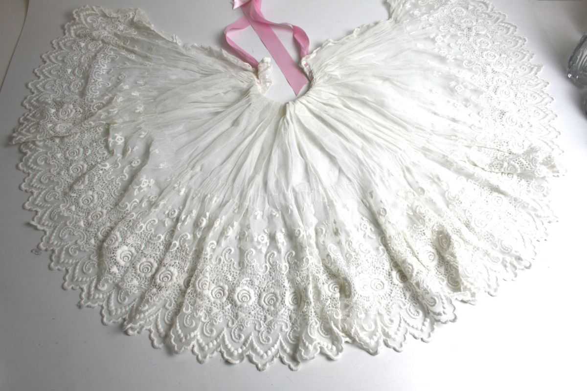 VER IMÁGENES PARA COMPROBAR ESTADO REAL. LAS IMÁGENES FORMAN PARTE DE LE DESCRIPCIÓN. BORDADO A MANO SOBRE TUL. APLICACIÓN DE ENCAJES BORDADOS A MANO. CINTA DE RASO DE SEDA. EL TUL ES DE ALGODÓN Y SEDA. LA CAMISOLA ES DE VISCOSA. PRESENTA ZONAS AMARILLEADAS. EL VESTIDO TIENE UN VELCRO COSIDO RECIENTEMENTE. SE COMPONE DE 5 PIEZAS. MEDIDAS APROX. EN CM. GORRO 14X15. CAPA CIRCUNFERENCIA DE 100 CM. DIÁMETRO. CAMISOLA-FALDÓN DE TUL EXTERIOR 21 CINTURA. 65 LARGO TOTAL. 85 DIÁMETRO FALDÓN. CAMISOLA-FALDÓN DE TUL 27 CINTURA. 62 LARGO TOTAL. 60 DIÁMETRO. CAMISOLA DE SEDA 30 CINTURA. 60 LARGO TOTAL. 78 DIÁMETRO FALDÓN.