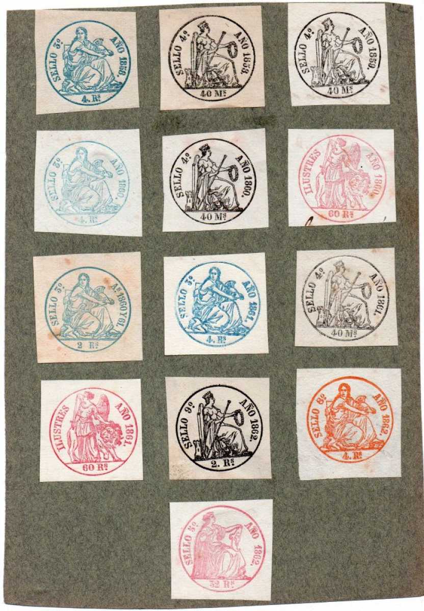NUM003 LOTE DE 13 SELLOS FISCALES PEGADOS SOBRE CARTULINA ESPAÑA DE 1858 A 1862