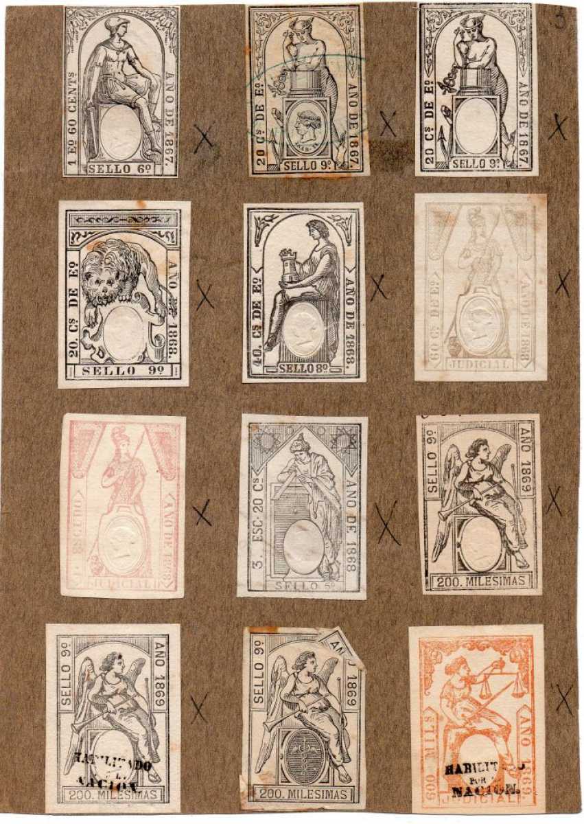 NUM007 LOTE DE 12 SELLOS FISCALES PEGADOS SOBRE CARTULINA ESPAÑA DE 1867 A 1869