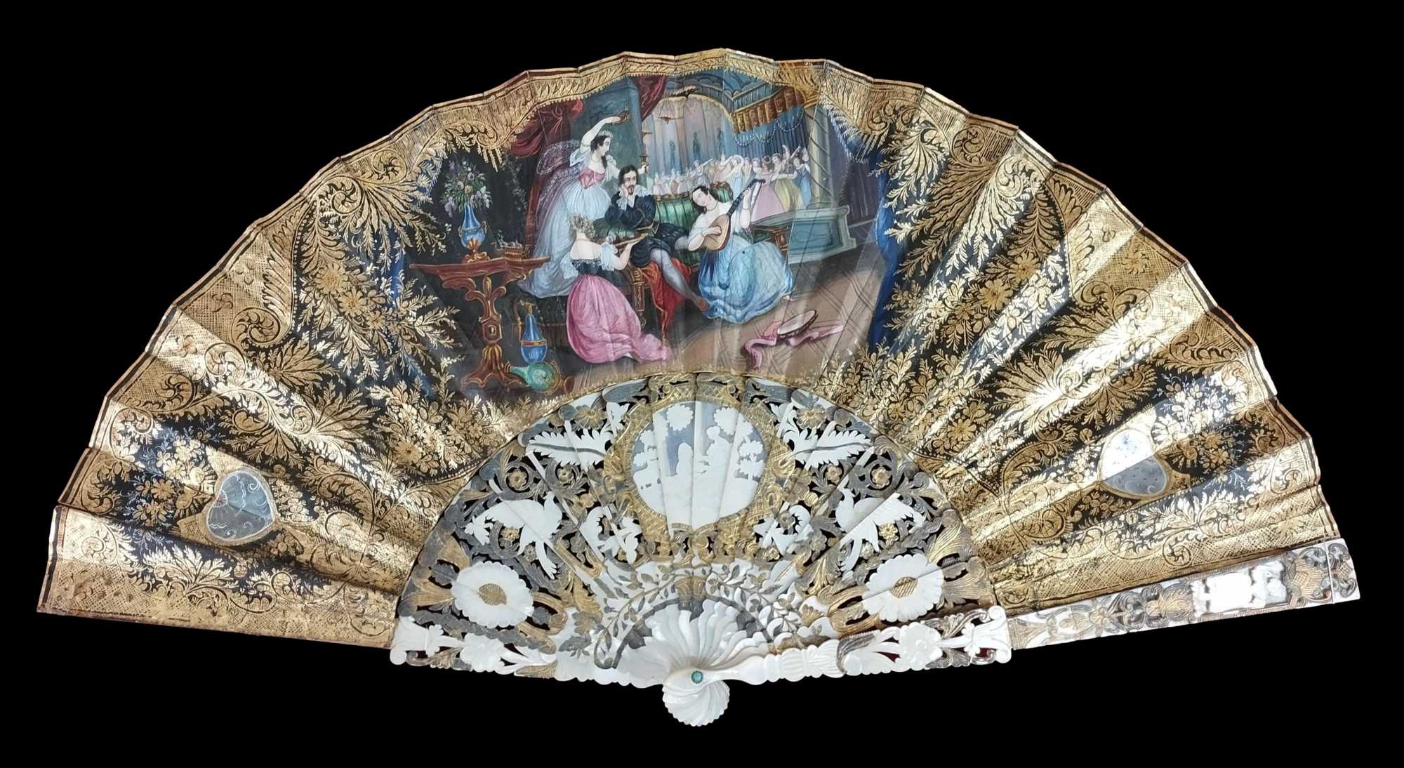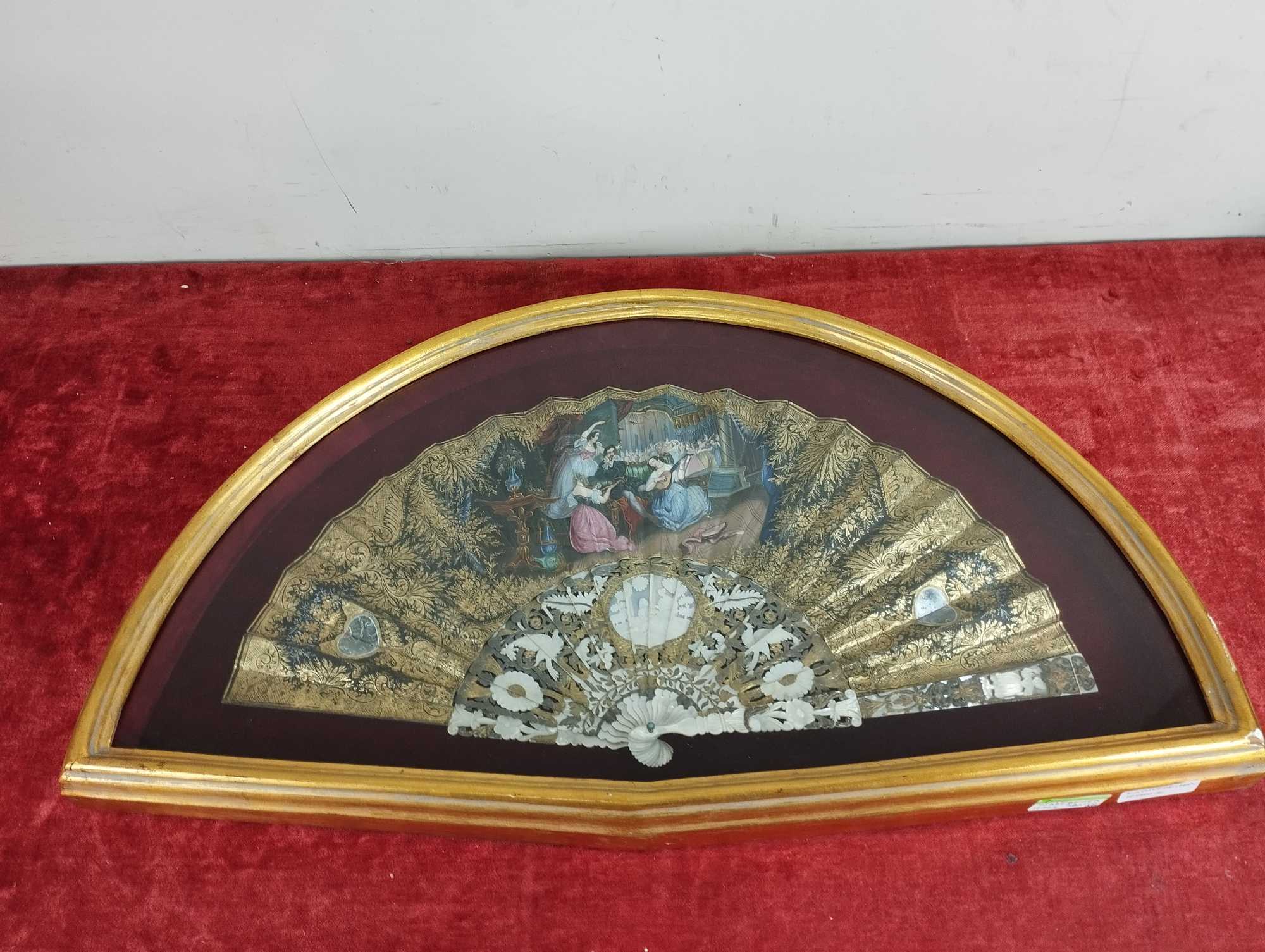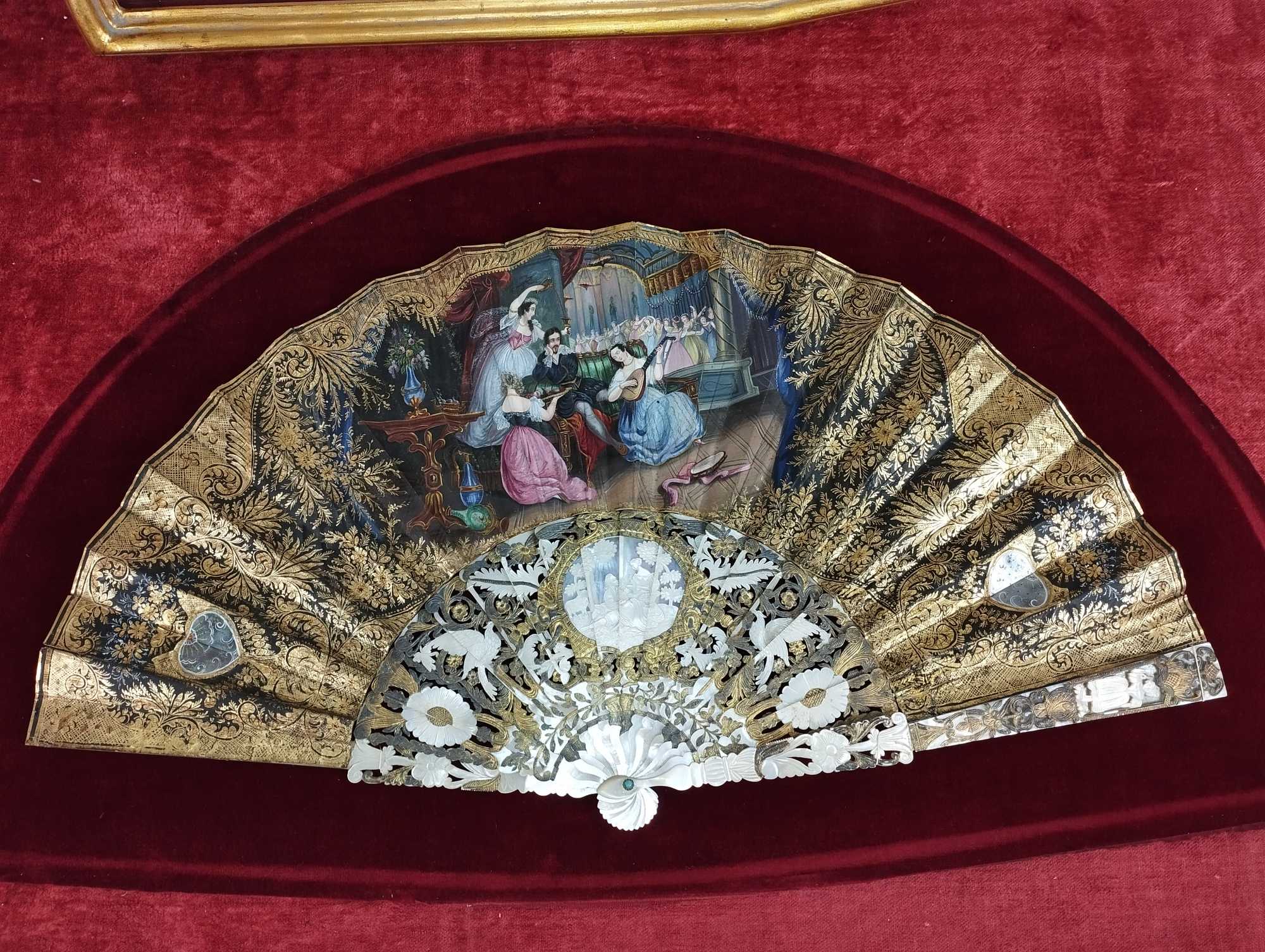 MEDIDAS APROX.CM.: MARCO: 64X38X5 TOTAL ABANICO; 51X27.5 PAISAJE: 13.8 ALTURA VARILLAS EN NÁCAR TALLADO Y PINTADO A MANO. NO VEMOS PARTES FALTANTES. PAISAJE EN PAPEL PINTADO A MANO. SIN PARTES FALTANTES. CON ALGUNOS RASGADOS EN LOS PLIEGUES. MARCO EN MADERA DORADA. CON RALLADOS GENERALES. RESEÑA HISTÓRICA: Los abanicos españoles tienen una larga y fascinante historia que se remonta a varios siglos atrás. Su origen se encuentra en la cultura española y se ha convertido en un símbolo icónico de la elegancia y la tradición española. A continuación, te proporciono una breve historia sobre el origen de los abanicos españoles: Origen medieval: Los abanicos tienen sus raíces en la Edad Media, cuando se utilizaban como un objeto funcional para abanicarse y combatir el calor en las regiones calurosas de España. Inicialmente, estos abanicos eran simples, hechos de materiales naturales como hojas de palma o madera. Siglo XVI: Durante el Renacimiento, los abanicos comenzaron a evolucionar hacia objetos más decorativos y artísticos. Fueron muy populares entre la nobleza española y se convirtieron en un accesorio de moda importante. Siglo XVII: En el siglo XVII, los abanicos experimentaron un auge en la producción y la ornamentación. Las hojas de los abanicos se decoraban con pinturas, bordados y detalles en oro y plata. Se convirtieron en un elemento esencial en la etiqueta de la corte española, utilizados tanto por hombres como por mujeres. Siglo XVIII: Durante el siglo XVIII, la fabricación de abanicos se profesionalizó aún más, y se crearon talleres especializados en su producción. Estos talleres producían abanicos de alta calidad, a menudo hechos de marfil, nácar y seda, y eran considerados verdaderas obras de arte. Expansión internacional: La popularidad de los abanicos españoles trascendió las fronteras de España y se convirtieron en un símbolo de la cultura española en todo el mundo. Fueron muy demandados en otras cortes europeas y se exportaron a América y Asia. Siglo XIX y XX: A lo largo de los siglos XIX y XX, los abanicos siguieron siendo un accesorio de moda importante en la sociedad española. Sin embargo, su popularidad comenzó a declinar con la llegada de la refrigeración moderna y el aire acondicionado, ya que la necesidad de abanicarse para combatir el calor disminuyó.