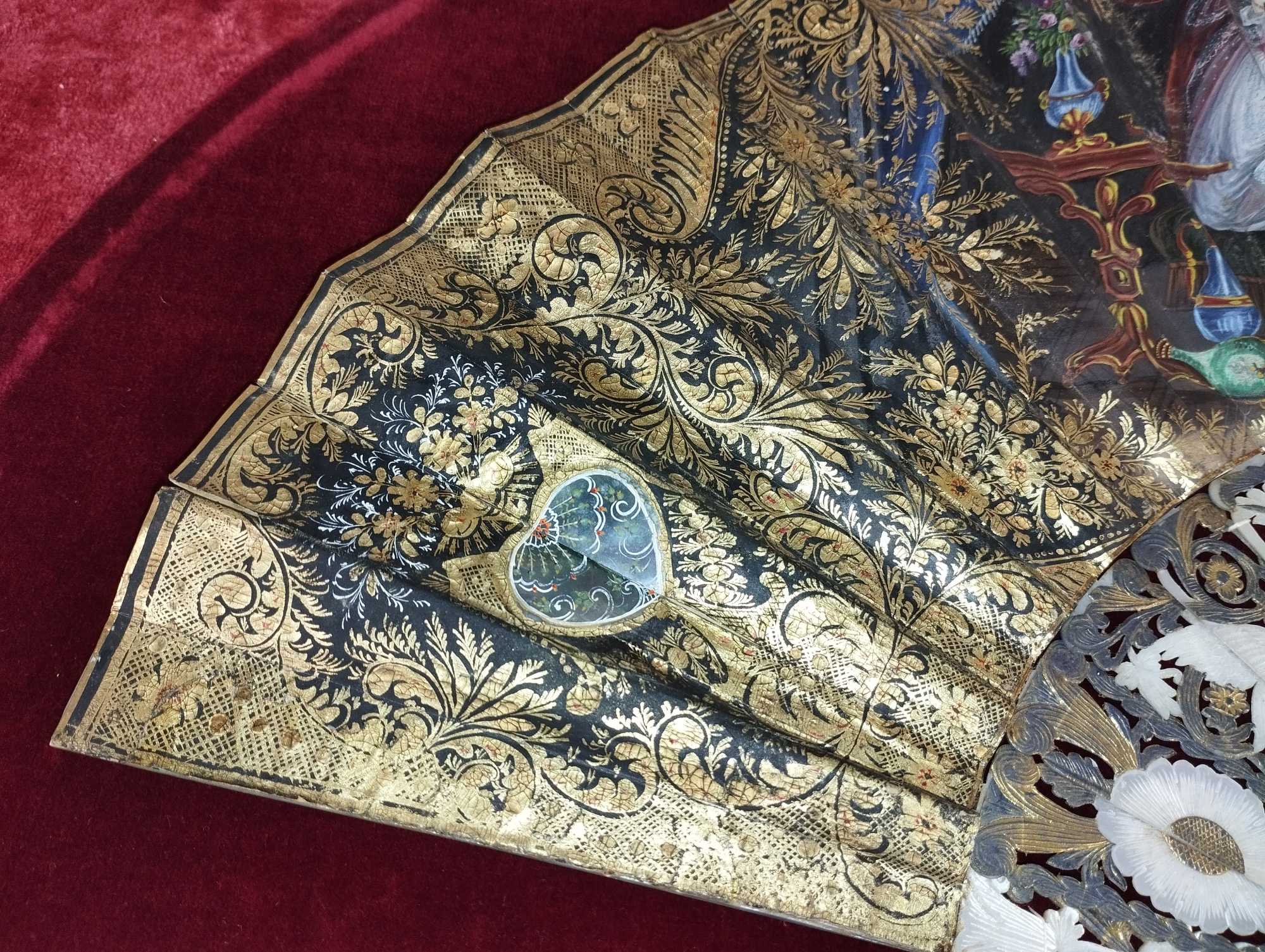 ANTIGUO ABANICO DE DAMA. NÁCAR TALLADO. PAPEL PINTADO A MANO. ESPAÑA. SIGLO XIX