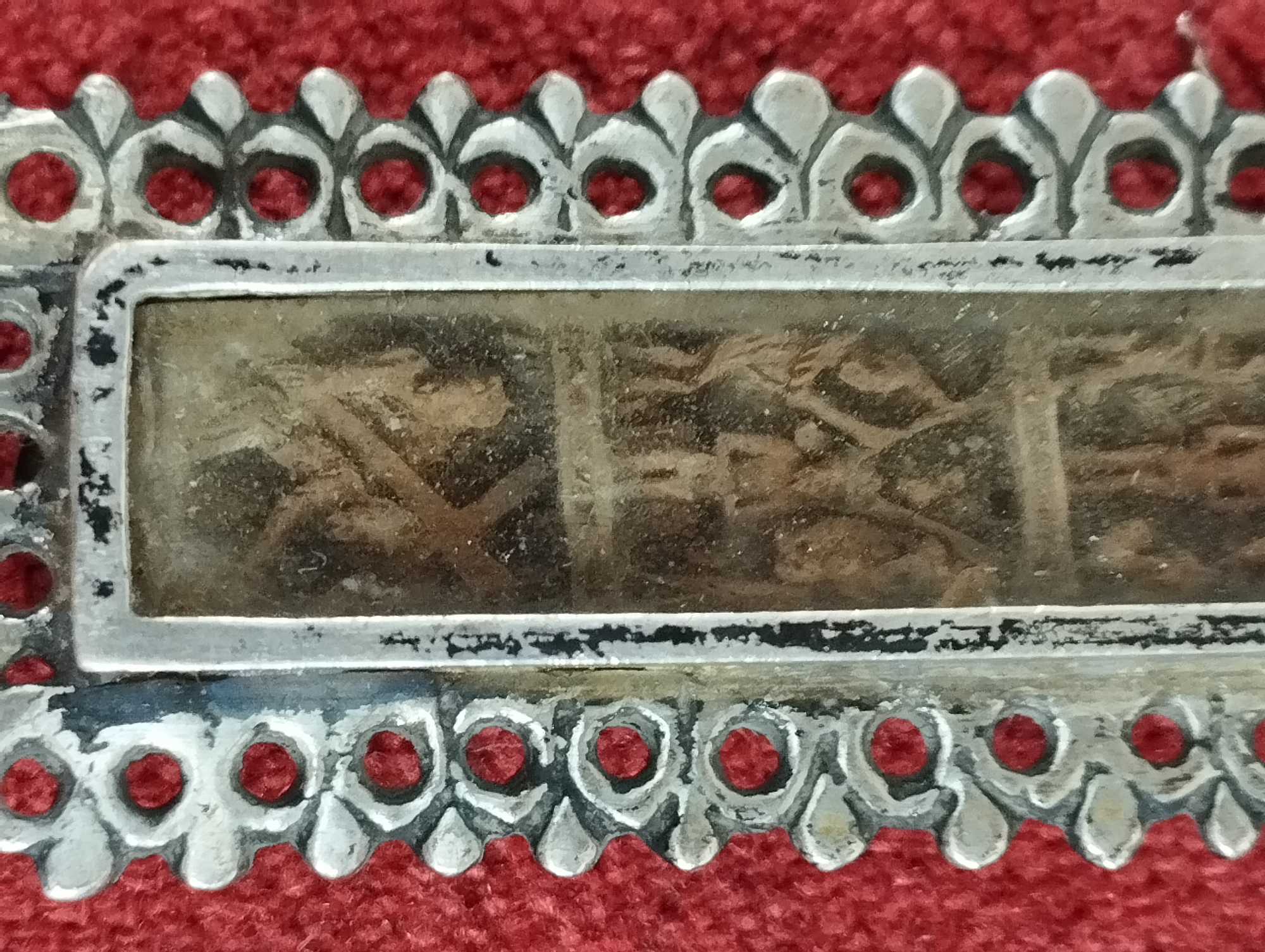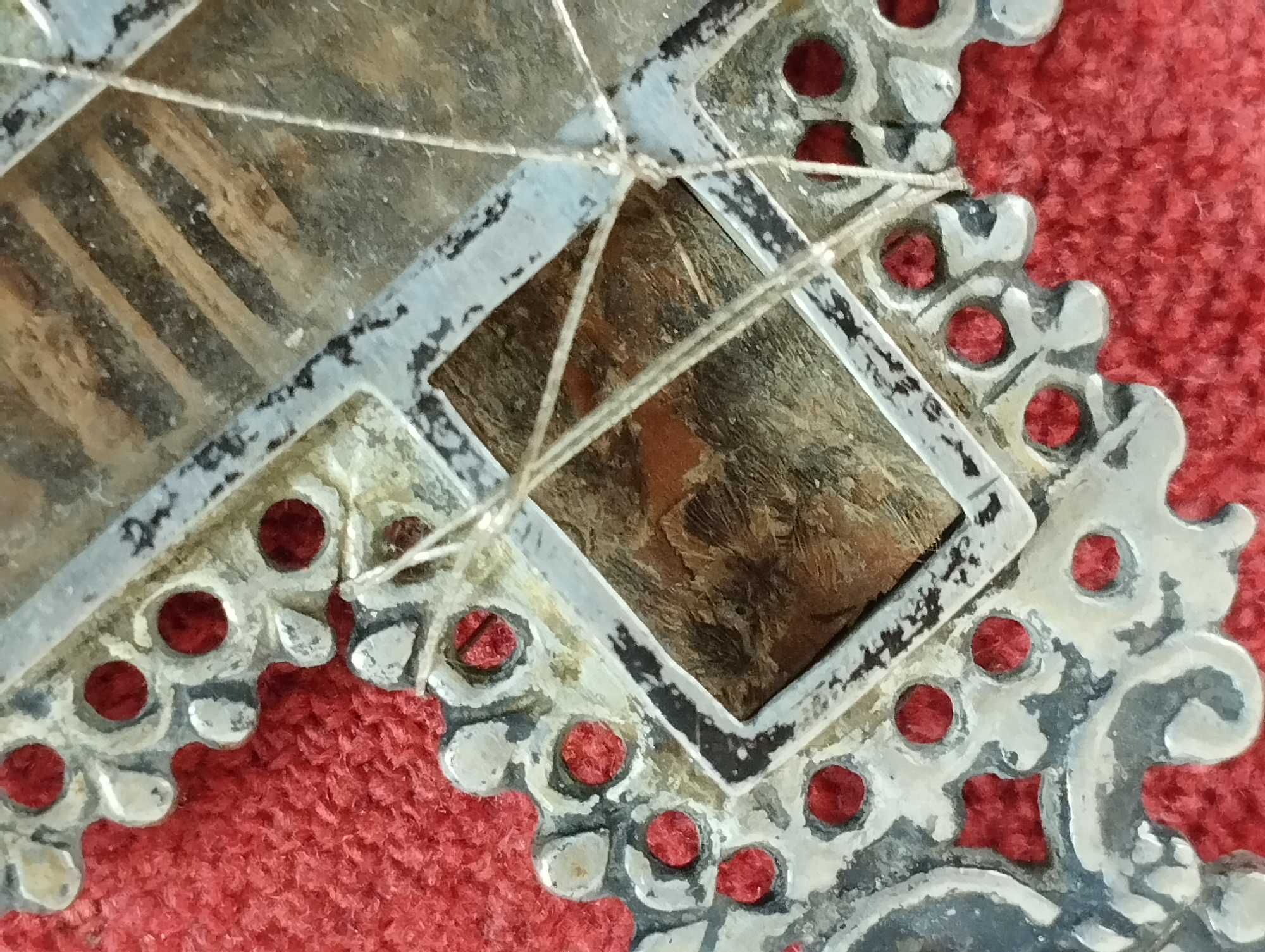 MEDIDAS APROX. CM.: TOTAL ROSARIO: 70 CUENTAS: 1.5 Y 2 CRUZ: 7.2 LONGITUD CRUZ EN PLATA CINCELADA. SIN PUNZONES APARENTES DE AUTOR NI FABRICA. CON CRISTAL PROTECTOR. TODA RELIGADA CON ALAMBRE DE PLATA. EL INTERIOR CON ESCENAS DEL VIA CRUCIS. PARECE TRATARSE DE MADERA TALLADA, PERO NO LO PODEMOS ASEGURAR. FALTAN ALGUNAS ESCENAS. COMPROBAR LAS IMÁGENES. LAS CUENTAS EN CRISTAL TALLADO DE GRAN BRILLO. NO FALTA NINGUNA CUENTA. EN GENERAL, CON EROSIONES POR EL USO, CON MANCHAS GENERALES DE POLVO Y SUCIEDAD.