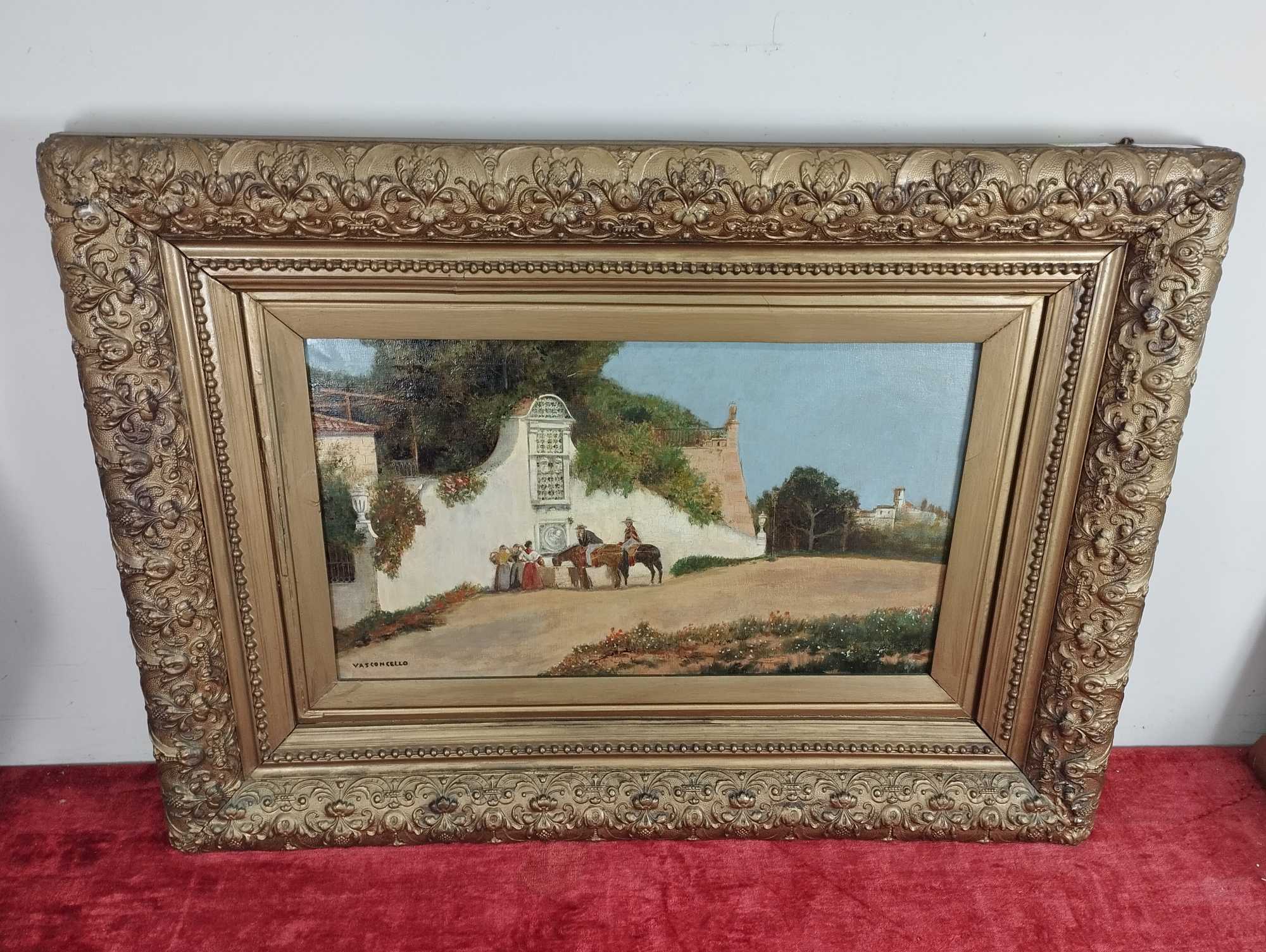 MEDIDAS APROX. CM.: EXT MARCO: 76X55 SÓLO PINTURA: 48X28 BUEN ESTADO GENERAL. SIN RASGADOS NI PÉRDIDAS EN LA PINTURA. LEVES EROSIONES GENERALES. MANCHAS GENERALES DE POLVO Y SUCIEDAD. MARCO EN MADERA Y ESTUCO. CON EROSIONES Y RASCADOS GENERALES. NOTA HISTÓRICA; La pintura costumbrista andaluza es un género artístico que surgió en el siglo XIX y principios del XX en la región de Andalucía, en el sur de España. Se centró en representar la vida cotidiana, las costumbres y las tradiciones de la gente de la región, incluyendo escenas de flamenco, ferias, procesiones religiosas y actividades rurales. Varios artistas andaluces y españoles contribuyeron a este género, y sus obras documentan la cultura y la identidad de Andalucía. La pintura costumbrista andaluza sigue siendo valorada como un importante testimonio histórico y artístico de la región.
