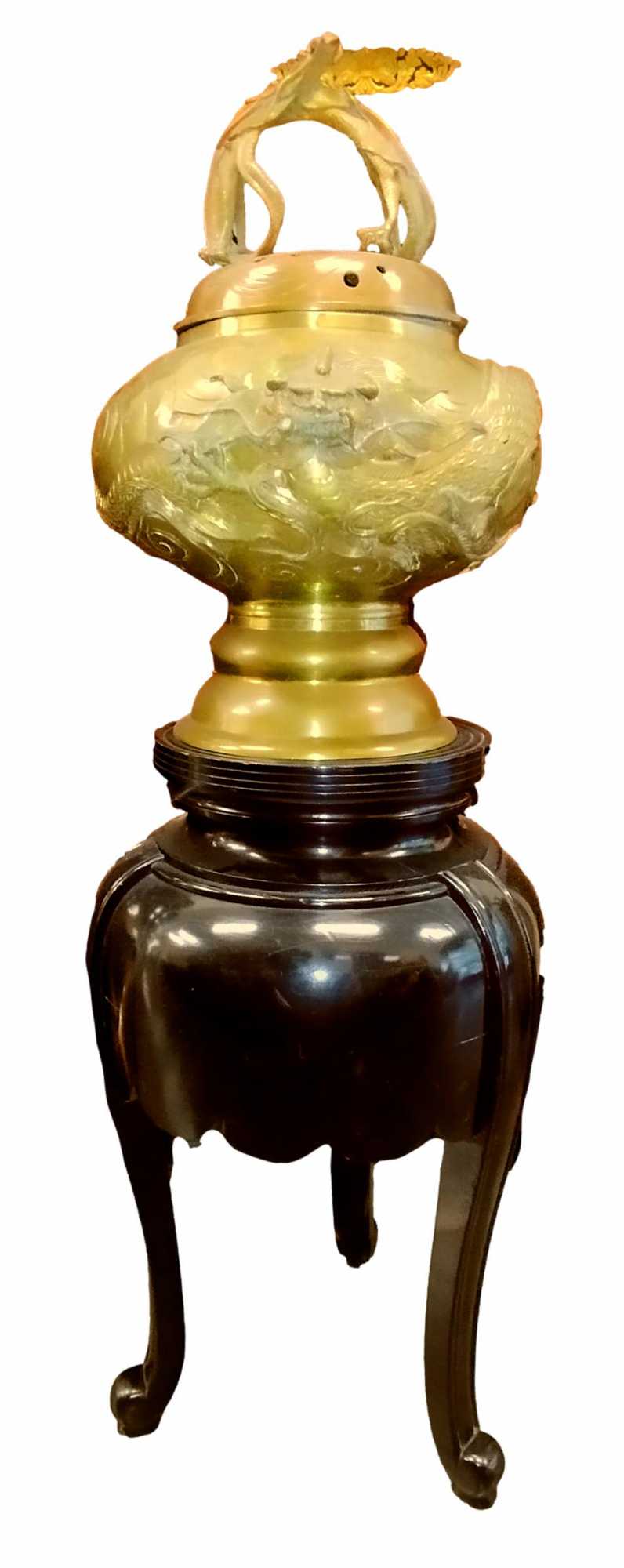 GRAN INCENSARIO CHINO DE BRONCE. CON BASE DE MADERA LACADA. CHINA- XIX-XX