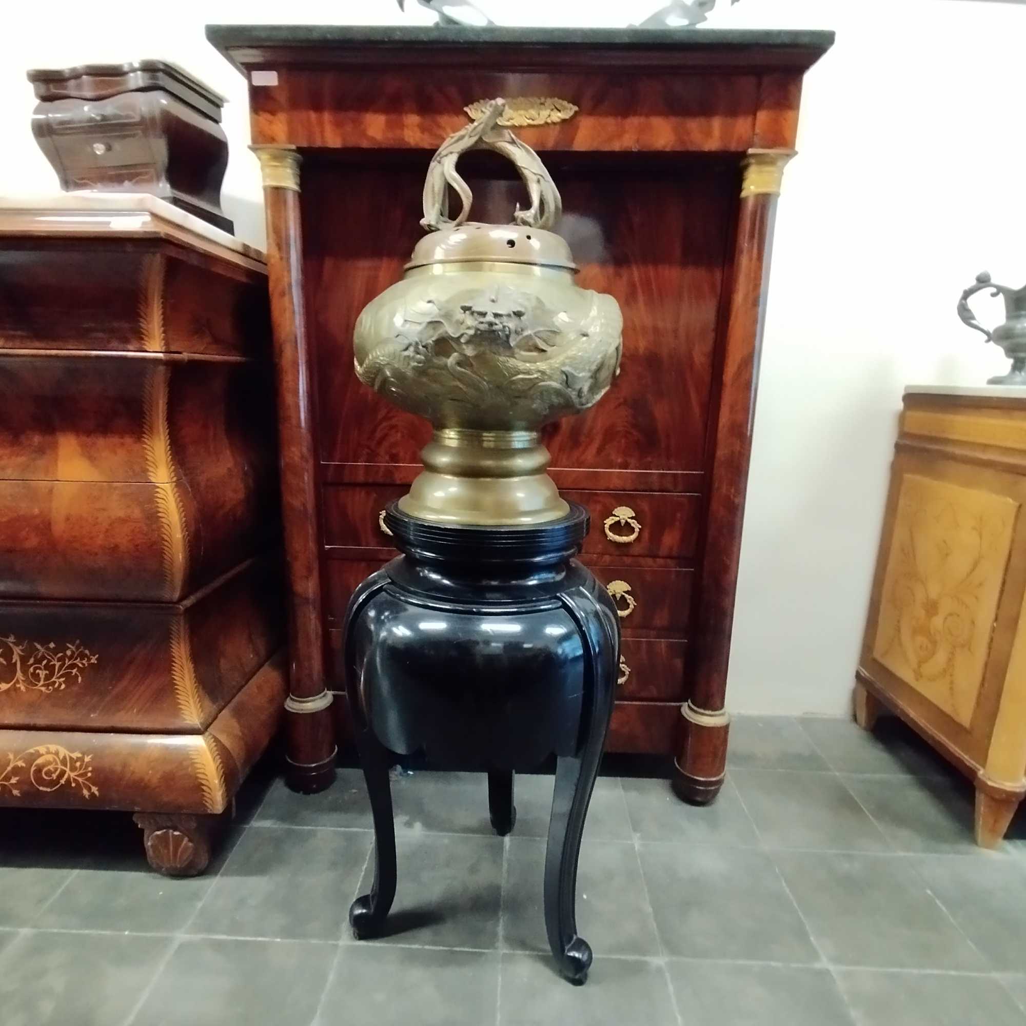 BUEN ESTADO GENERAL. INCENSARIO CON UNA ANTIGUA RESTAURACIÓN, VER IMÁGENES, CON RALLADOS, ABOLLADURAS Y EROSIONES GENERALES POR EL USO. BASE EN MADERA LACADA. SIN ROTURAS. CON EROSINES GENERALES POR EL USO. MEDIDAS APROX. CM.: SÓLO EL INCENSARIO: 37 DIAMETRO 52 ALTURA BASE MADERA LACADA: 69 ALTURA