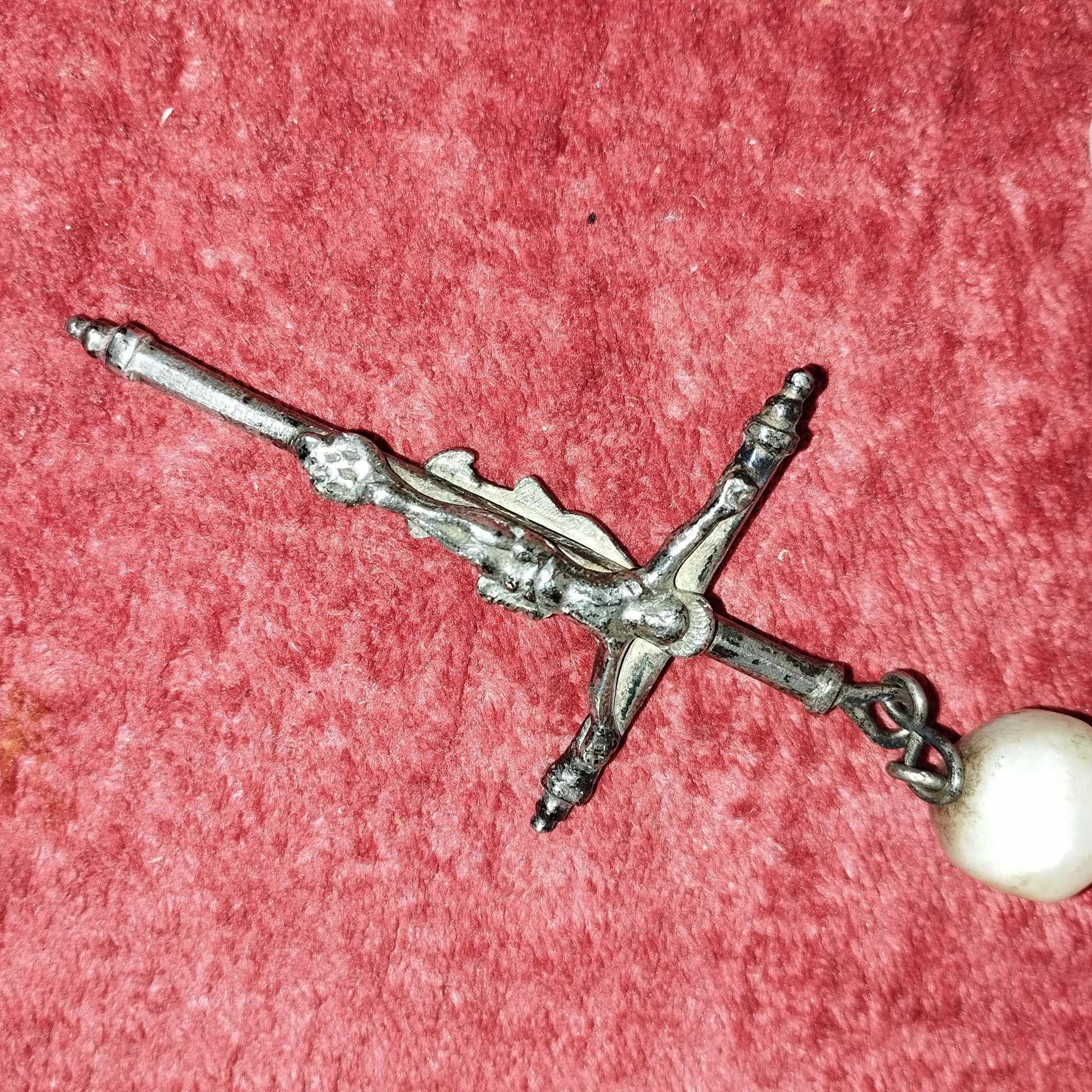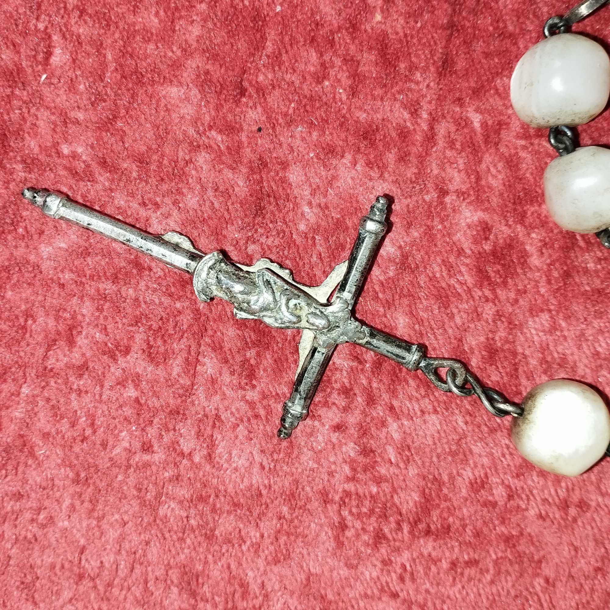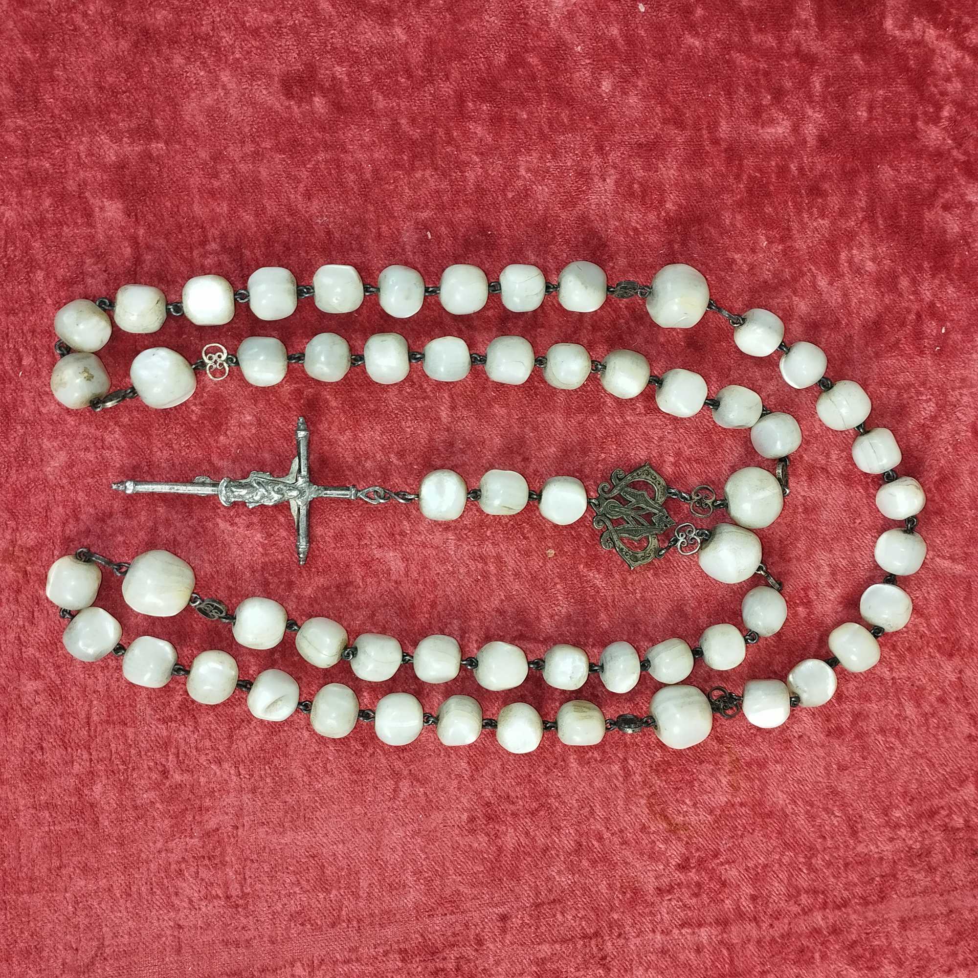BUEN ESTADO GENERAL. NO FALTA NINGUNA PARTE CON RALLADOS Y EROSIONES GENERALES POR EL USO. MANCHAS GENERALES DE POLVO Y SUCIEDAD. MEDIDAS APROX. CM.: LONGITUD TOTAL: 75 PERLAS DE NACAR GRANDES: 2 PEQUEÑAS: 1.4 ANAGRAMA MARIA: 3.5X2.5 CRUZ: 7X4.5