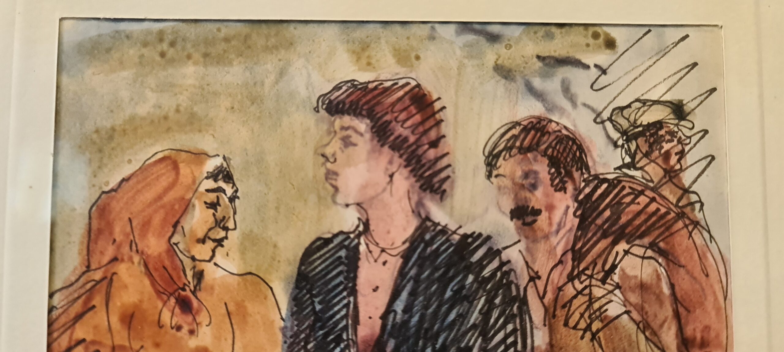 JORDI SERRA. ESCENA DE MERCADO. TECNICA MIXTA SOBRE PAPEL. SIGLO XX.