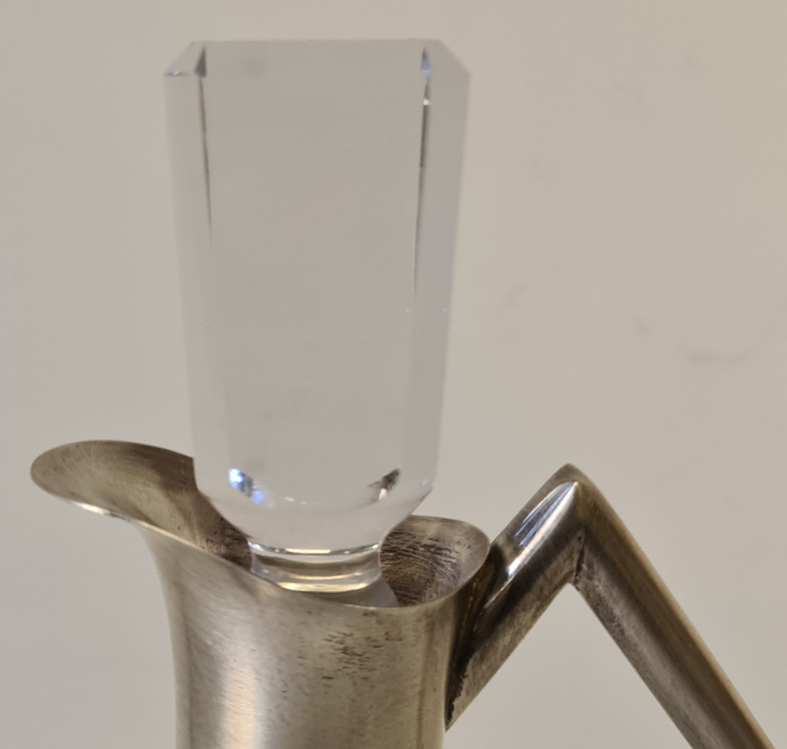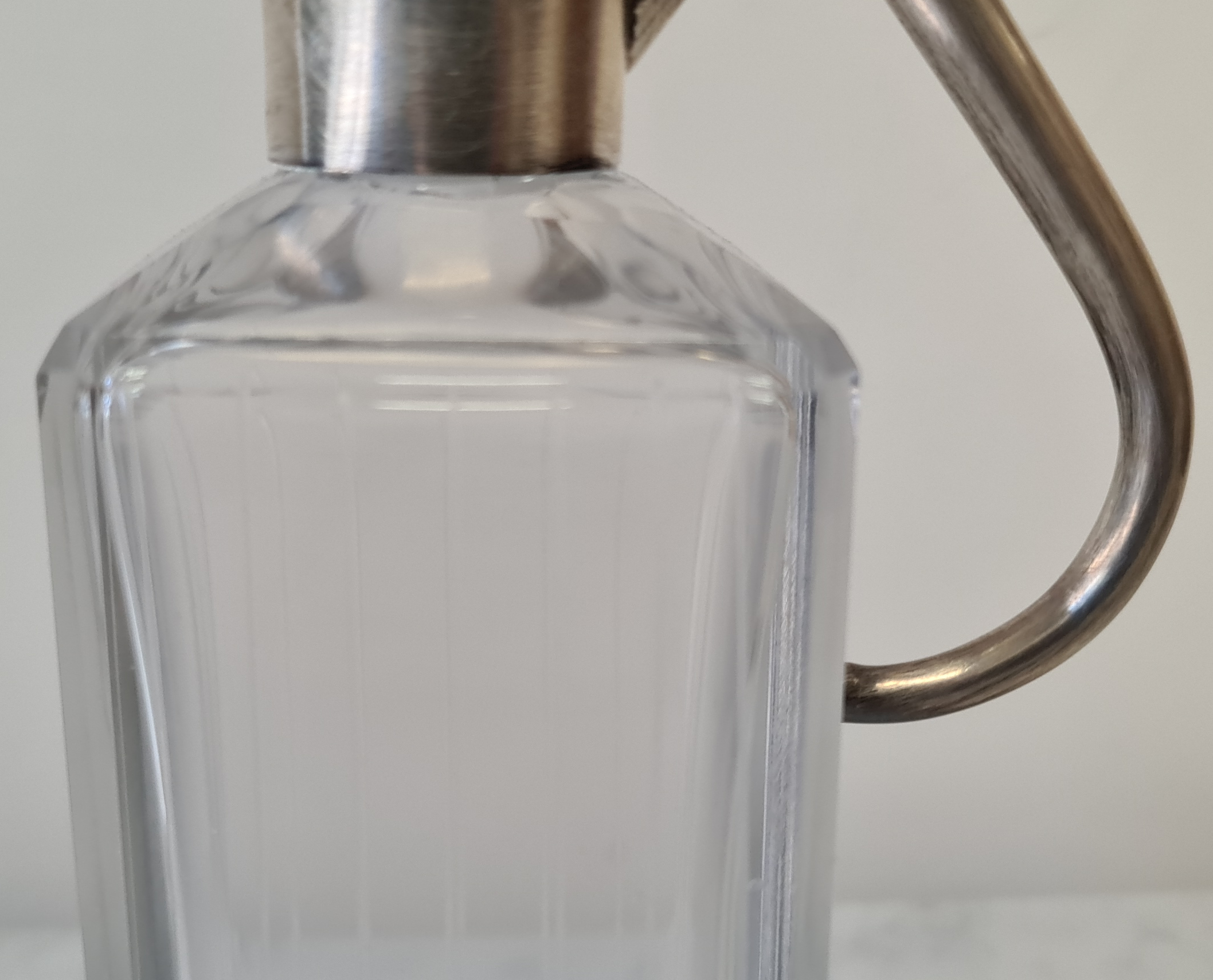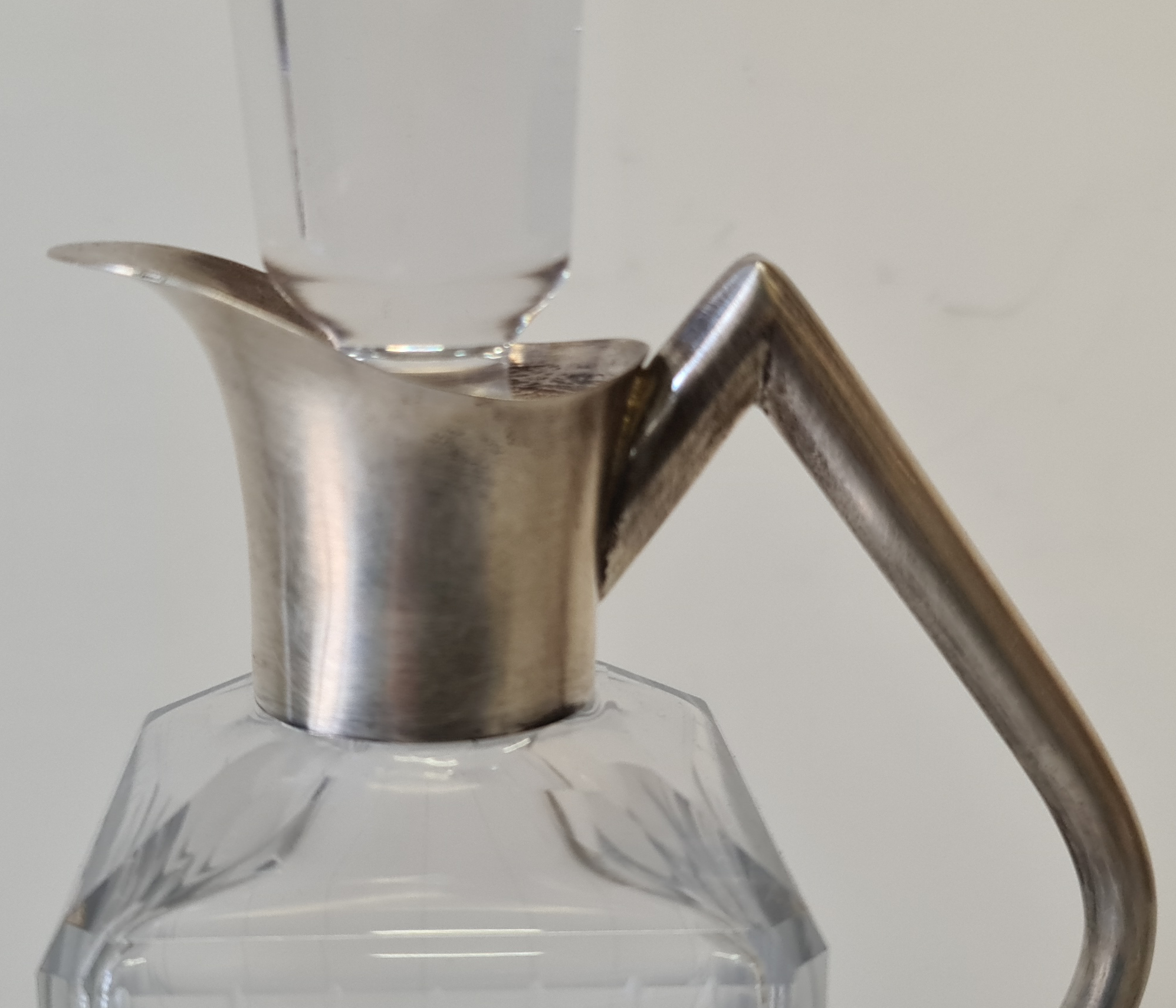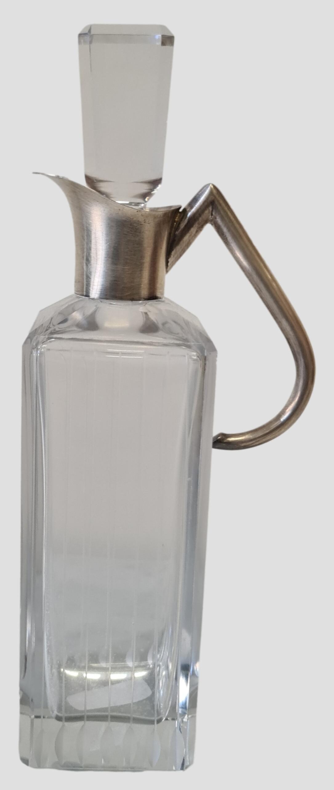 JARRA DE CRISTAL TALLADO. ASA Y CUELLO DE PLATA PUNZONADA. CIRCA 1950. JARRA DE CRISTAL TALLADO CON MOTIVOS GEOMETRICOS. TAPON EN CRISTAL FACETADO. CUELLO Y ASA EN PLATA PUNZONADA. MARCAS EN LA PARTE FRONTAL DE LA JARRA. EN LAS IMAGENES SE PUEDEN APRECIAR LOS DETALLES.