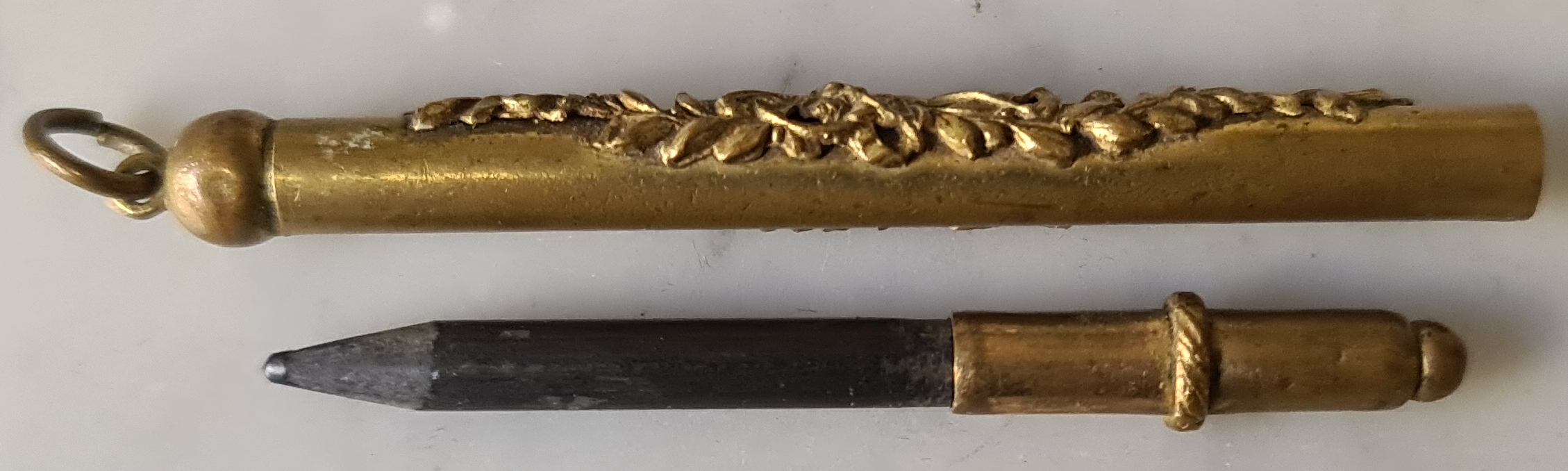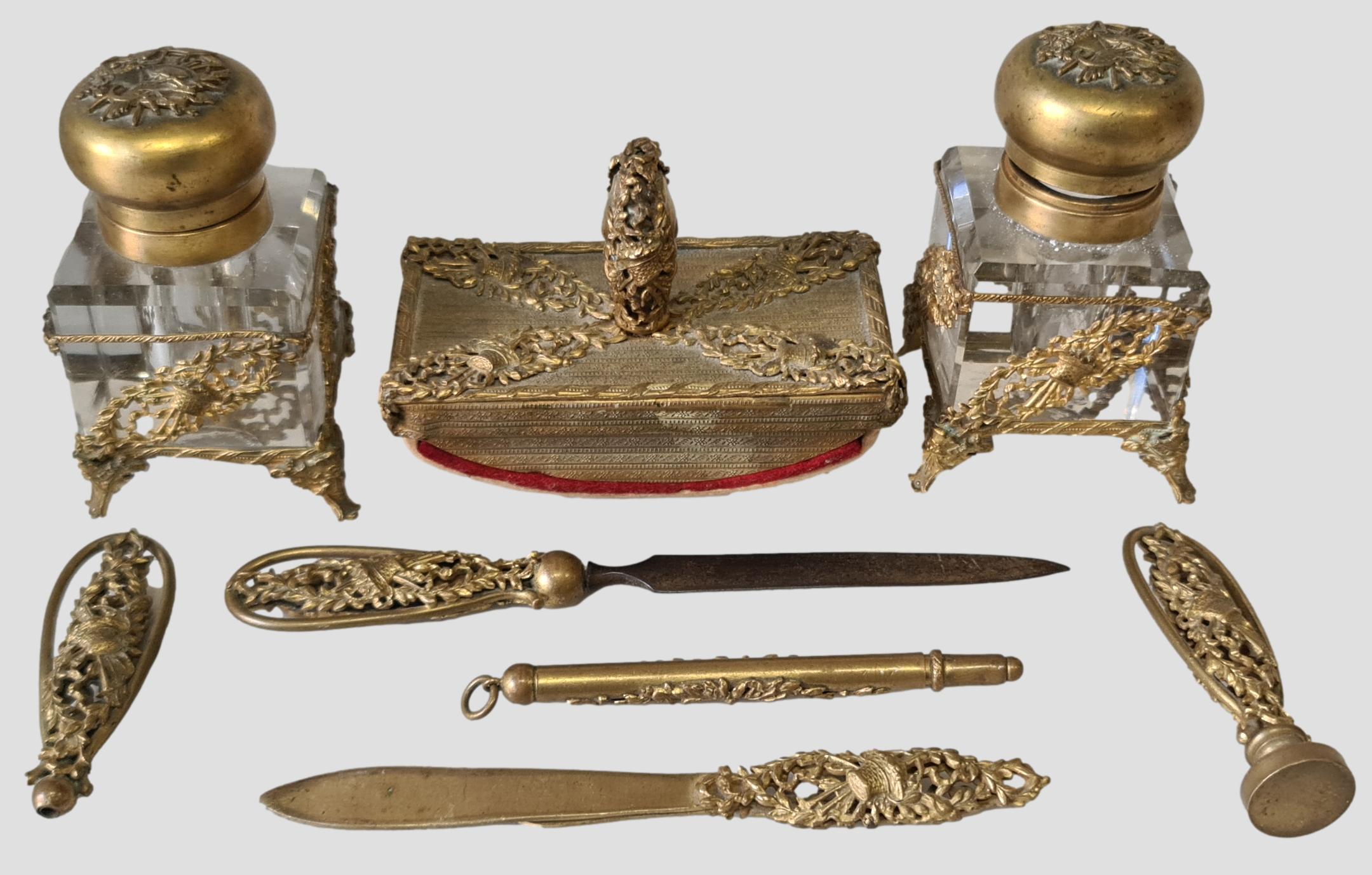 CONJUNTO DE ESCRITORIO. CRISTAL Y LATÓN. FRANCIA. SIGLO XIX. CONJUNTO DE ESCRIBANIA. LATÓN DORADO. ESTILO IMPERIO. TINTEROS DE CRISTAL FACETADO. EL CONJUNTO CONSTA DE : EMPUÑADURA DE LATÓN DORADO. EMPUÑADURA CON BASE PARA SELLOS DE LACRE. ABRECARTAS EN ACERO CON EMPUÑADURA DE LATÓN DORADO. PINZA PARA SOBRES EN LATÓN DORADO. LÁPIZ CON FUNDA DE LATÓN DORADO. SECATINTAS EN FORMA DE MEDIA LUNA. FELPA. MANGO DE LATÓN DORADO. PAREJA DE TINTEROS EN CRISTAL FACETADO CON TAPONES Y SOPORTES EN LATÓN DORADO. LAS MEDIDAS CORRESPONDEN A LOS TINTEROS. MEDIDAS DEL SECATINTAS: 11 X 6 X 8 CM. NECESITA RESTAURACION. A UNO DE LOS MANGOS LE FALTA UN UTENSILIO. EL ABRECARTAS NECESITA PULIDO. LA FELPA DEL SECATINTAS PRESENTA FALTAS. UNO DE LOS TINTEROS PRESENTA EL TAPON DESPRENDIDO. EL METAL NECESITA LIMPIEZA. EN LAS IMAGENES SE PUEDEN APRECIAR LOS DETALLES.