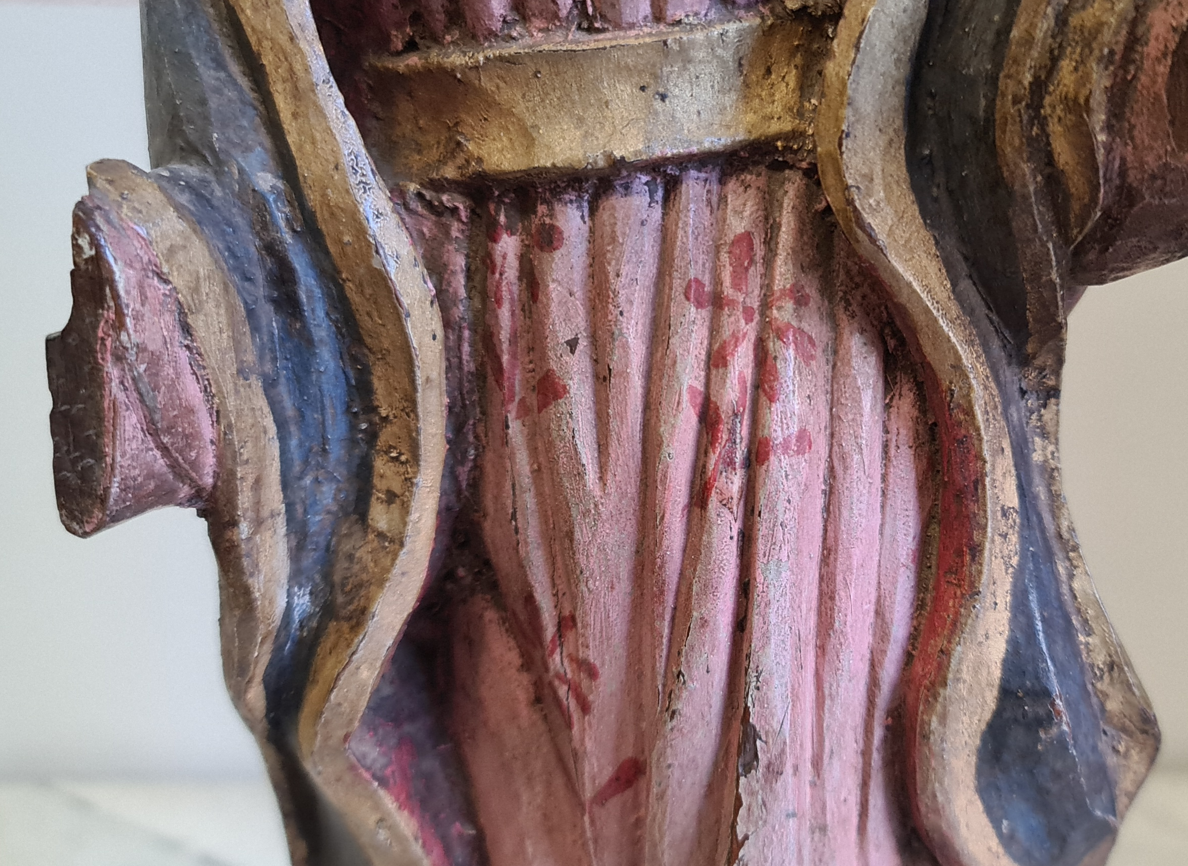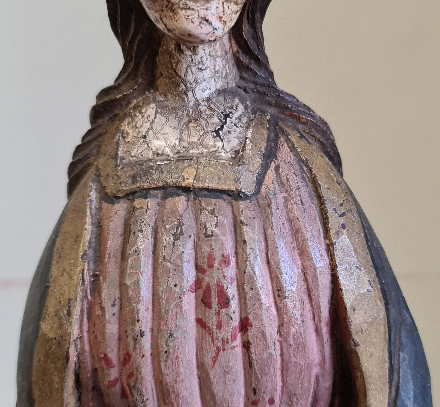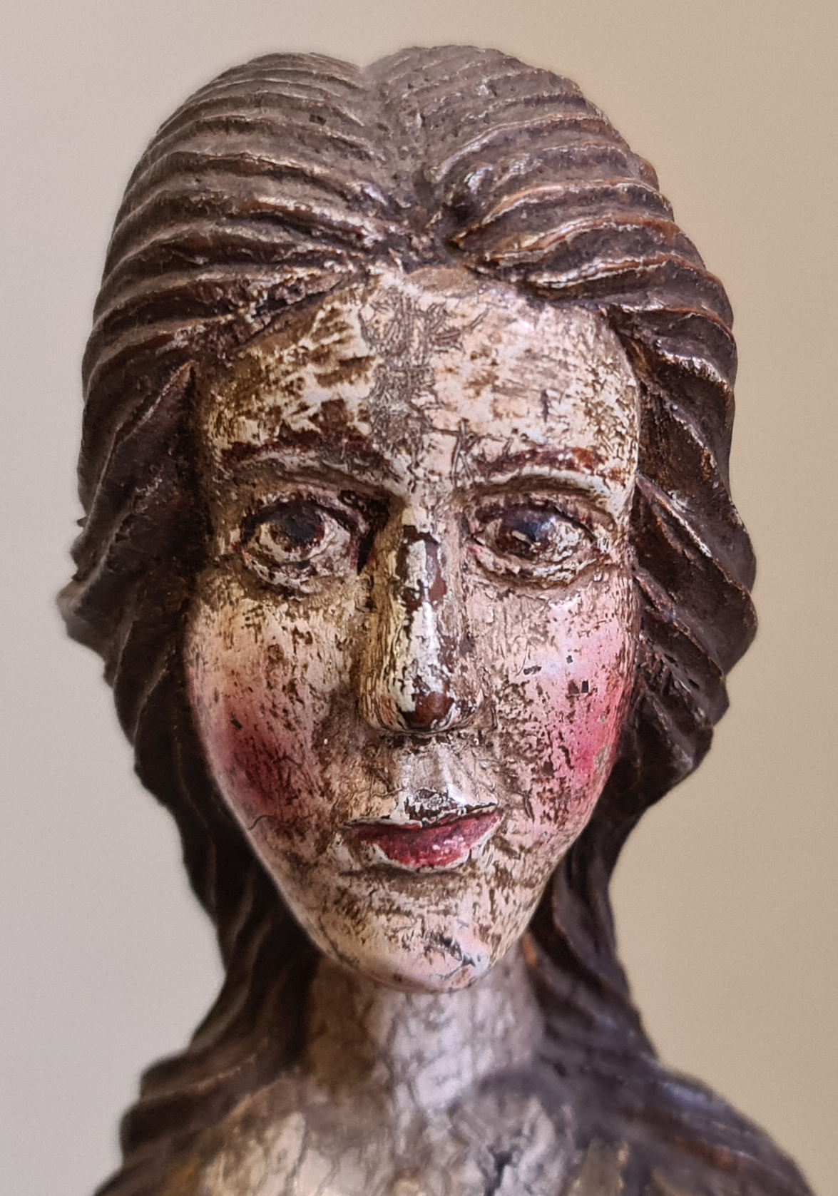 SANTA LUCIA. ESCULTURA EN MADERA TALLADA. ESCUELA GALLEGA. SIGLO XVIII-XIX. Santa Lucía de Siracusa vivió durante el siglo III en la ciudad de Siracusa, en Sicilia (Italia). Su martirio tuvo lugar durante las persecuciones cristianas bajo el gobierno del emperador romano Diocleciano.Santa Lucía consagró su vida a Dios y decidió dedicarse a la virginidad. Cuando le propusieron un matrimonio que ella rechazó, su pretendiente la denunció ante las autoridades romanas por ser cristiana. Como resultado, fue arrestada y sometida a diversas torturas, pero se dice que no perdió la fe ni abandonó su voto de castidad. POLICROMIA ORIGINAL. ESCUELA GALLEGA. POLICROMI ORIGINAL. LA TALLA NECESITA RESTAURACION. FALTA LA MANO DERECHA DE LA TALLA. PRESENTA DESPERFECTOS EN POLICROMIA Y GRIETAS EN LA TALLA. EN LAS IMAGENES SE PUEDEN APRECIAR LOS DETALLES.