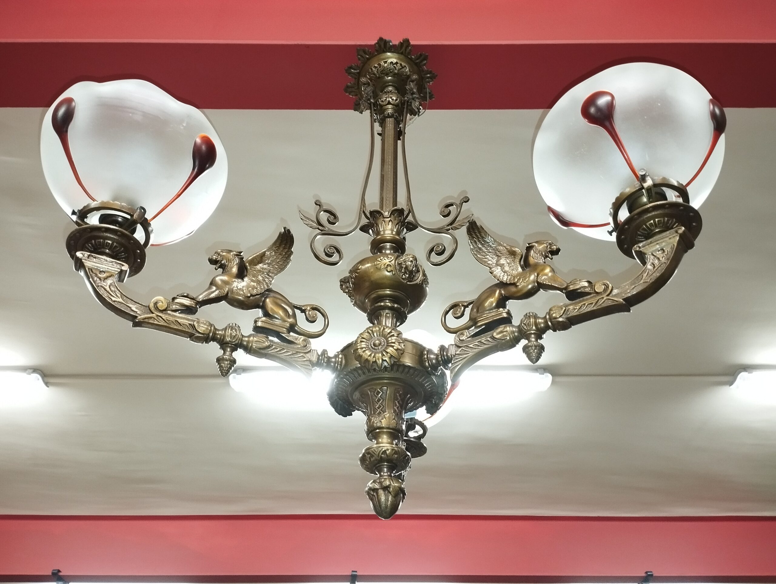 ANTIGUA LÁMPARA DE GAS. DE 3 LUCES. BRONCE. CRISTAL SOPLADO. ELECTRIFICADA. ESPAÑA. SIGLO XIX