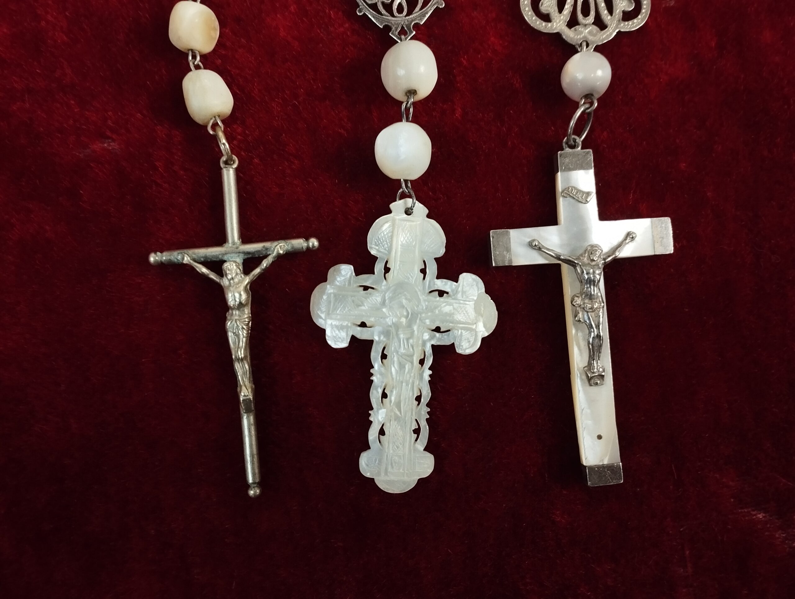 3 ANTIGUOS ROSARIOS ISABELINOS. GRANDES. PLATA Y NÁCAR. ESPAÑA. SIGLO XIX