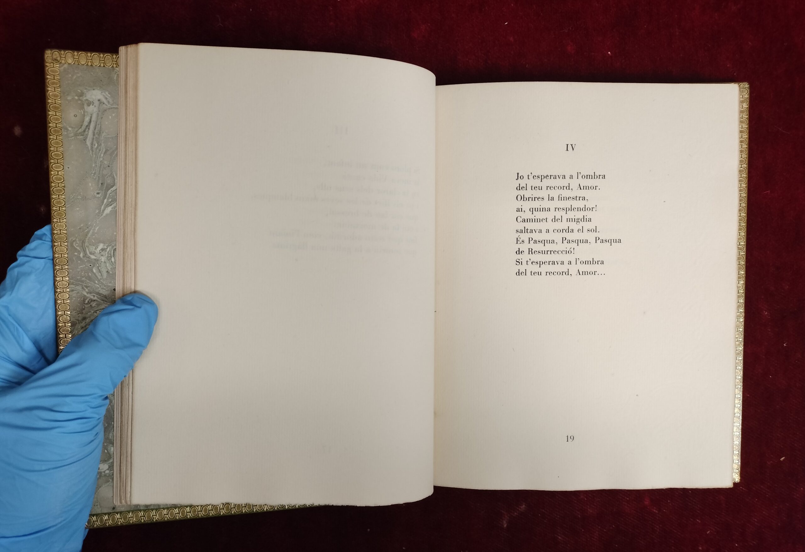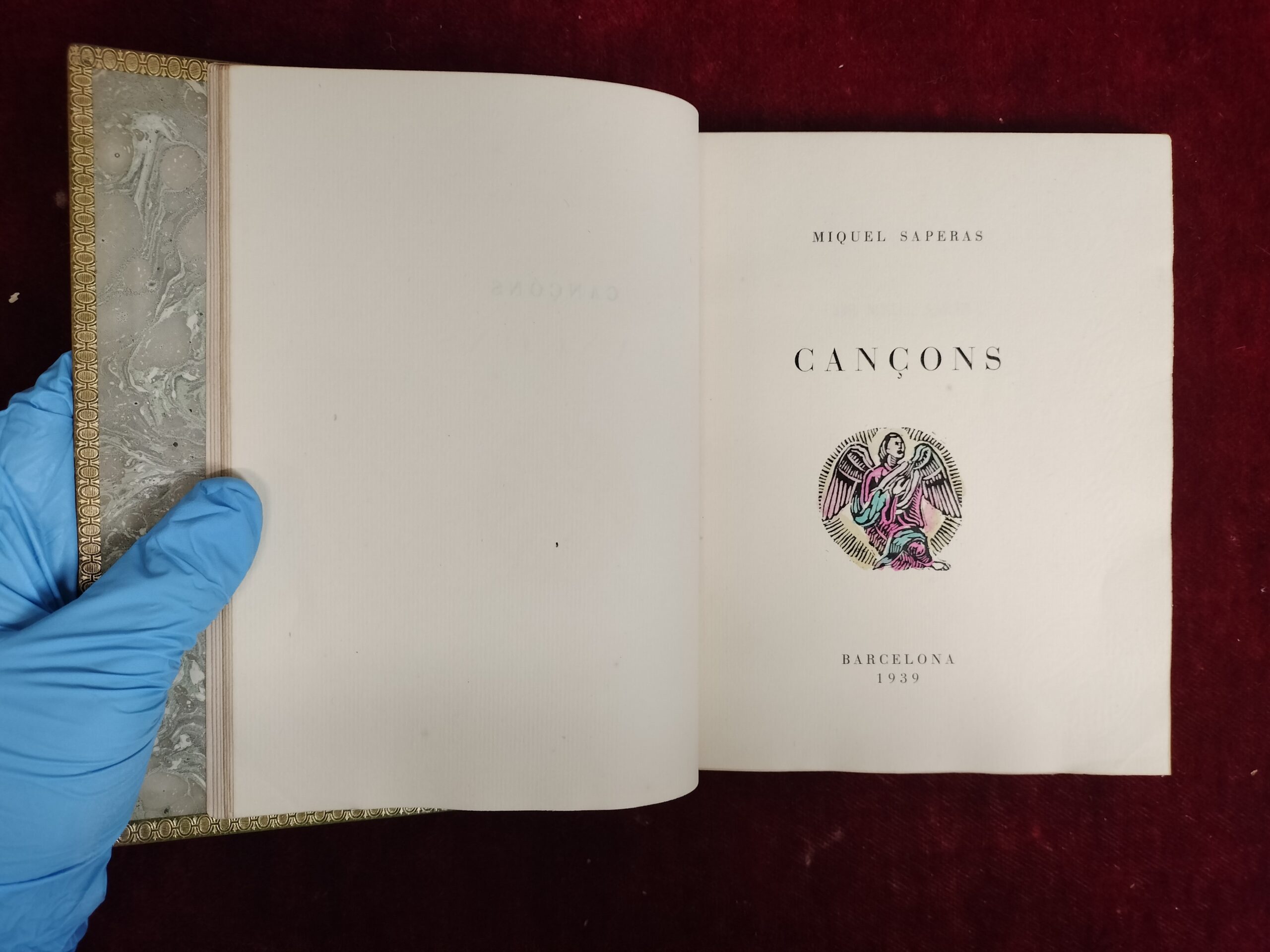 VER IMÁGENES PARA COMPROBAR EL ESTADO REAL LAS IMÁGENES FORMAN PARTE DE LA DESCRIPCIÓN MIQUEL SAPERAS. CANÇONS. BARCELONA, 1939. EN CATALÁN. ILUSTRADO CON GRABADOS, POR JOSEP MARIA NUET. EJEMPLAR NUMERADO 37. DEDICADO. 129 PÁG + ÍNDICE ENCUADERNACIÓN EN PIEL, LOMO CON NERVIOS Y DORADOS.