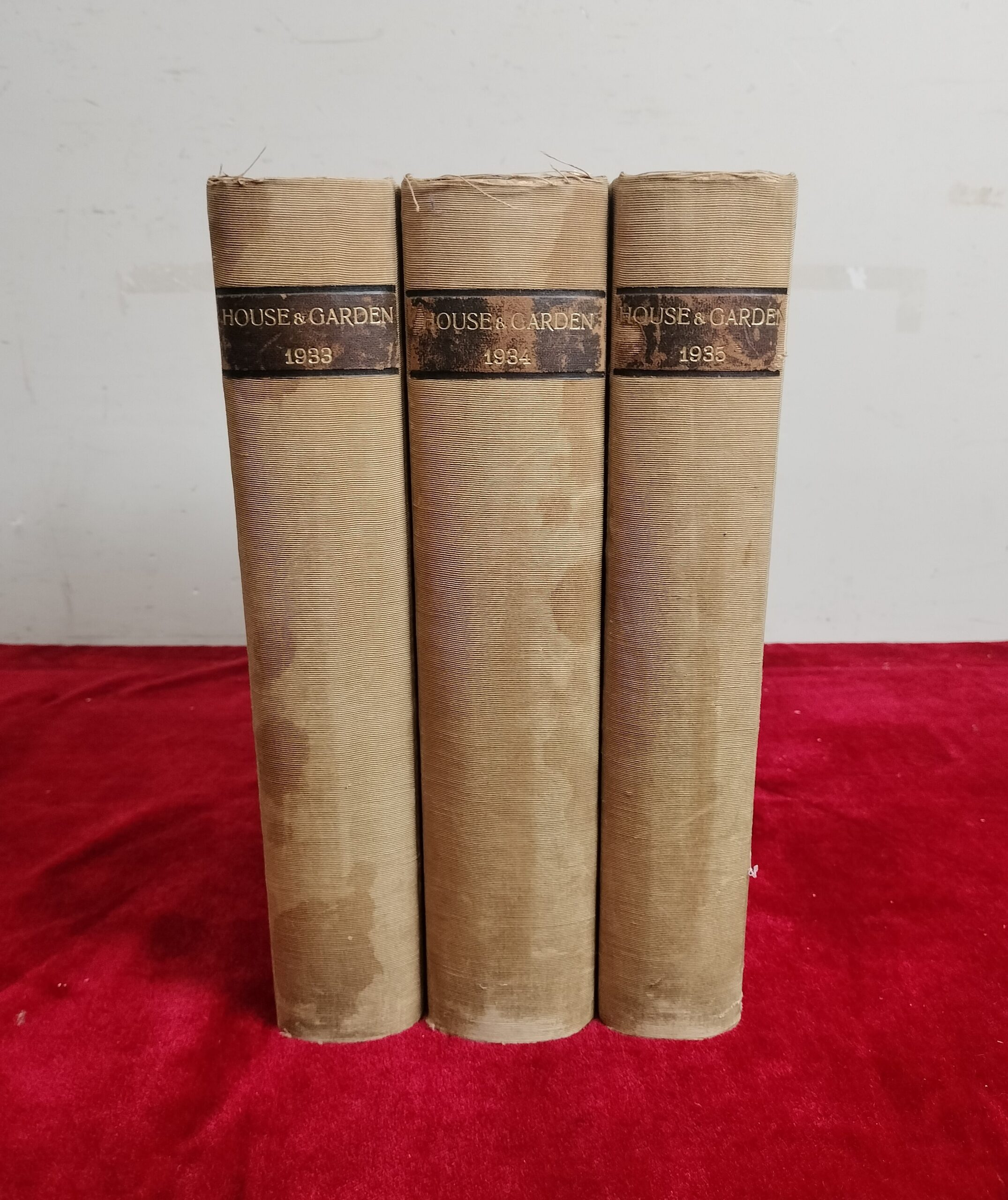 VER IMÁGENES PARA COMPROBAR EL ESTADO REAL. LAS IMÁGENES FORMAN PARTE DE LA DESCRIPCIÓN. HOUSE AND GARDEN. A CONDÉ NAST PUBLICATION. 33 NÚMEROS EN 3 VOLÚMENES ENCUADERNADOS. ENCUADERNACIÓN EN TELA EDITORIAL, CON MANCHAS Y DESGASTES DEBIDO AL TIEMPO. ILUSTRADO CON DIBUJOS, FOTOGRAFÍAS Y LÁMINAS DE PUBLICIDAD. PÁGINAS NUMERADAS. MENSUAL. INCLUYE: – VOLUMEN 1933 COMPLETO (ENERO – DICIEMBRE). – VOLUMEN 1934: FEBRERO, MARZO, ABRIL, MAYO, JUNIO, JULIO, AGOSTO, SEPTIEMBRE, OCTUBRE, NOVIEMBRE (SIN FRONTISPICIO), DICIEMBRE (SIN FRONTISPICIO Y SIN LAS NUEVE PRIMERAS PÁGINAS; EN LA PÁGINA 89 PASA A SER EL NÚMERO DE MAYO DE NUEVO). – VOLUMEN 1935: ENERO, FEBRERO, ABRIL, MAYO, JUNIO, JULIO, AGOSTO, OCTUBRE, NOVIEMBRE (SIN FRONTISPICIO Y SIN LAS 4 PRIMERAS PÁGINAS), DICIEMBRE. ENCUADERNACIÓN FATIGADA. PRESENTA ALGUNOS RESTOS DE HUMEDAD Y ROTURAS EN ALGUNAS PÁGINAS. VER IMÁGENES. FALTAN ALGUNAS PÁGINAS Y FRONTISPICIOS.
