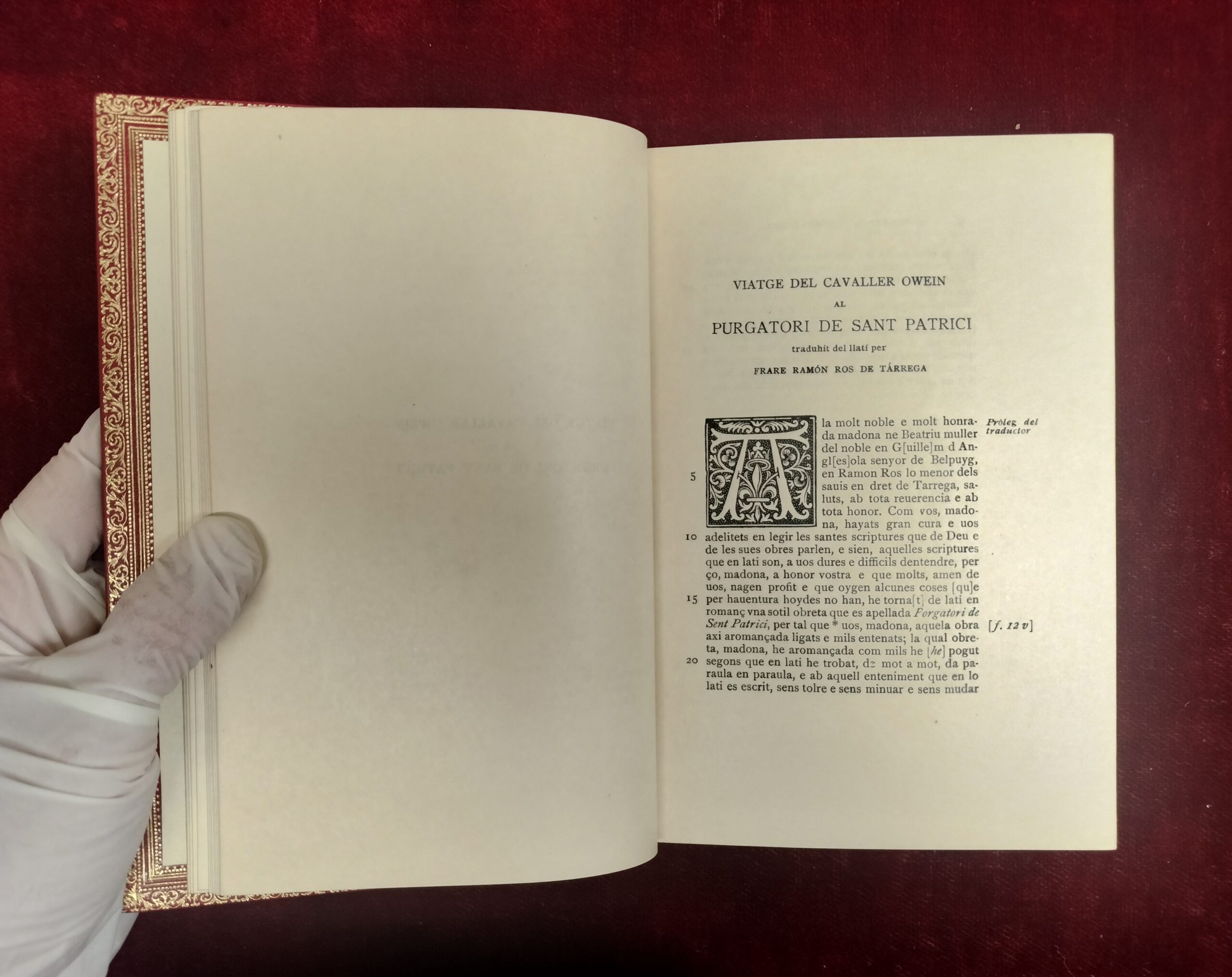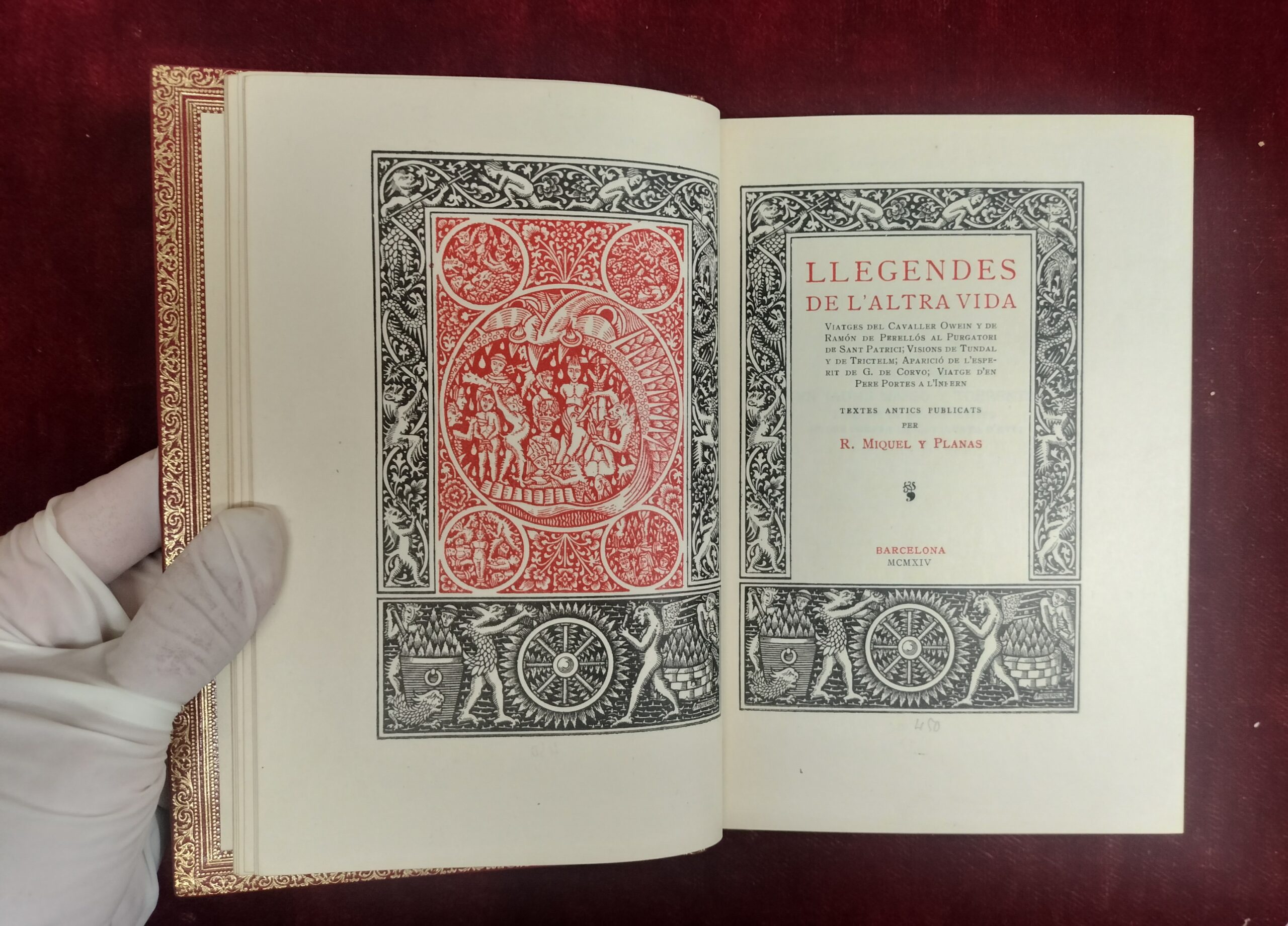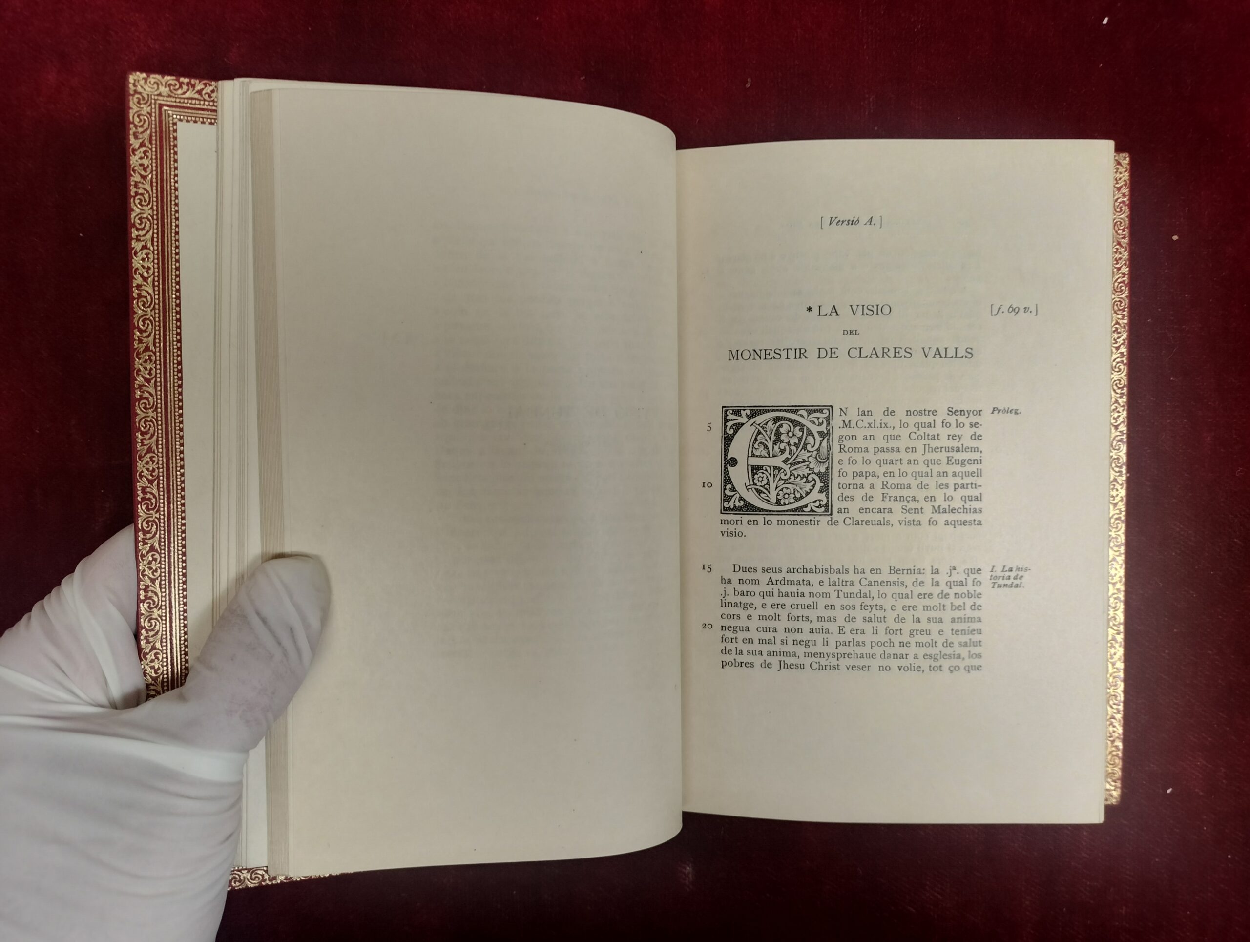 VER LAS IMÁGENES PARA COMPROBAR EL ESTADO REAL. EXQUISITA ENCUADERNACIÓN EN PIEL, CON DORADOS. LOMO CON NERVIOS. CANTOS DORADOS. SOBRECUBIERTA DECORADA AL AGUA, CON LIGEROS DESGASTES. PÁGINAS NUMERADAS. INCLUYE: VIATGES DEL CAVALLER OWEIN Y DE RAMÓN DE PERELLÓS AL PURGATORI; VISIONS DE TUNDAL Y DE TRICTELM; APARICIÓ DE L’ESPERIT DE G. DE CORVO; VIATGE D’EN PERE PORTES A L’INFERN. BIBLIOTECA CATALANA. ESTAMPA FIDEL GIRÓ 362 PÁG