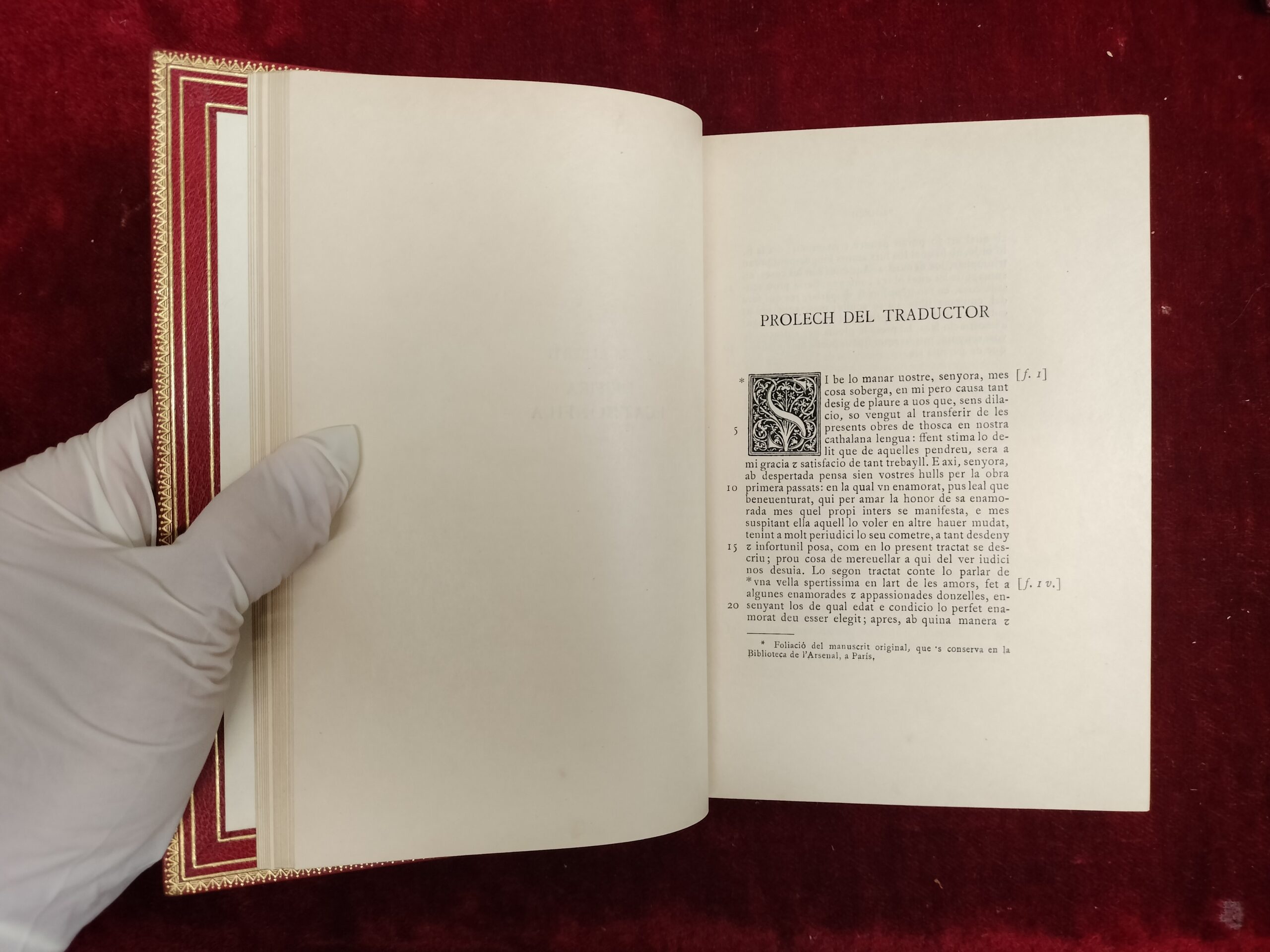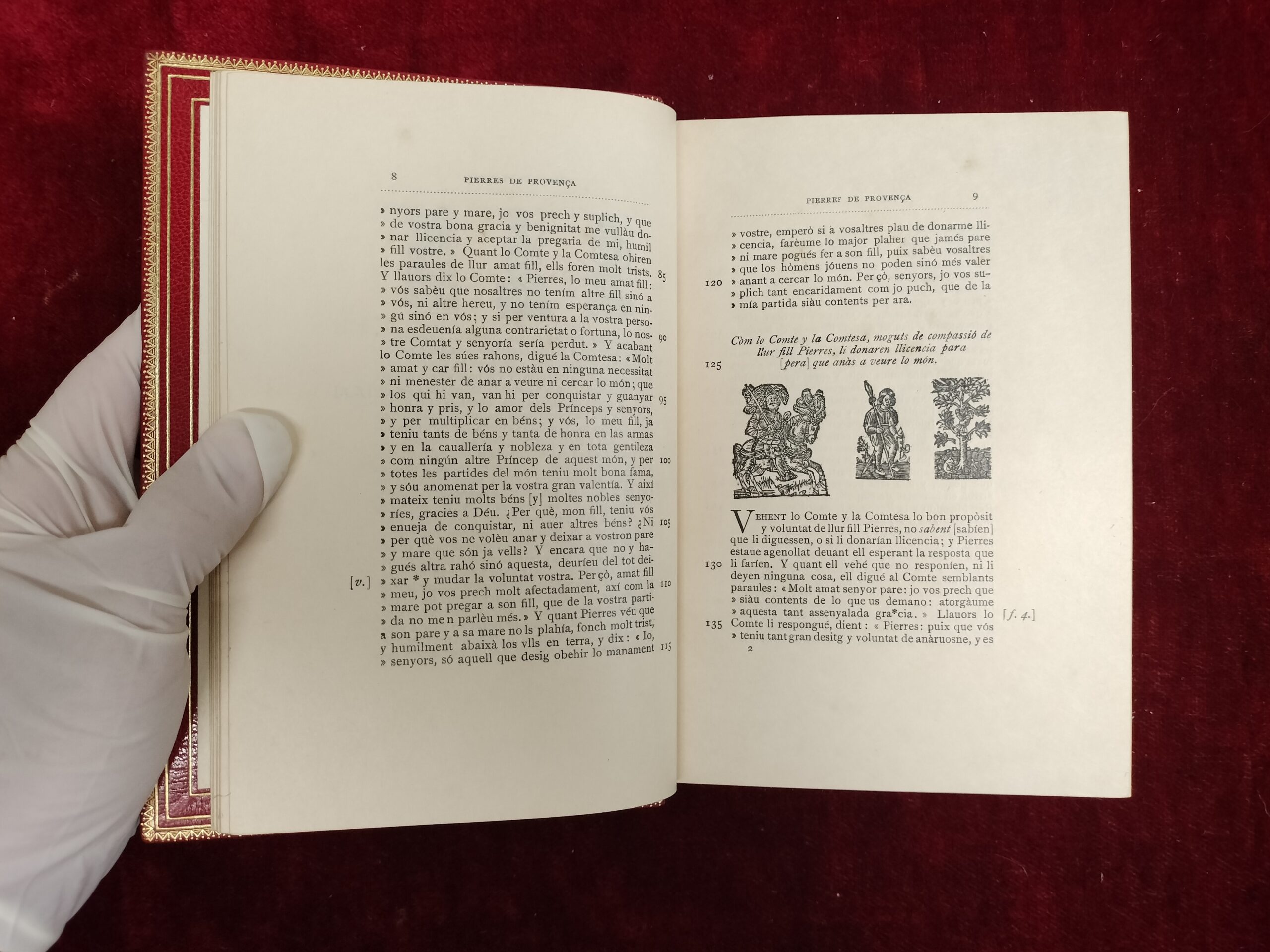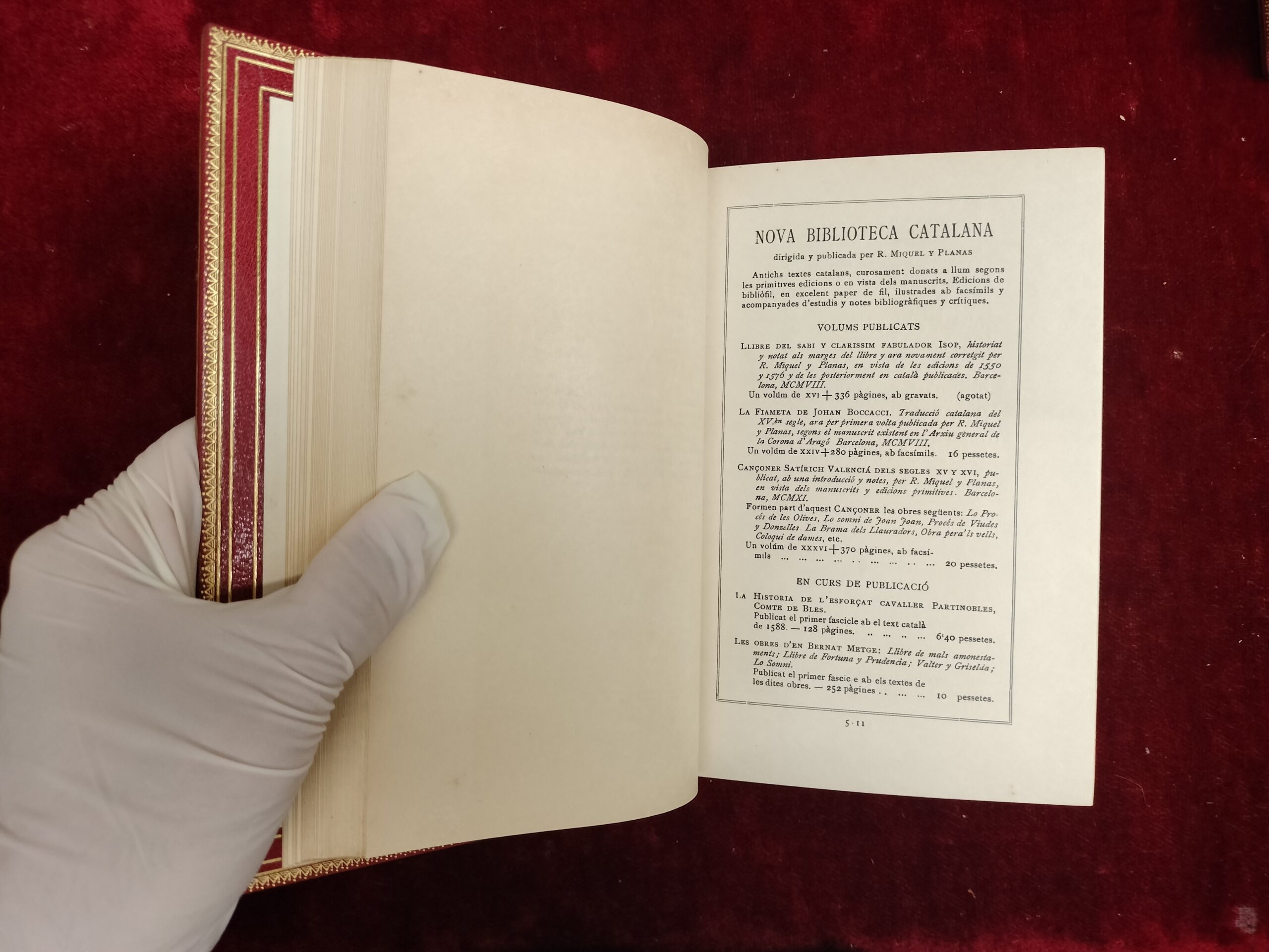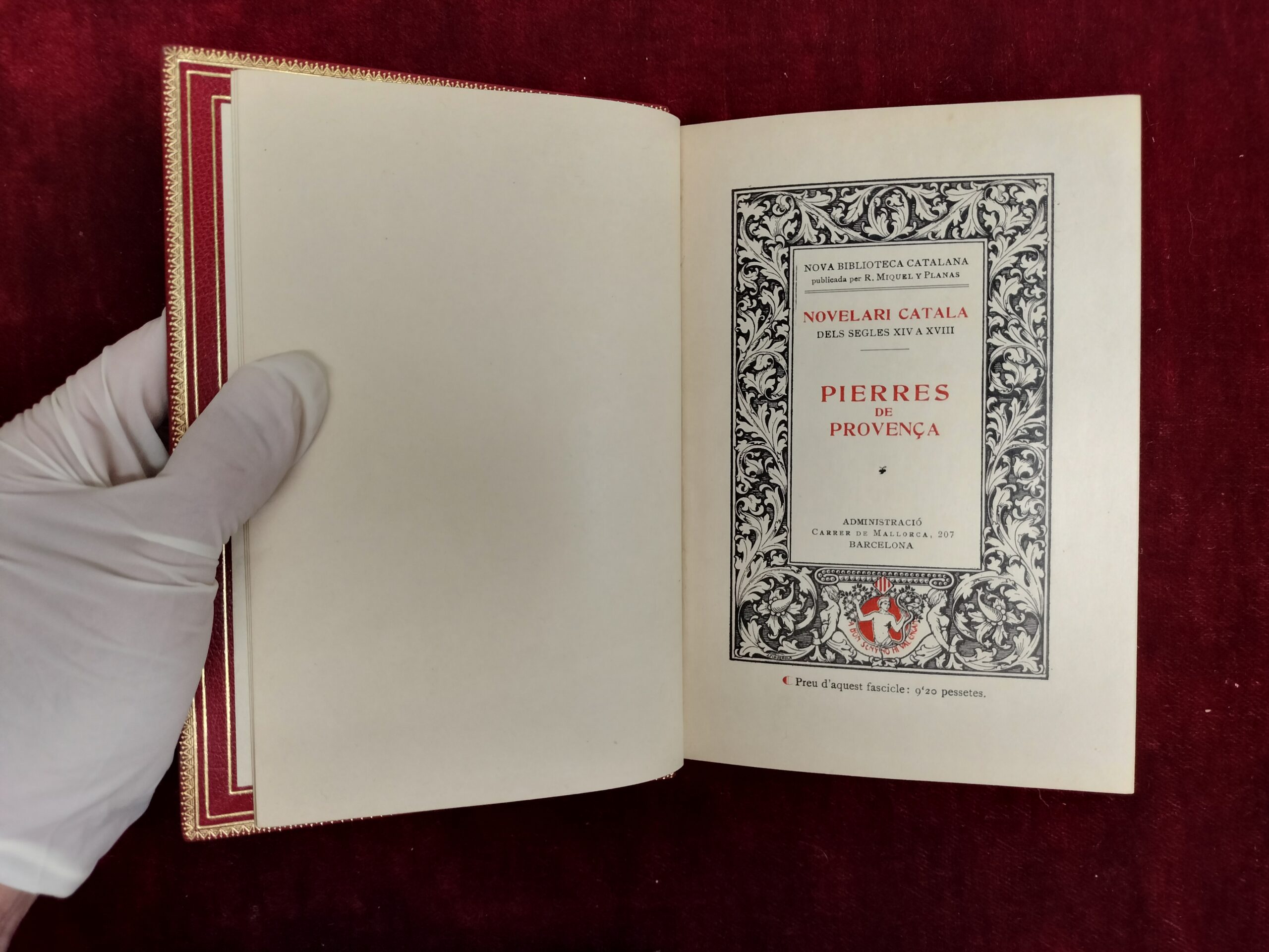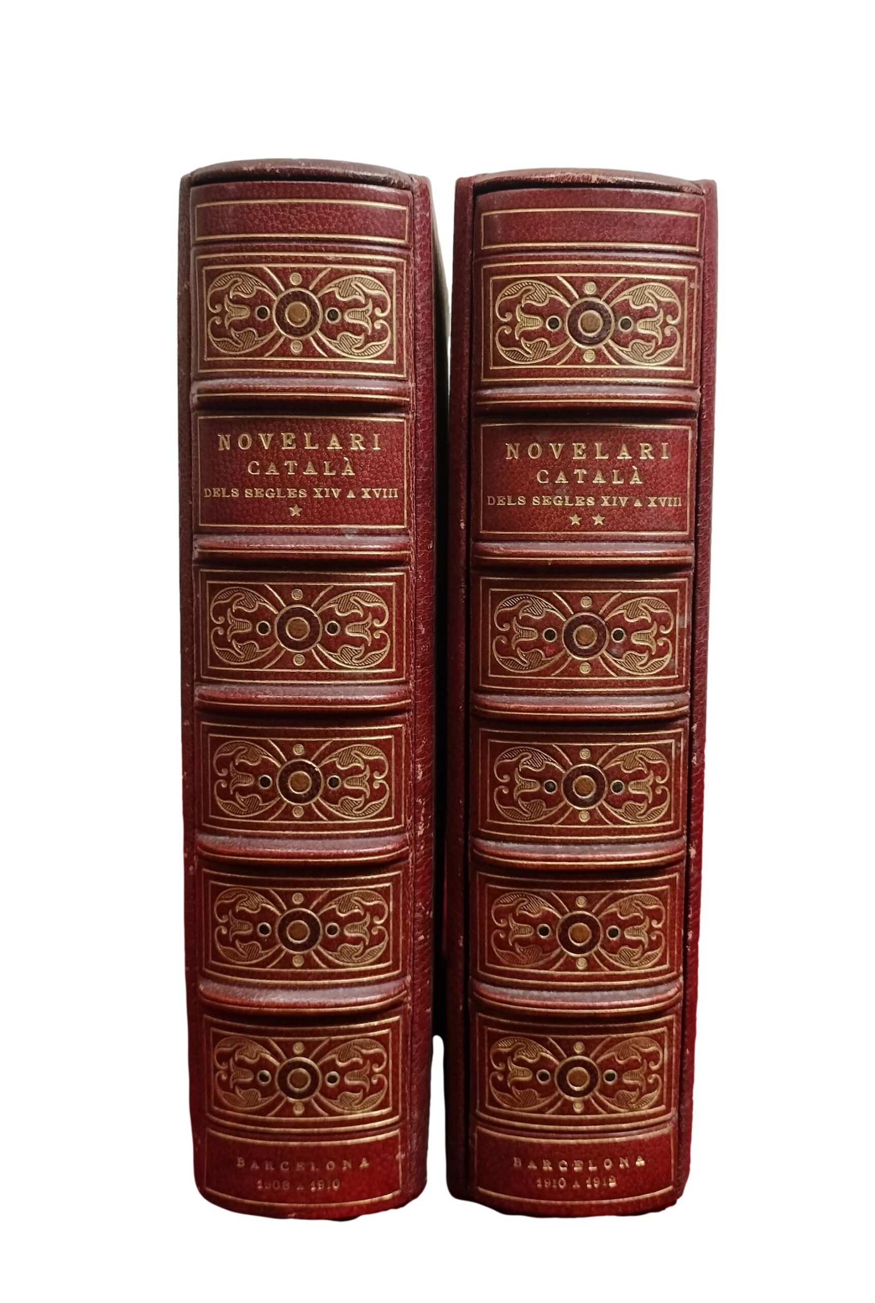 VER LAS IMÁGENES PARA COMPROBAR EL ESTADO REAL.  EXQUISITA ENCUADERNACIÓN EN PIEL, CON DORADOS. SOBRECUBIERTAS DECORADAS AL AGUA.  CANTOS DORADOS.  NOVA BIBLIOTECA CATALANA. 18 NÚMEROS EN 2 VOLÚMENES ENCUADERNADOS.  FRONTISPICIOS A DOS TINTAS.  ILUSTRADO.  DIR. MIQUEL Y PLANAS.  – TOMO PRIMERO: – PIERRES DE PROVENÇA, 89 PÁG. 1908.  – JACOB XALABIN. 62 PÁG. 1909. – LA FILLA DE L’EMPERADOR CONSTANTÍ. 35 PÁG. 1909. – FRONDINO Y BRISONA. 29 PÁG. 1909.  – LA FILLA DEL REY D’HUNGRIA. 61 PÁG. 1909.  – PARIS Y VIANA. 37 PÁG. 1909.  – SOMNI DE FRANCESCH ALEGRE. 21 PÁG. 1910.  – RAHONAMENT ENTRE FRANCESCH ALEGRE Y SPERANÇA. 7PÁG. 1910.  – PENSAMENT DE PERE JOAN FERRER. 12 PÁG. 1910.  – DESPROPRIAMENT D’AMOR DE ROMEU LULL. 11 PÁG. 1910.  – TRACTAT SOBRE SCIPIO Y ANIBAL. 54 PÁG. 1910.  TOMO SEGUNDO – LO FILL DEL SENESCAL. 25 PÁG. 1910.  – DEIFIRA ECATHONFILA. 60 PÁG. 1910. – FAULA DE NEPTUNO Y DIANA. 19 PÁG. 1911.  – RONDALLA DE RONDALLES. 56 PÁG. 1912.  – RONDAYA DE RONDAYES EN MALLORQUÍ. 26 PÁG. 1912.  – HISTORIA DE L’ESFORÇAT CAVALLER PARTINOBLES. 135 PÁG. 1912.  – LO CARCER D’AMOR. 106 PÁG. 1912 EN CATALÁN
