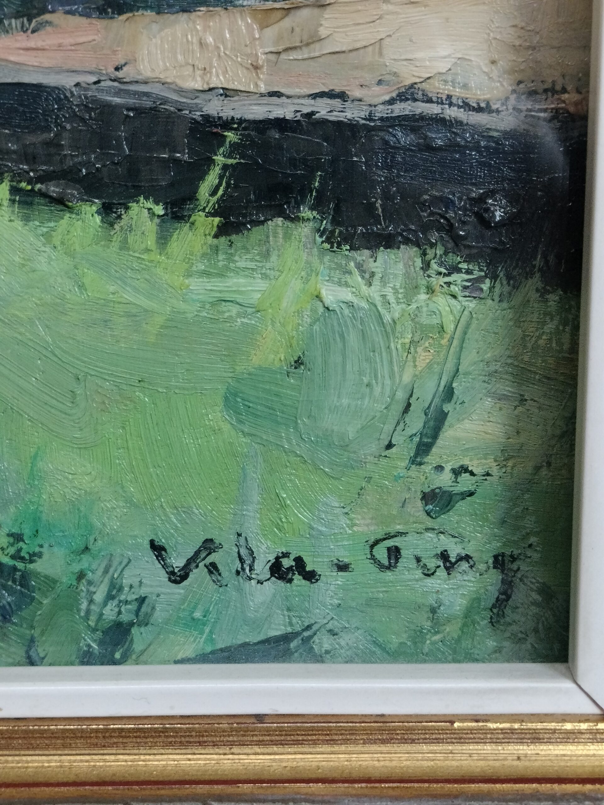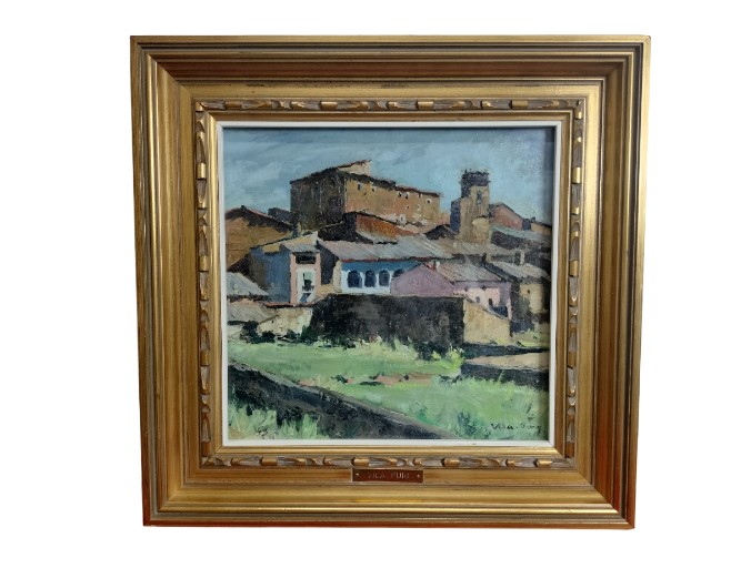 VER IMÁGENES PARA COMPROBAR EL ESTADO REAL. LAS IMÁGENES FORMAN PARTE DE LA DESCRIPCIÓN. FIRMADO VILA-PUIG. TITULADO EN LA PARTE POSTERIOR: PANORÁMICA CLARAVALLS. MARCO DE MADERA, CON LIGERAS EROSIONES Y RASGUÑOS. CON VIDRIO PROTECTOR. PINZELADA MATÉRICA. LIENZO EN BUEN ESTADO. MEDIDAS APROX: MARCO: 50,5 X 49 SOLO PINTURA: 34,5 X 33 Joan Vila Puig (Sant Quirze del Vallès, 10 de noviembre de 1890 – Bellaterra, 6 de marzo de 1963) fue un pintor catalán especializado en el paisaje. En 1918 presentó su primera exposición individual en Granada. Poco después, en 1920, exhibió también en el Círculo de Bellas Artes de Madrid y en las Galerías Layetanas de Barcelona. Al año siguiente, en 1919, viajó por primera vez a París, donde entró en contacto con la obra de Corot y de los preimpresionistas, cuya pintura le causó una gran impresión. Su recorrido europeo se amplió con estancias en Venecia y Florencia, ciudades en las que dejó atrás la atmósfera grisácea parisina para acercarse al clasicismo italiano. De regreso a Cataluña, abandonó progresivamente los escenarios urbanos y orientó su mirada hacia el mundo rural, con sus masías y caminos polvorientos, elementos que permanecerían como constantes en su producción artística.