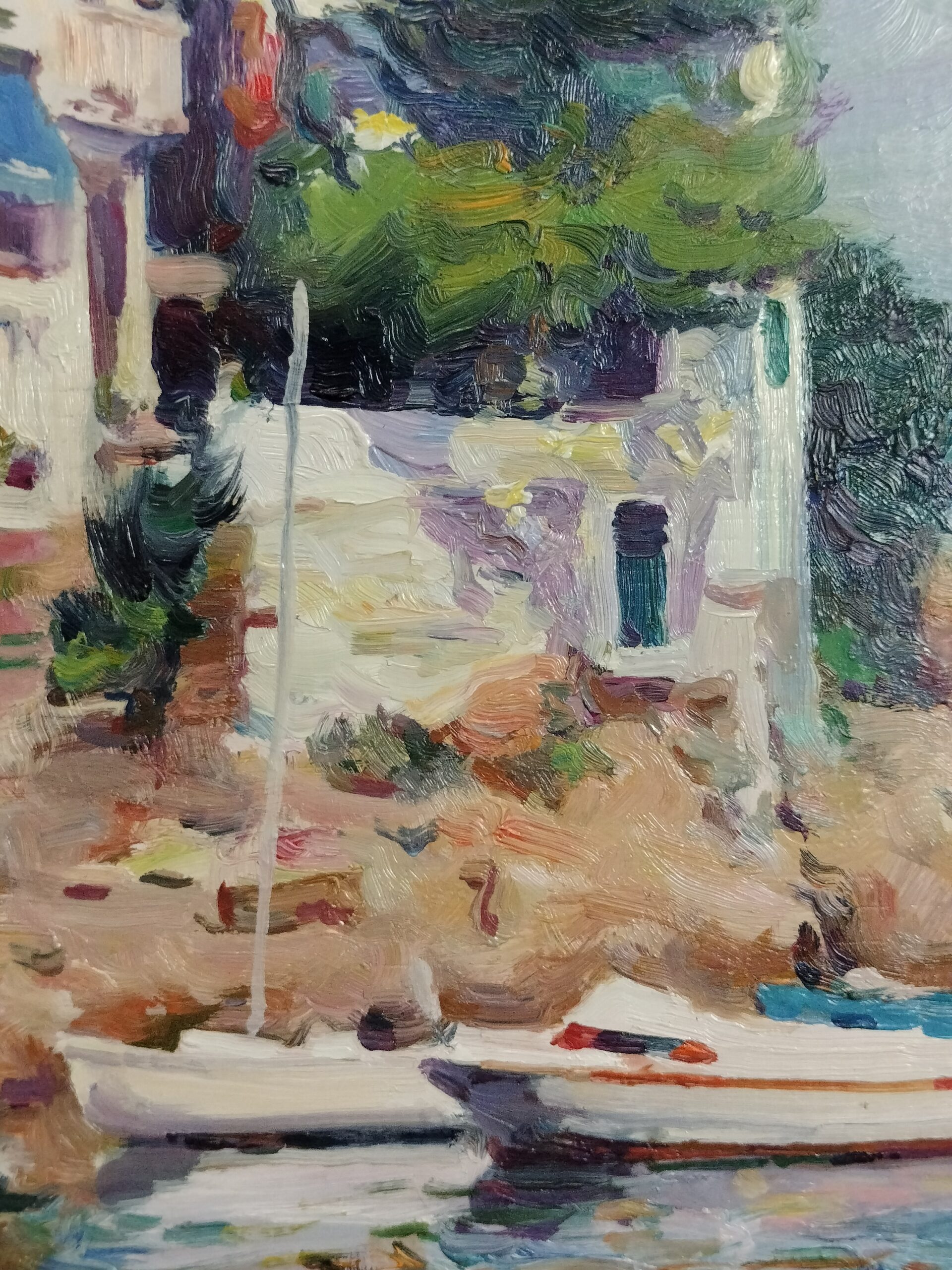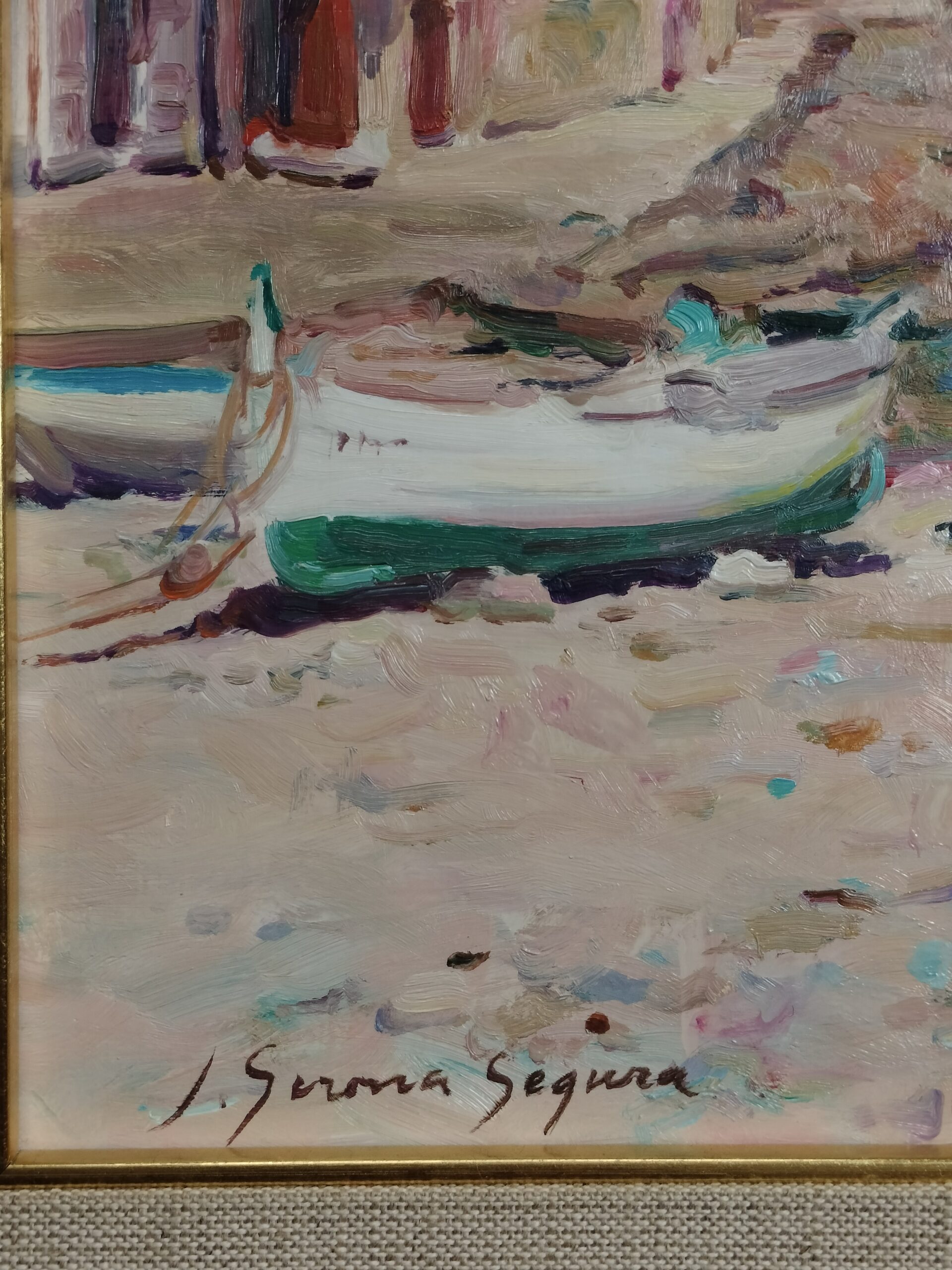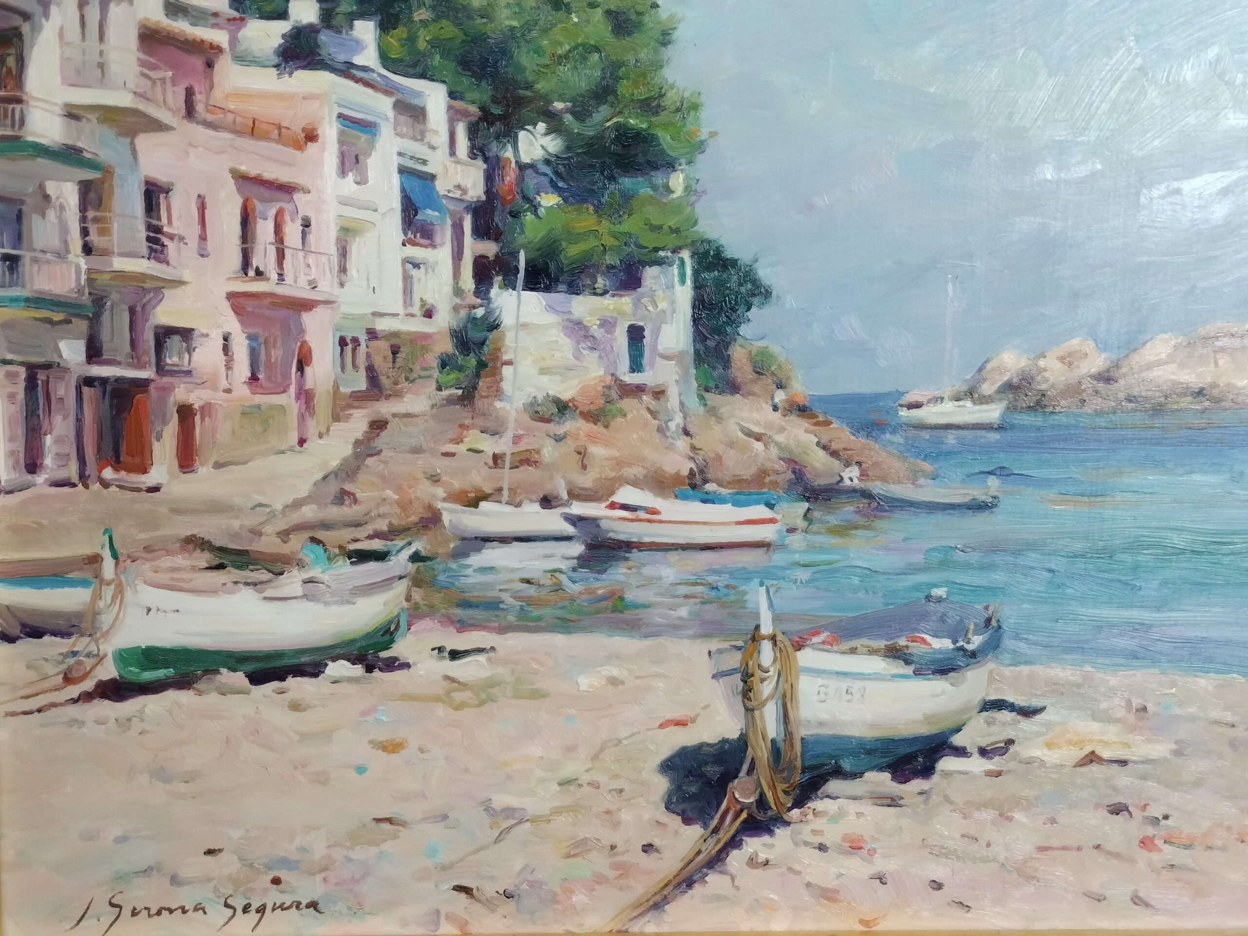 JOSÉ GIRONA SEGURA. EMBARCACIONES EN LA CALA. ÓLEO SOBRE TABLA. ESPAÑA. SIGLO XX