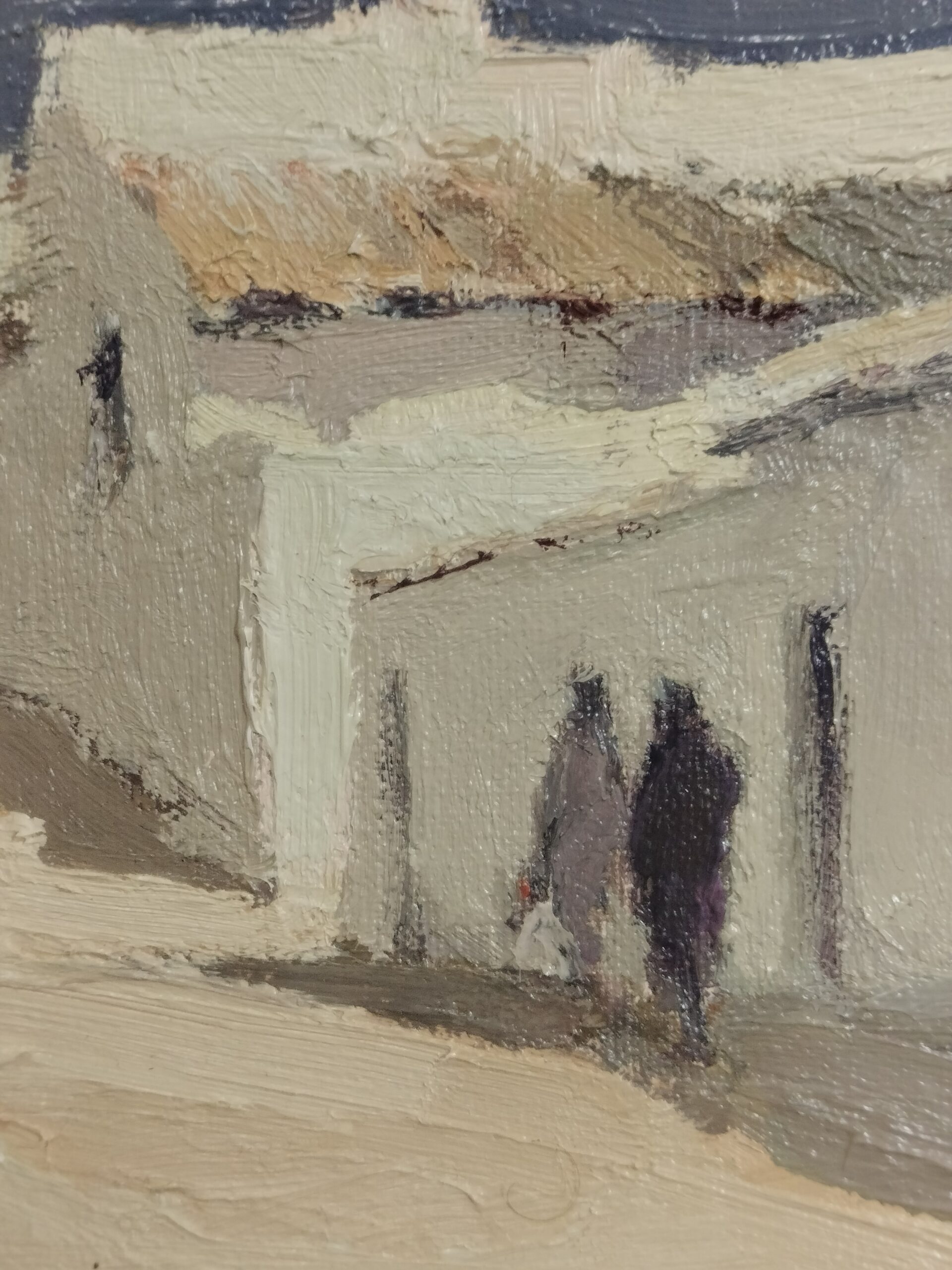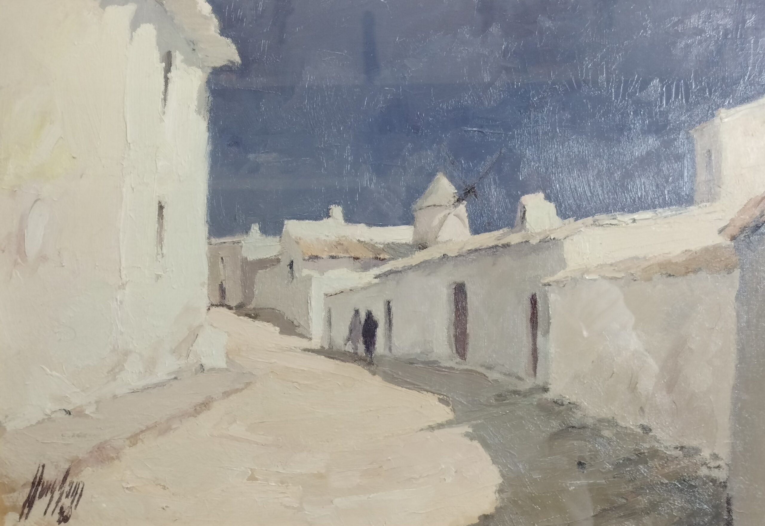 LLUÍS SANZ I TORRADEFLOT. PASEANTES EN EL PUEBLO. ÓLEO SOBRE LIENZO. ESPAÑA. XX