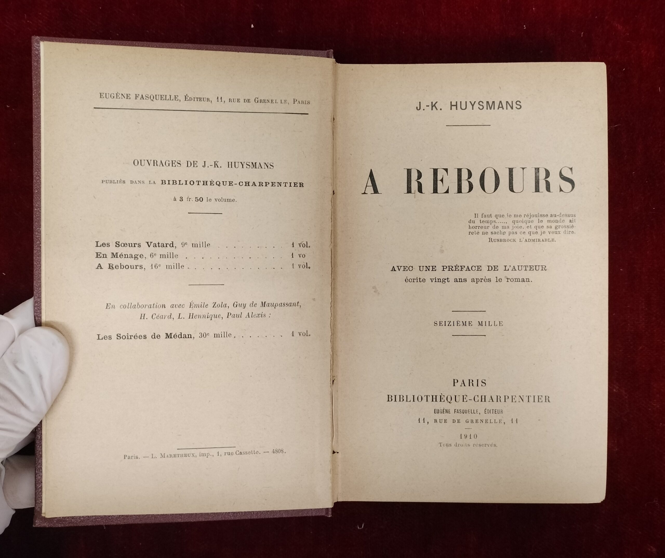 A REBOURS. J.K HUYSMANS. PARÍS. ED. FASQUELLE. BIBLIOTHÈQUE CHARPENTIER. 1910.