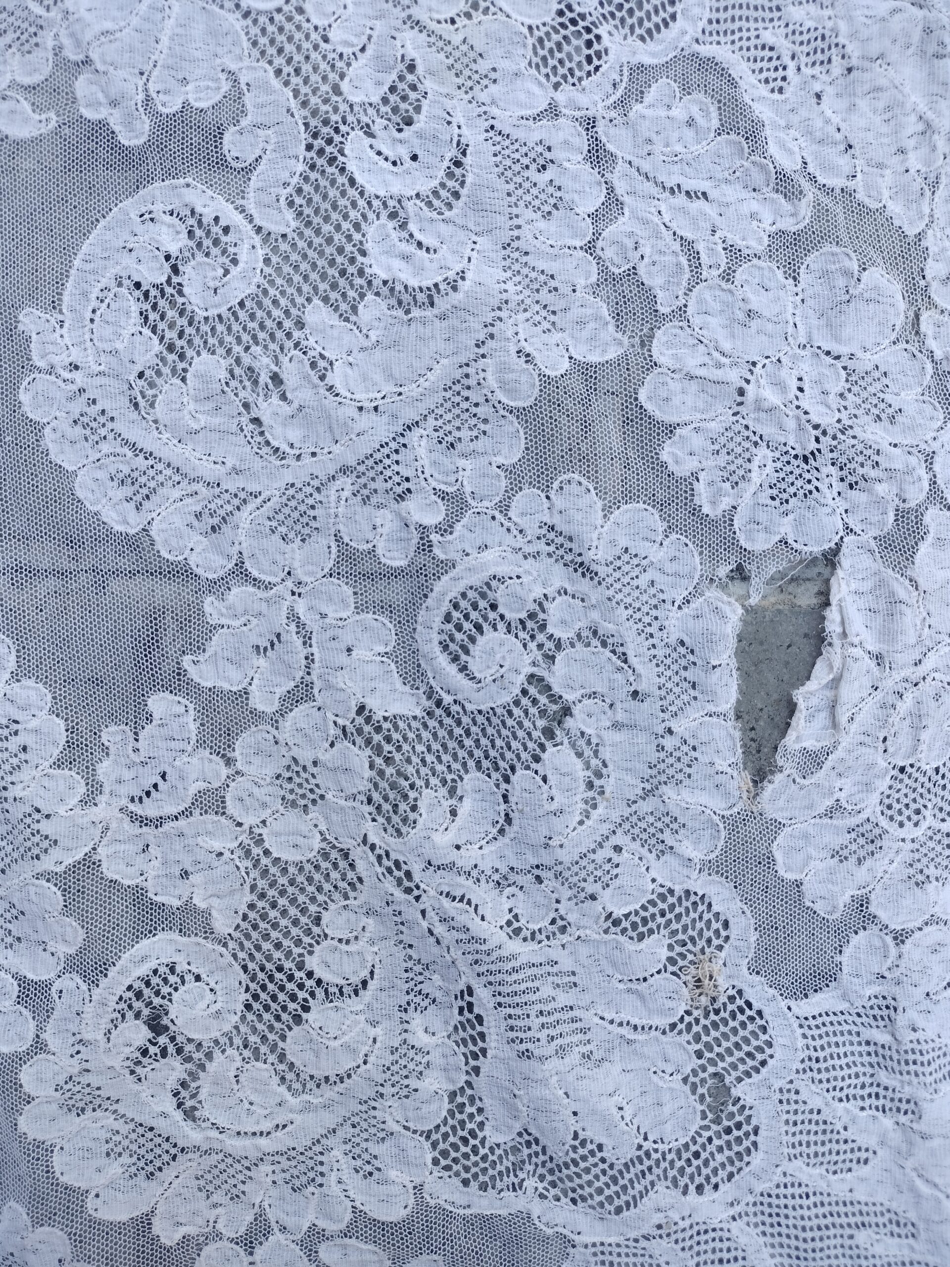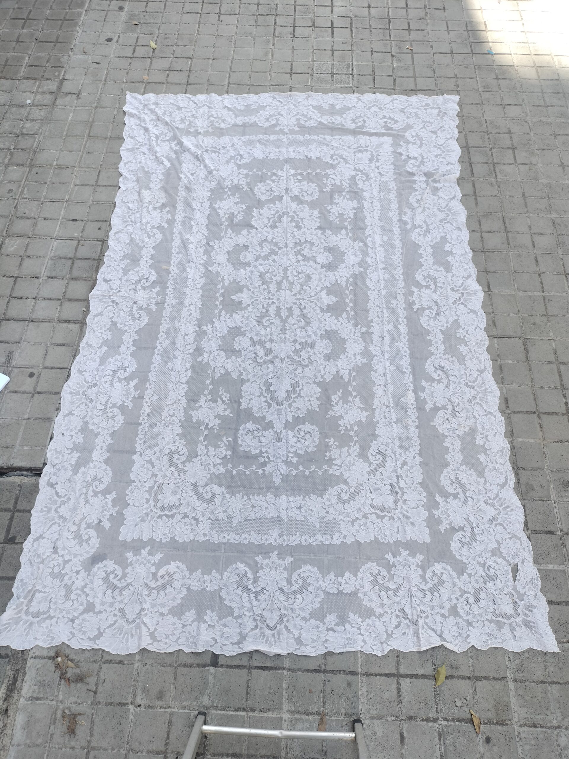 VER IMÁGENES PARA COMPROBAR EL ESTADO REAL. CUBRECAMAS O MANTEL. BLANCO. SOBRE TUL. PRESENTA ALGUNAS ROTURAS Y MARCAS DE RESTAURACIONES PREVIAS. VER IMÁGENES.