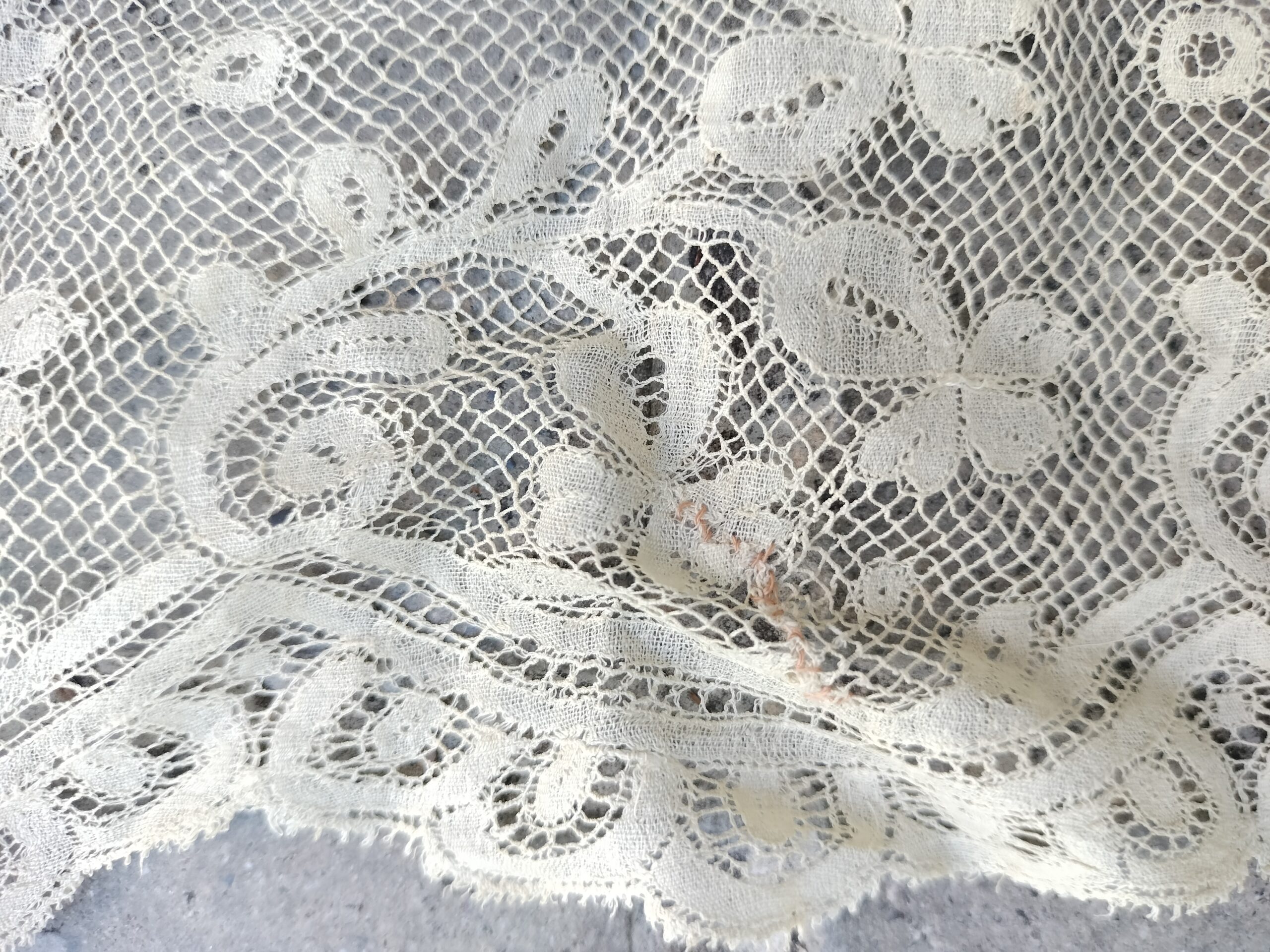 VER IMÁGENES PARA COMPROBAR EL ESTADO REAL. LAS IMÁGENES FORMAN PARTE DE LA DESCRIPCIÓN. CUBRECAMAS O MANTEL. ENCAJE MANUAL SOBRE BASE DE TUL. 250 X 230 CM APROX. PRESENTA ALGUNAS FALTAS Y ROTURAS. ALGUNOS PUNTOS HAN SIDO RESTAURADOS Y REHILADOS. VER IMÁGENES. DE COLOR BLANCO-AMARILLO.