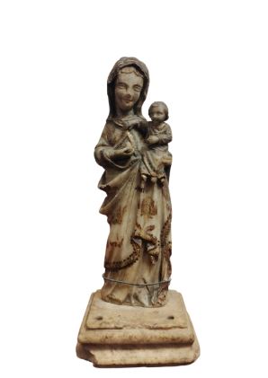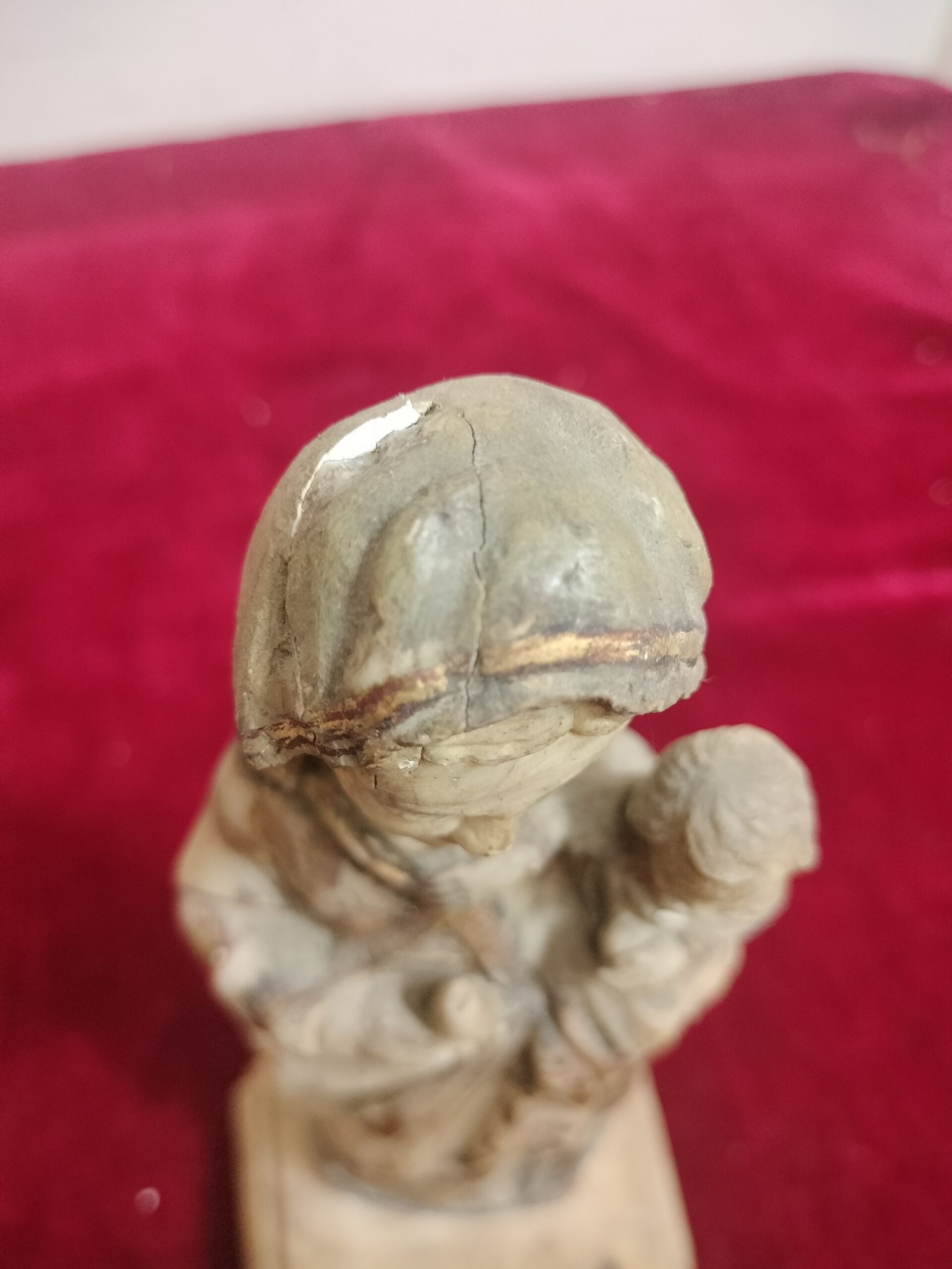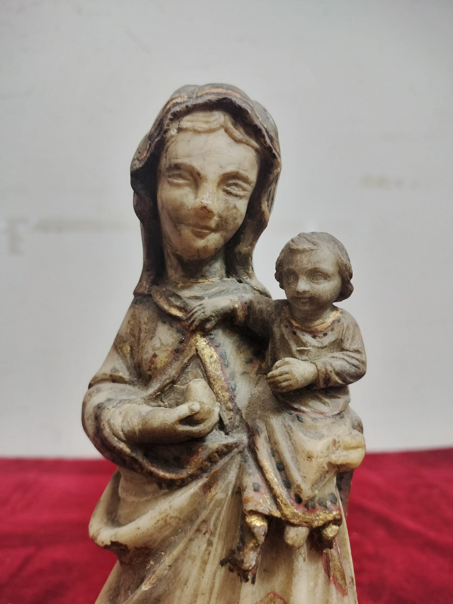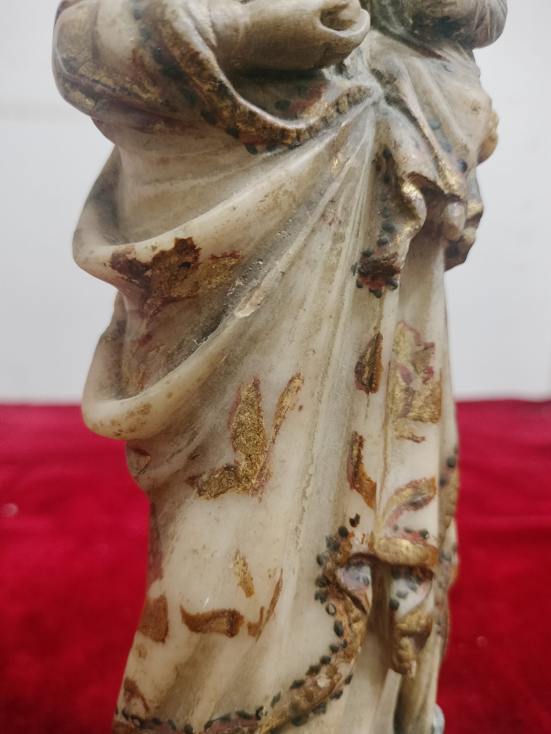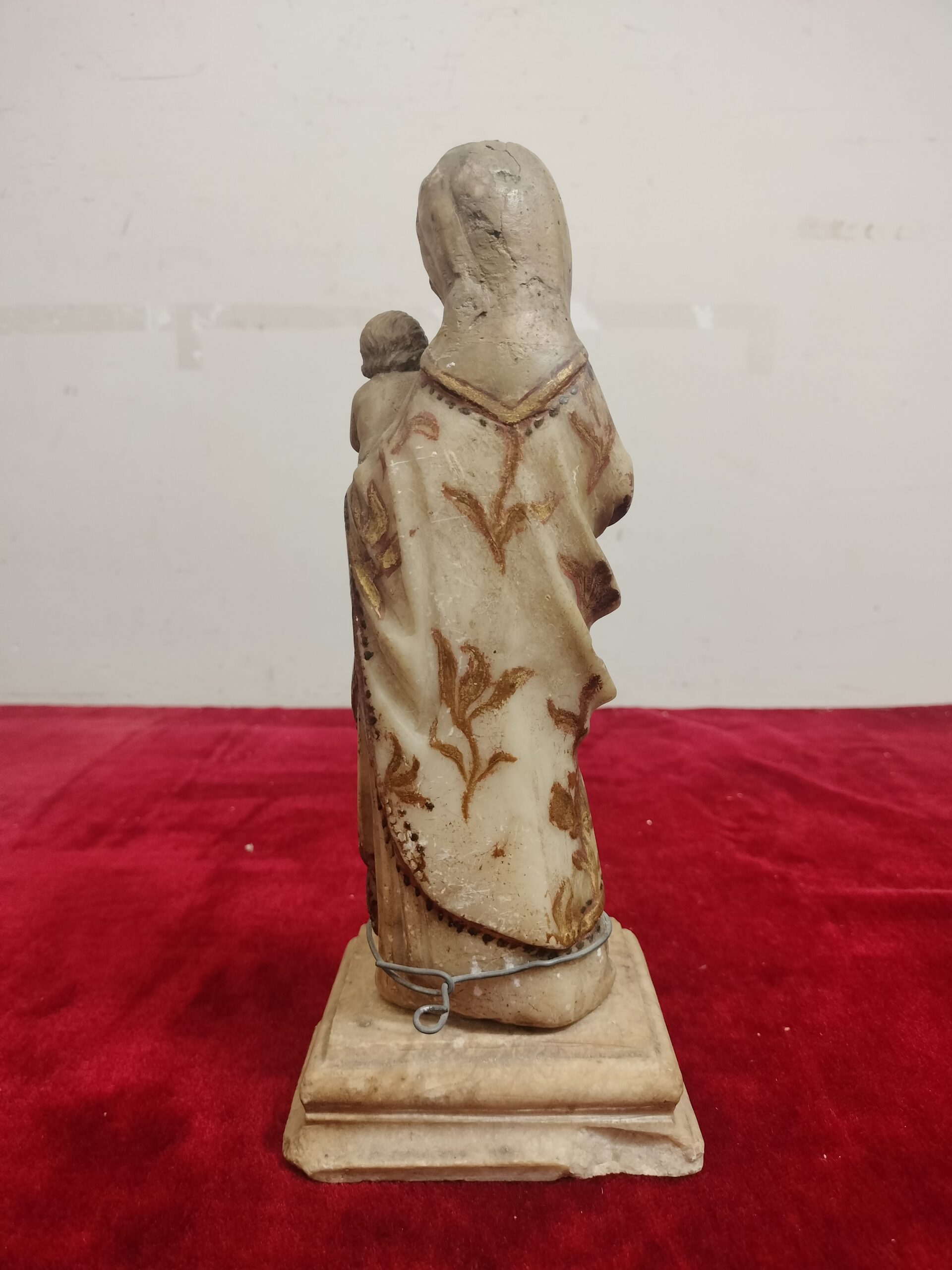 VER IMÁGENES PARA COMPROBAR EL ESTADO REAL. LAS IMÁGENES FORMAN PARTE DE LA DESCRIPCIÓN. VIRGEN CON EL NIÑO. MODELO MADONNA DE TRAPANI. ALABSTRO POLICROMADA. DORADOS Y ROJOS. PRESENTA EROSIONES EN LA PÁTINA. PEQUEÑAS ROTURAS Y EROSIONES DEBIDO AL TIEMPO. FALTAS. MEDIDAS: BASE: 11 X 8 X 3,5 ESCULTURA: 22 CM ALTO.
