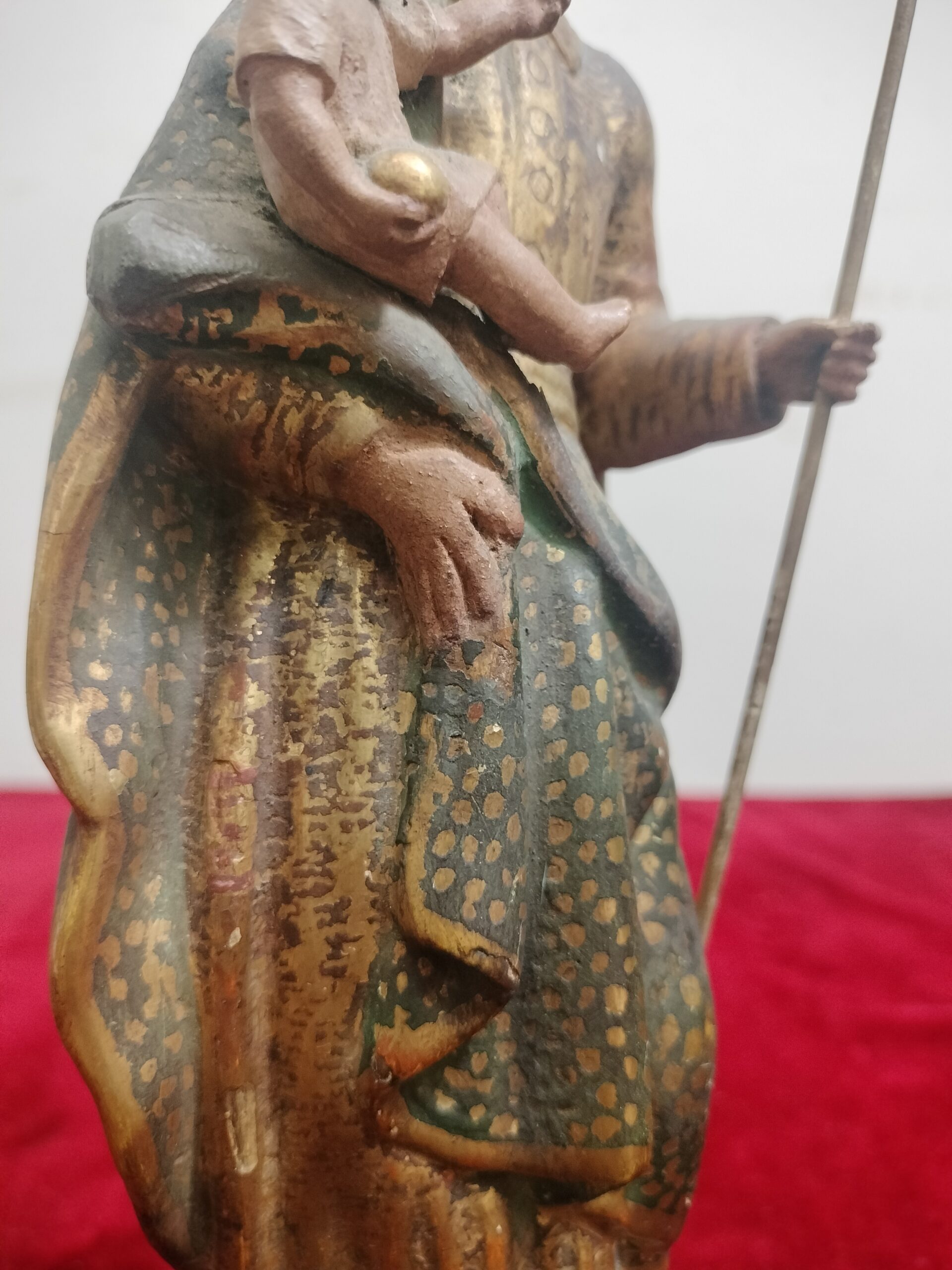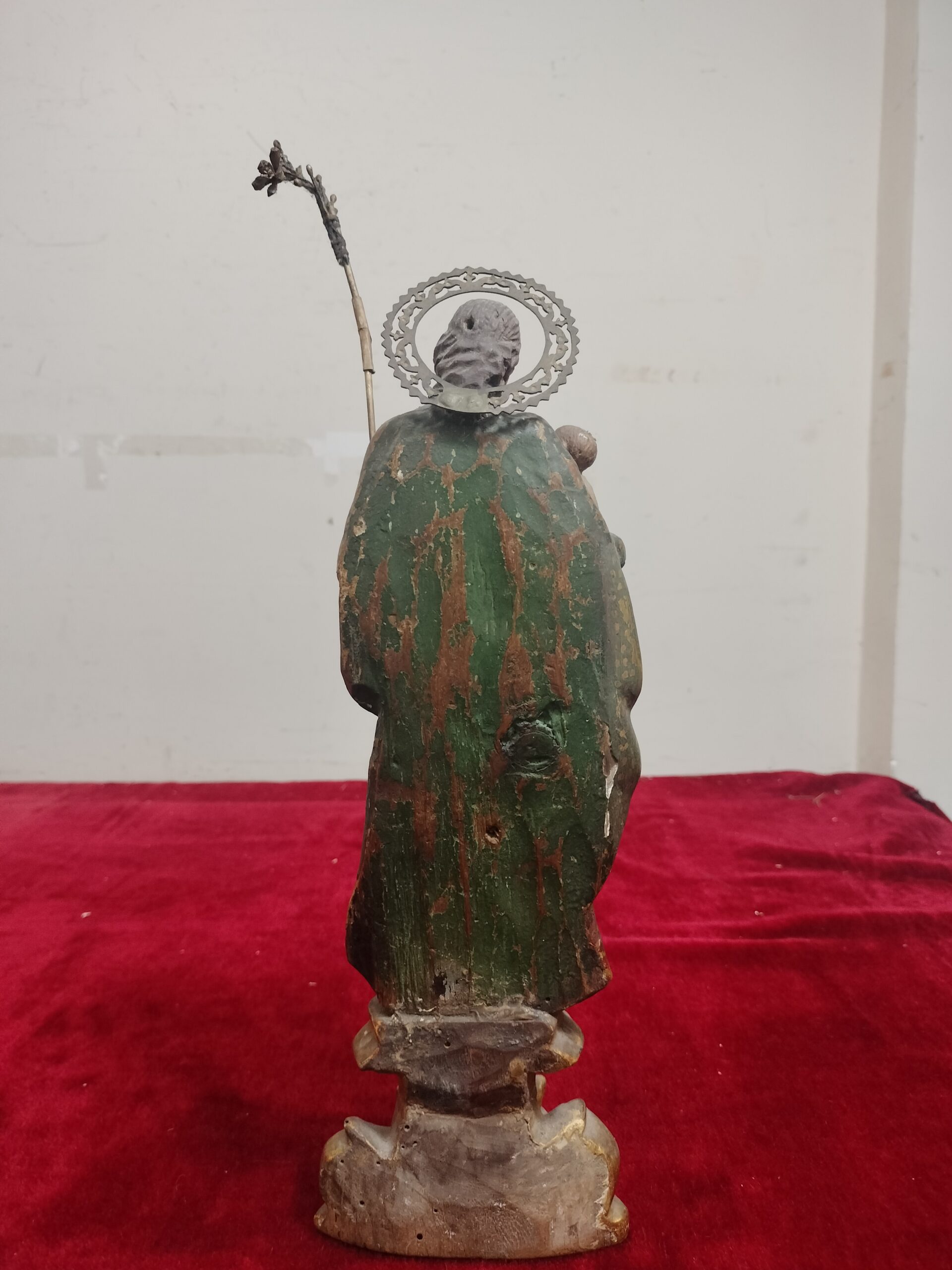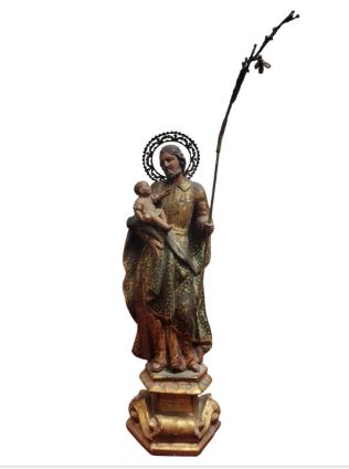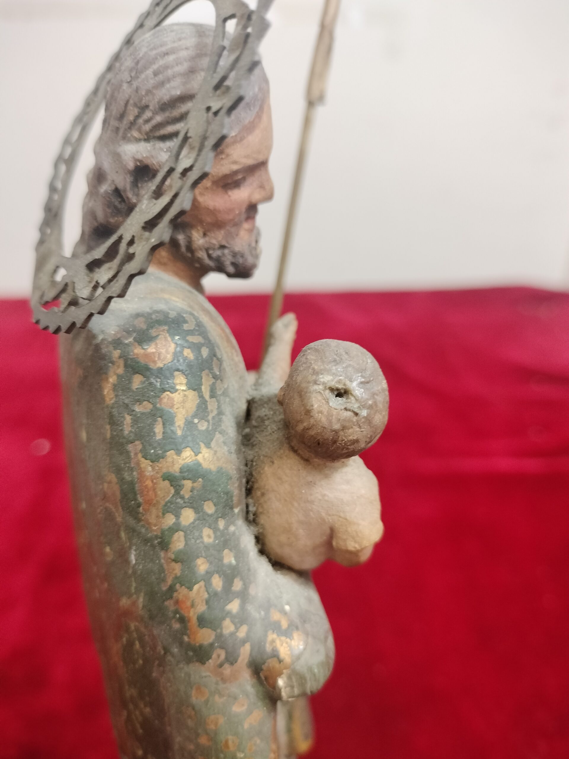 VER IMÁGENES PARA COMPROBAR EL ESTADO REAL.  LAS IMÁGENES FORMAN PARTE DE LA DESCRIPCIÓN.  SAN JOSÉ CON EL NIÑO.  MADERA POLICROMADA. CORONA DE METAL.  SEGURAMENTE SE TRATA DE UNA PIEZA ORNAMENTAL PARA ALTAR O RETABLO. PENSADA PARA VERSE DE FRENTE.  BASE EN MADERA DORADA.  PRESENTA PÉRDIDAS DE PÁTINA. RASGUÑOS Y EROSIONES. RESTOS DE CARCOMA EN LA PARTE POSTERIOR DE LA BASE. EL NIÑO JESÚS HA PERDIDO LA CORONA. 30,5 CM ALTO APROX.