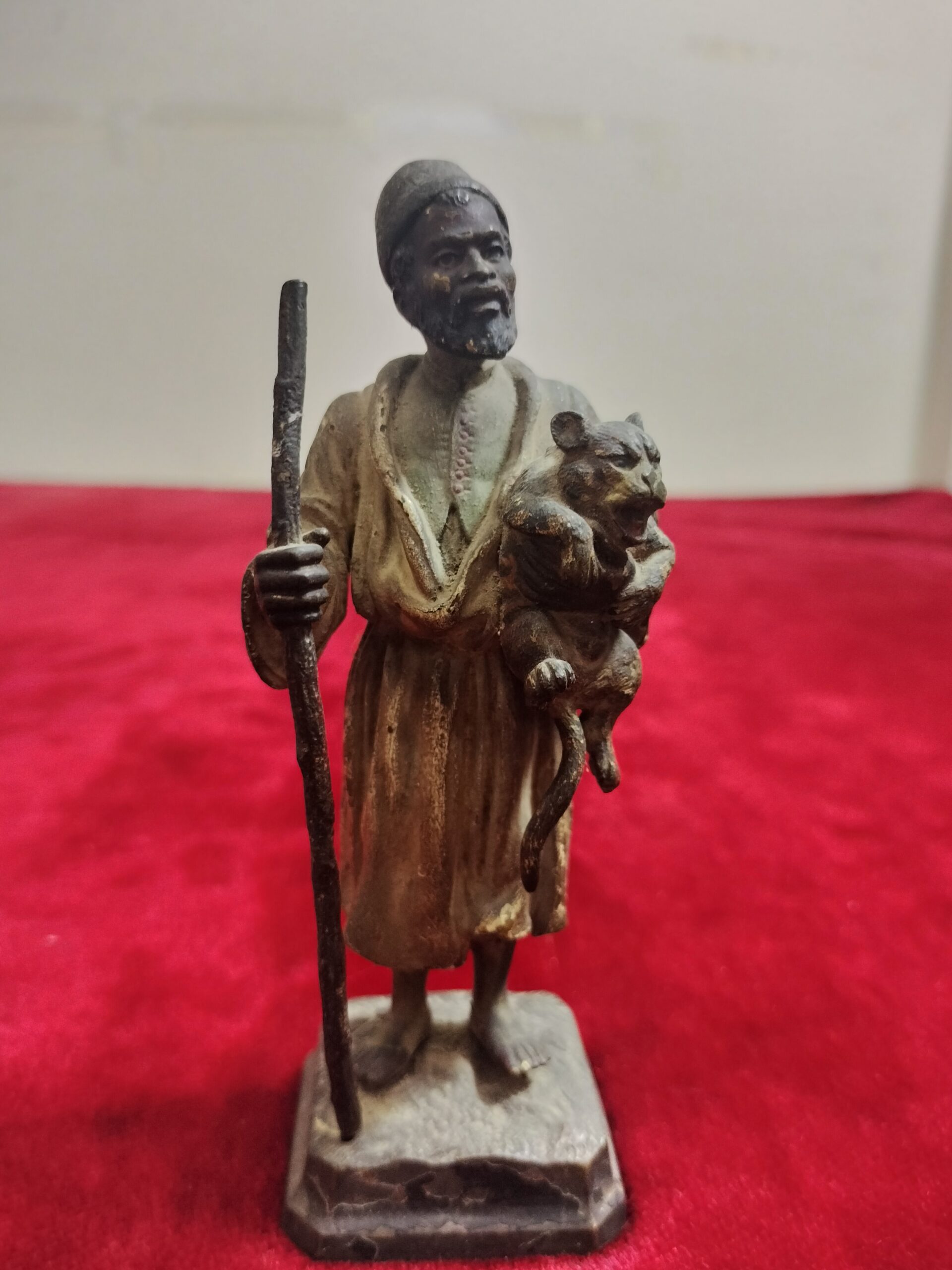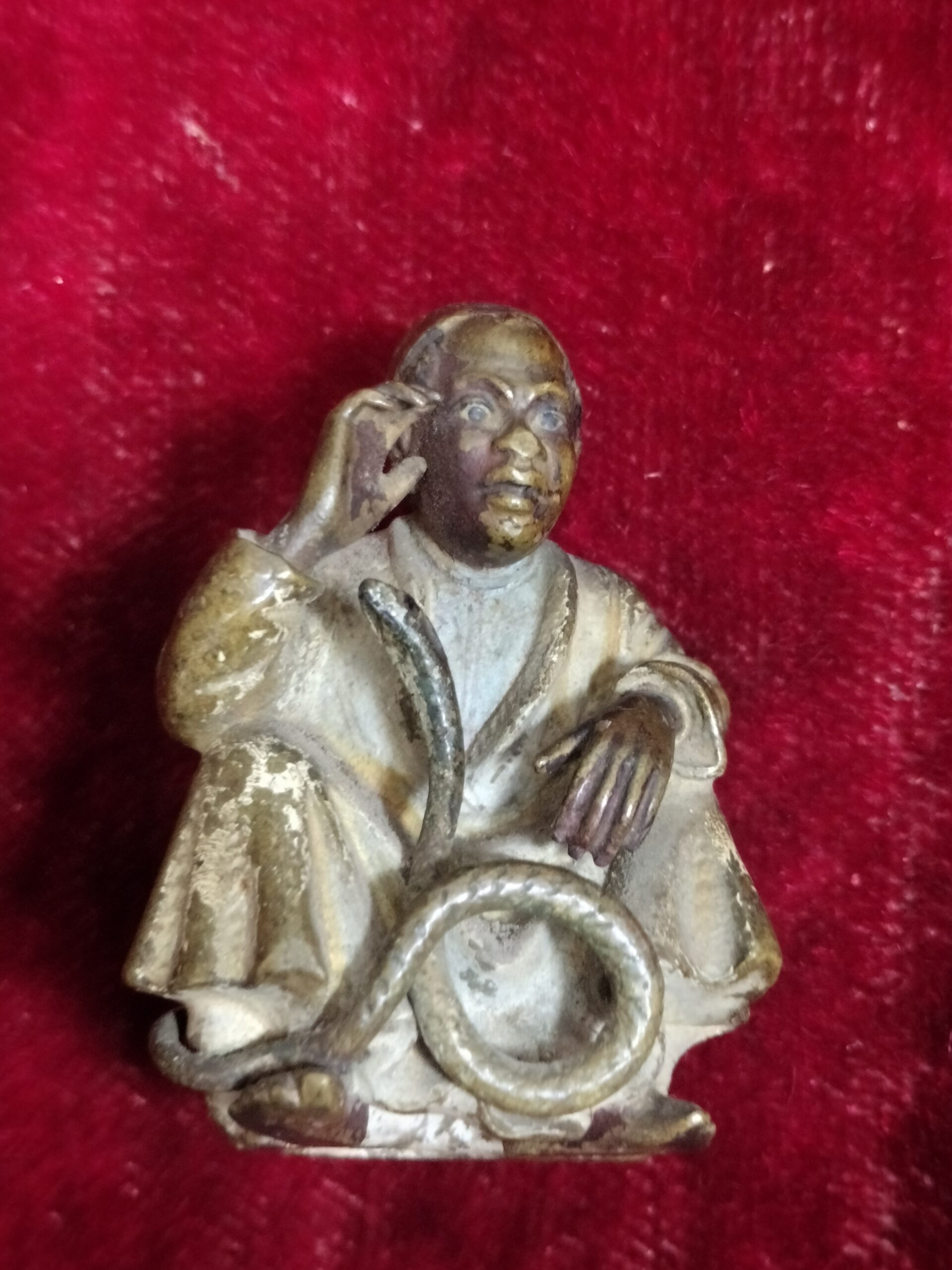 VER IMÁGENES PARA COMPROBAR EL ESTADO REAL. LAS IMÁGENES FORMAN PARTE DE LA DESCRIPCIÓN. FIGURAS DE PERSONAJES ORIENTALES. METAL POLICROMADO. ALEMANIA. SIGLO XIX-XX SIN FIRMA O MARCA DE AUTOR APARENTE. UNA DE LAS FIGURAS HA PERDIDO SU ATRIBUTO ORIGINAL. EL BASTÓN DE LA OTRA FIGURA DE PIE SE ENCUENTRA SALIDO DE LA BASE. LA PÁTINA SE ENCUENTRA MUY DESGASTADA, ESPECIALMENTE EN EL ROSTRO. EROSIONES DEBIDO AL TIEMPO Y EL USO. MEDIDAS: FIGURAS DE PIE: 4,7 X 4,6 X 12,5 ENCANTADOR DE SERPIENTES: 3,5 X 3,5 X 5