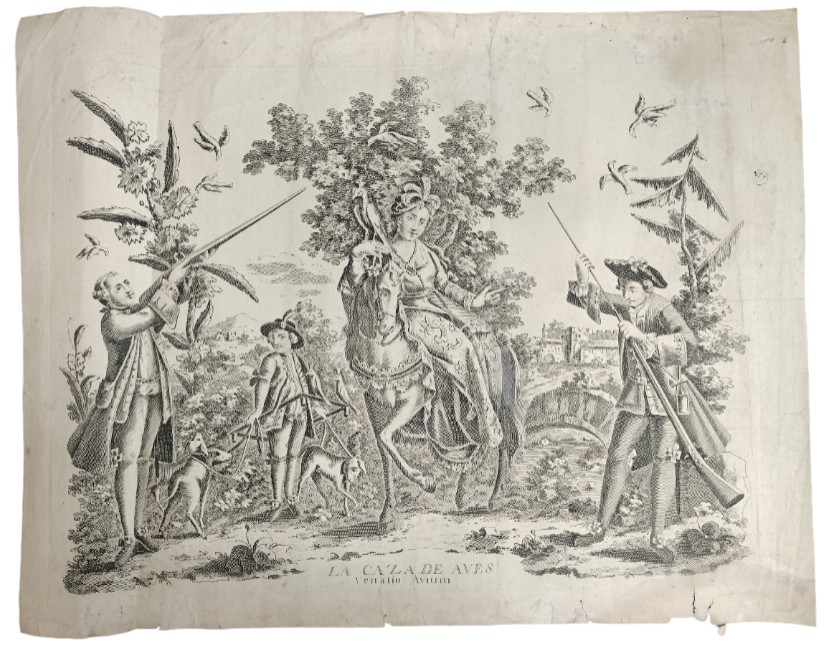 LA CAZA DE AVES. SIN FIRMA. GRABADO CALCOGRÁFICO SOBRE PAPEL. ESPAÑA. XVIII-XIX