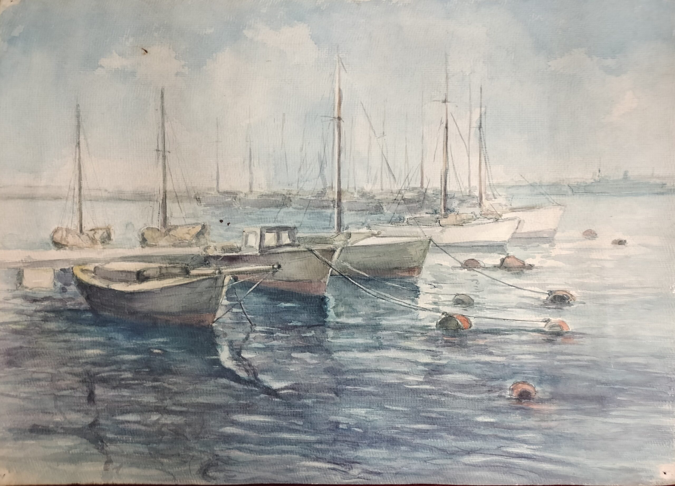 EMBARCACIONES EN EL PUERTO. SIN FIRMAR. ACUARELA SOBRE PAPEL. ESPAÑA. XX