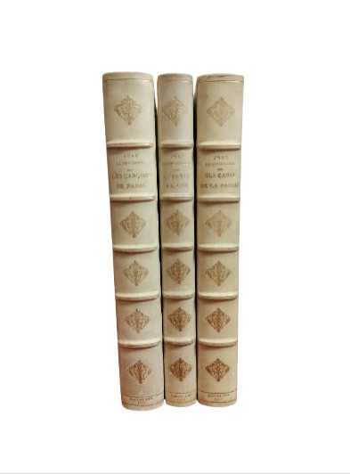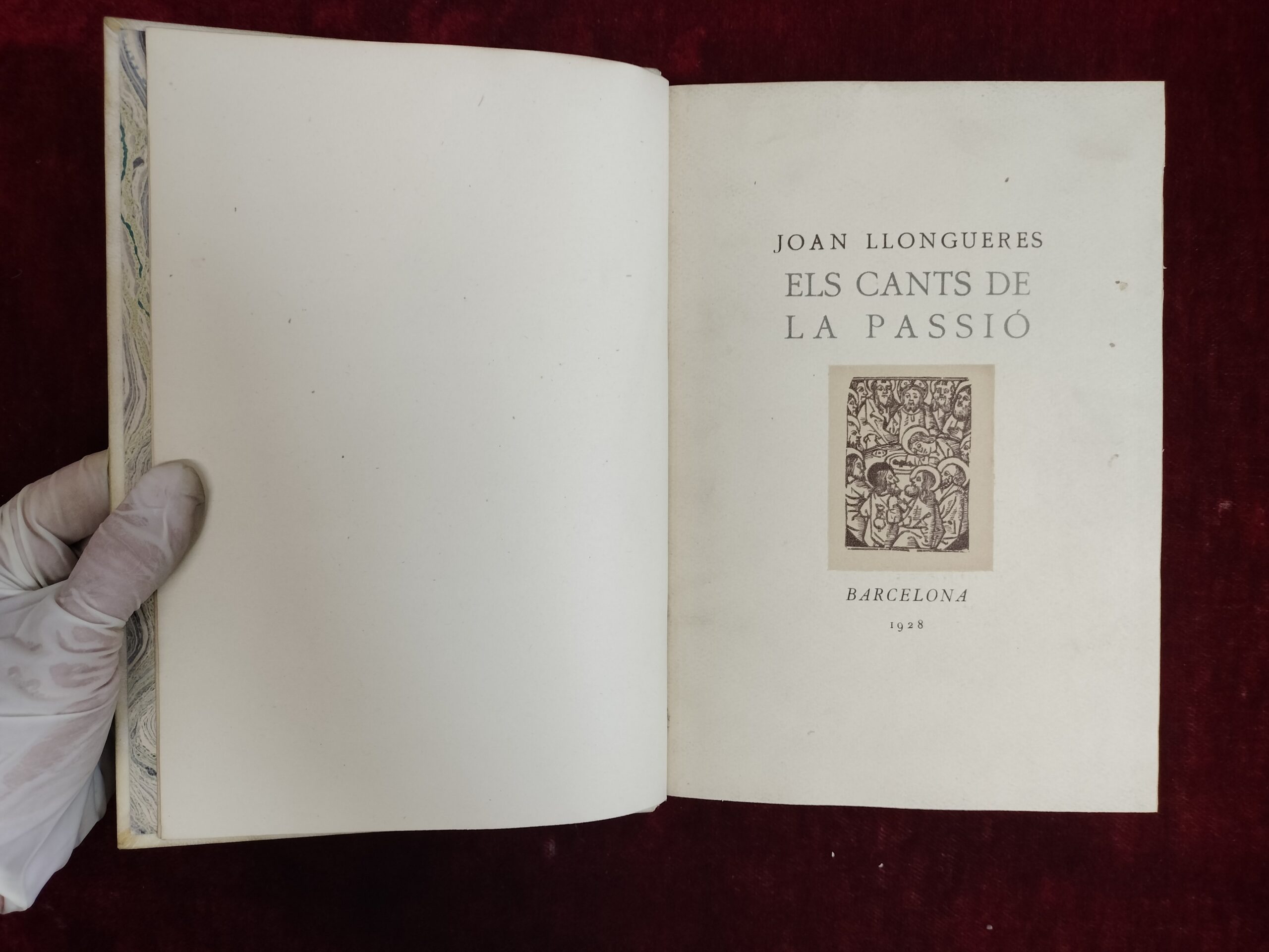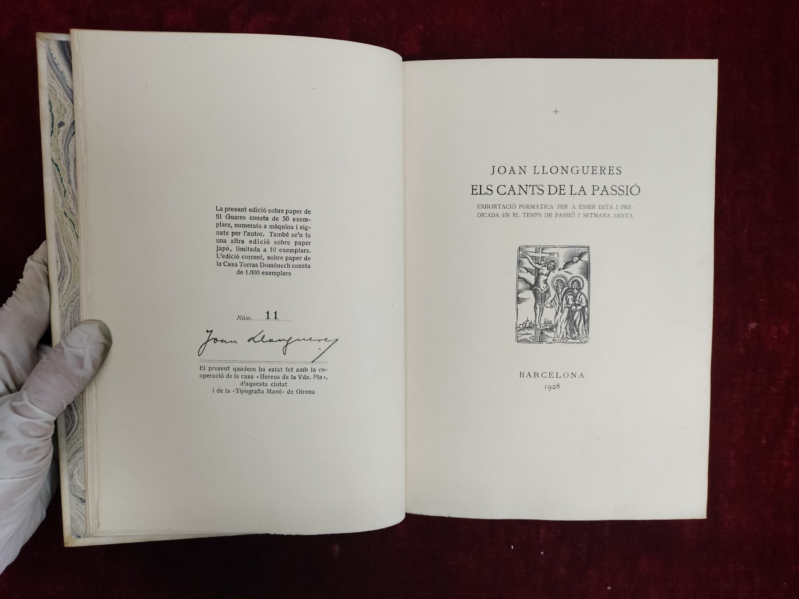 VER IMÁGENES PARA COMPROBAR EL ESTADO REAL.  LAS IMÁGENES FORMAN PARTE DE LA DESCRIPCIÓN.  CONJUNTO DE TRES OBRAS DE JOAN LLONGUERES.  IMP. HEREUS DE LA VIUDA PLA. BARCELONA, 1927 – 1928.  ENCUADERNACIÓN EN PIEL. LOMO CON NERVIOS. GUARDAS DECORADAS AL AGUA.  PAPEL DE HILO GUARRO. EDICIONES LIMITADAS Y NUMERADAS: 11/50.  SIGNADAS A MÁQUINA EN EL FRONTISPICIO.  EN CATALÁN.  – JOAN LLONGUERES. ELS CANTS DE LA PASSIÓ. BARCELONA, 1928. 249 PÁG.  – JOAN LLONGUERES. L’ISTIU AL COR. BARCELONA, 1928. 156 PÁG.  – JOAN LLONGUERES. LES CANÇONS DE NADAL. 1927. 277 PÁG.  ENCUADERNACIÓN CON PEQUEÑAS MANCHAS DE HUMEDAD. EN BUEN ESTADO GENERAL, CON LIGERO ÓXIDO DEBIDO AL TIEMPO.