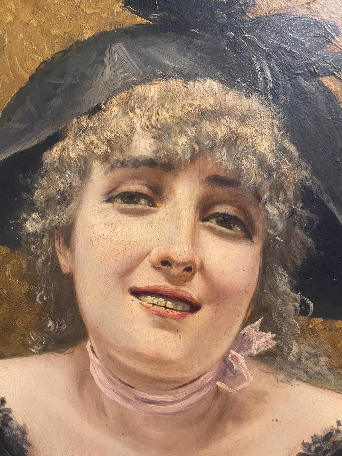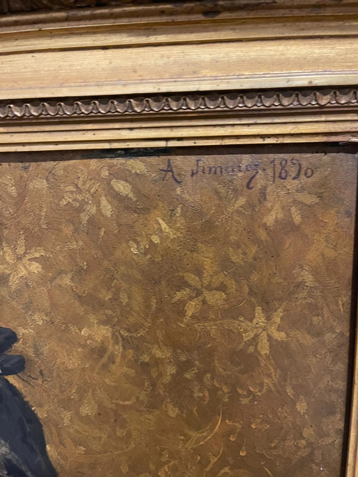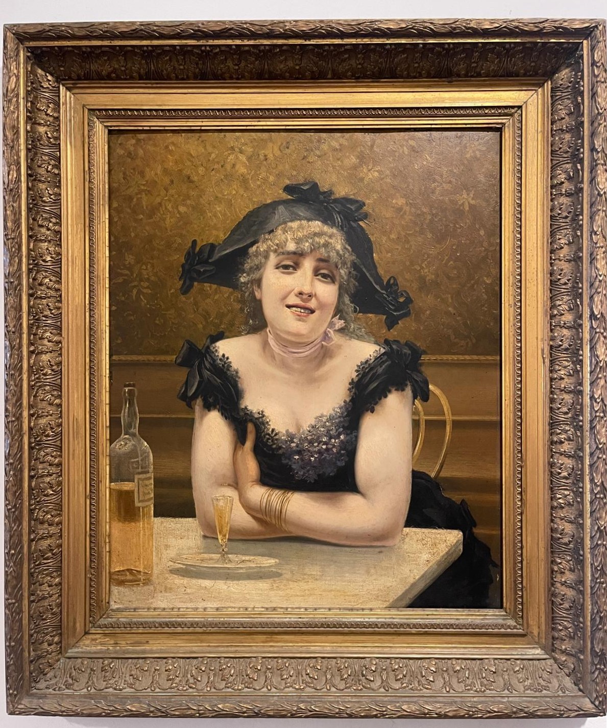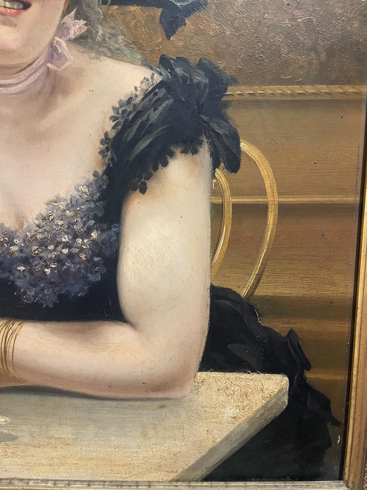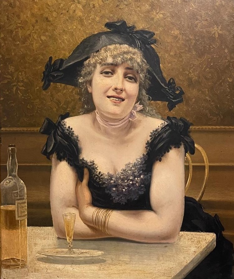 MUJER EN EL CAFÉ. FIRMADO A. JIMENEZ. ÓLEO SOBRE TABLA. ESCUELA ESPAÑOLA. 1890