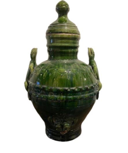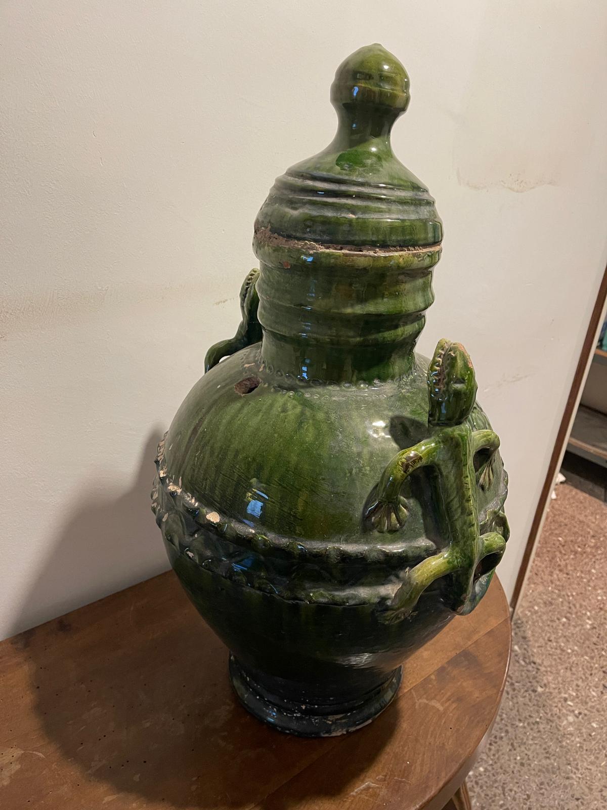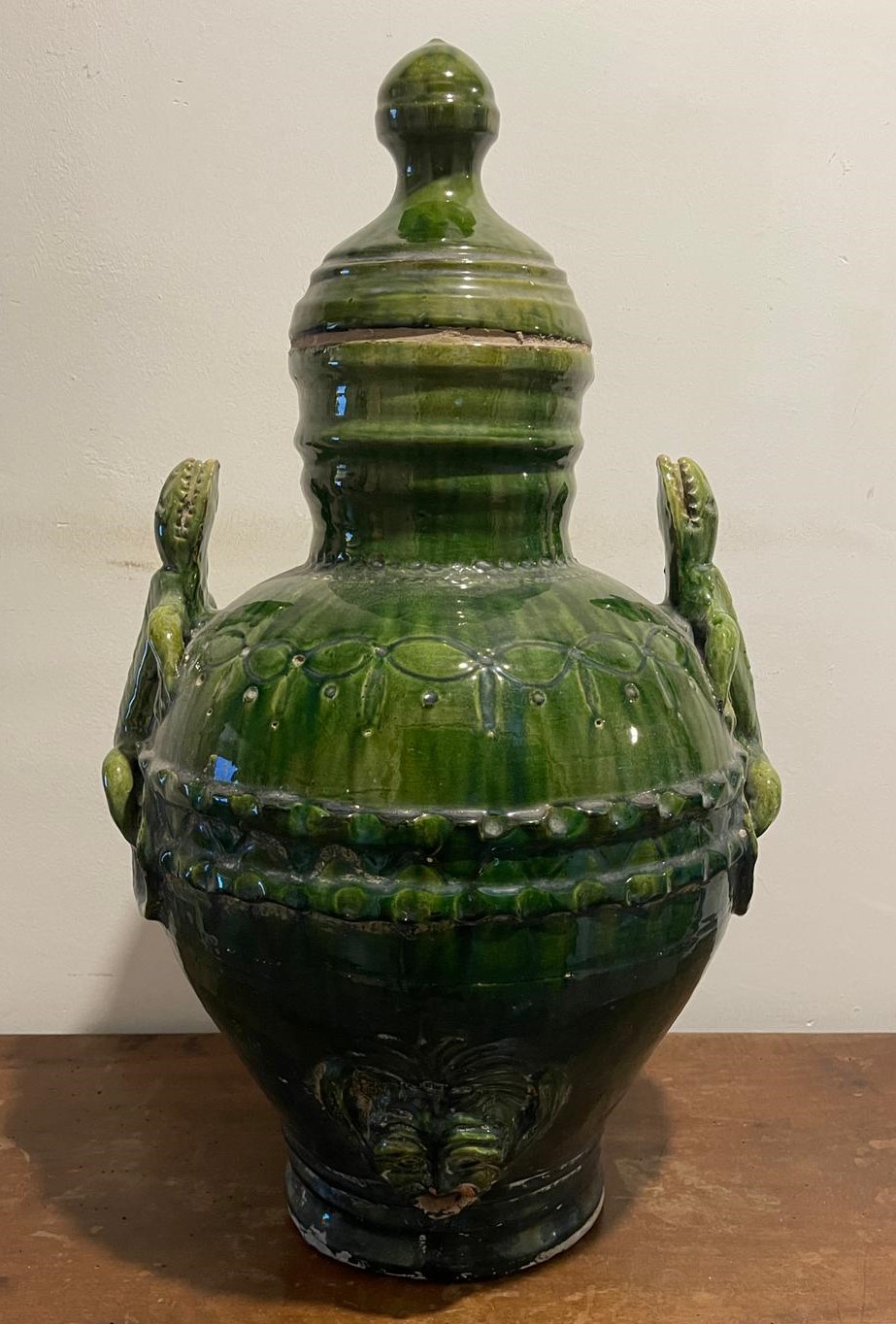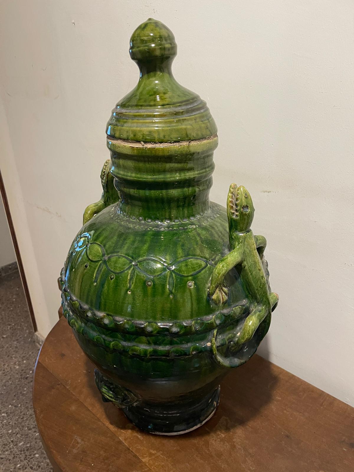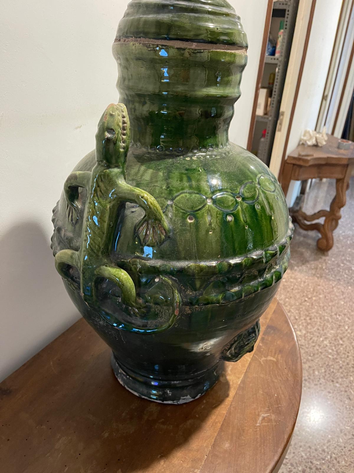 VER IMÁGENES PARA COMPROBAR EL ESTADO REAL. LAS IMÁGENES FORMAN PARTE DE LA DESCRIPCIÓN. AGUAMANIL CON LAGARTIJAS. CERÁMICA ESMALTADA, DE TONALIDADES VERDES. ORNAMENTADO CON MOTIVOS ZOOMORFOS. SIN FIRMA NI MARCA DE AUTOR. AGUJERO DE SALIDA EN FORMA DE ROSTRO DE MONO. PRESENTA LIGERAS EROSIONES EN LA BASE. LIGEROS DESPORTILLAMIENTOS. VER IMÁGENES EN DETALLE.