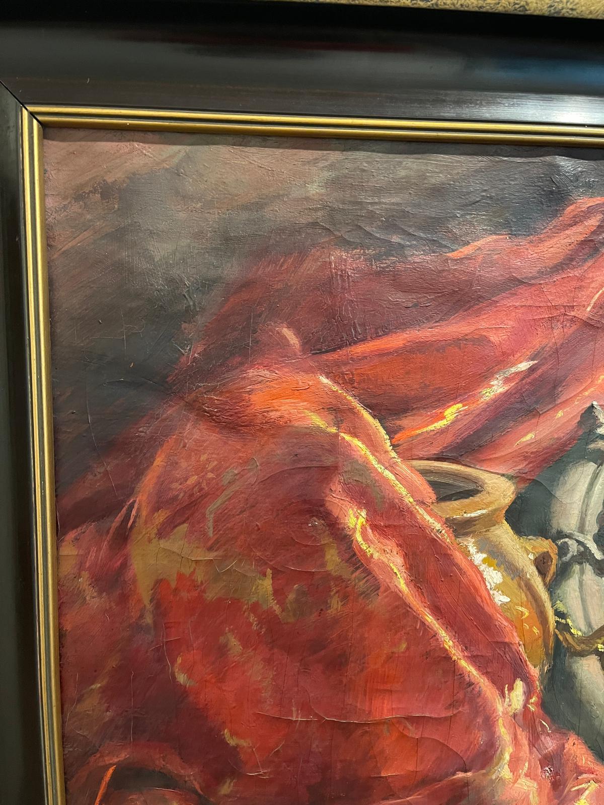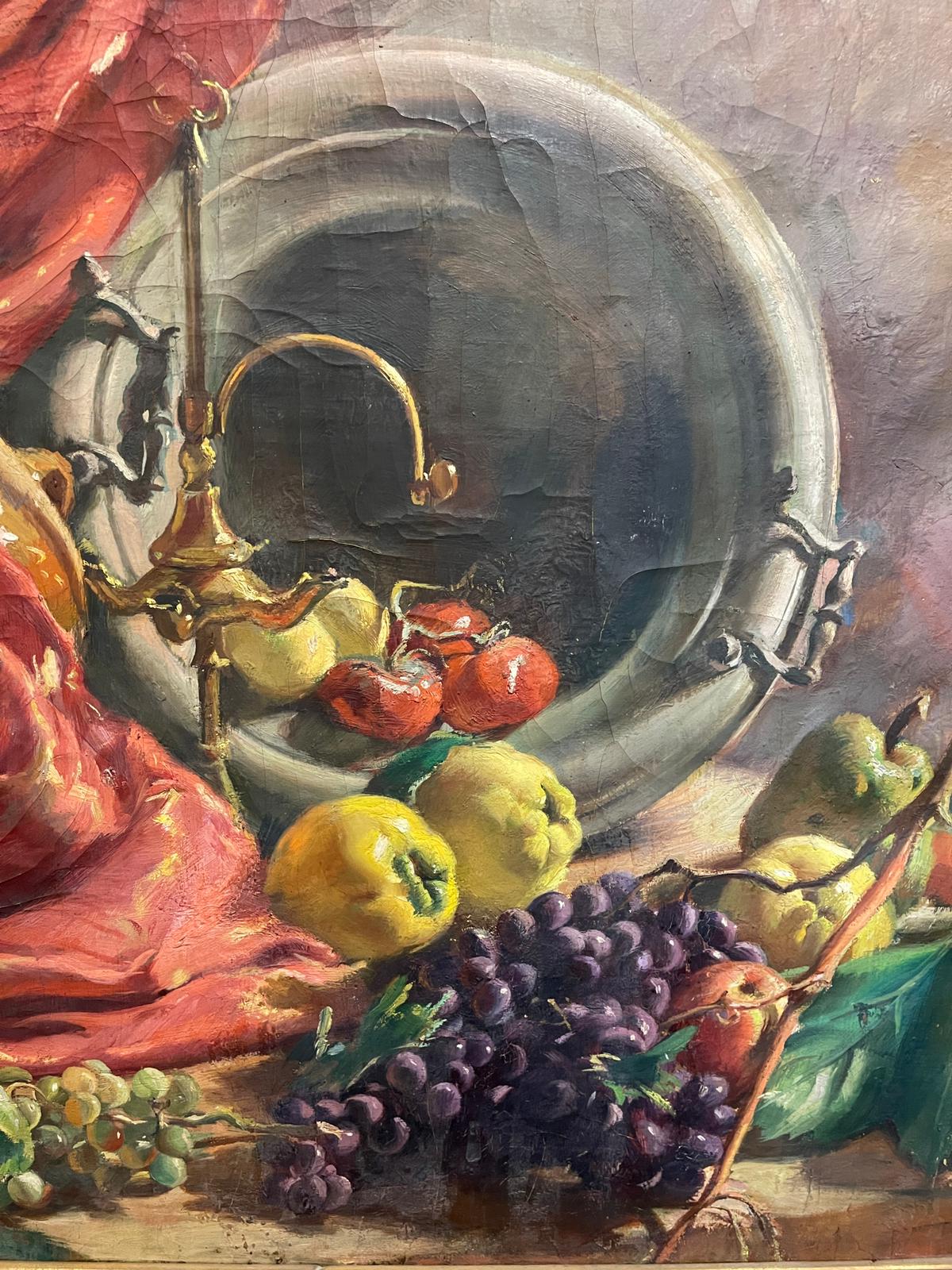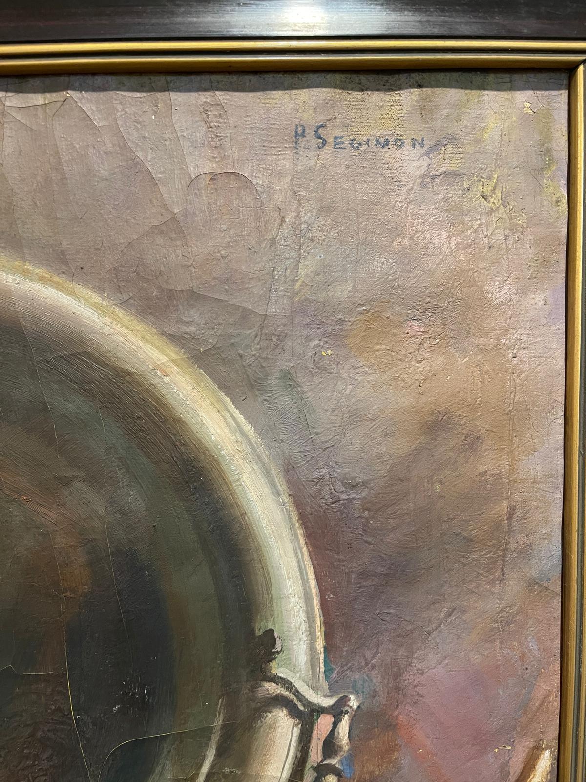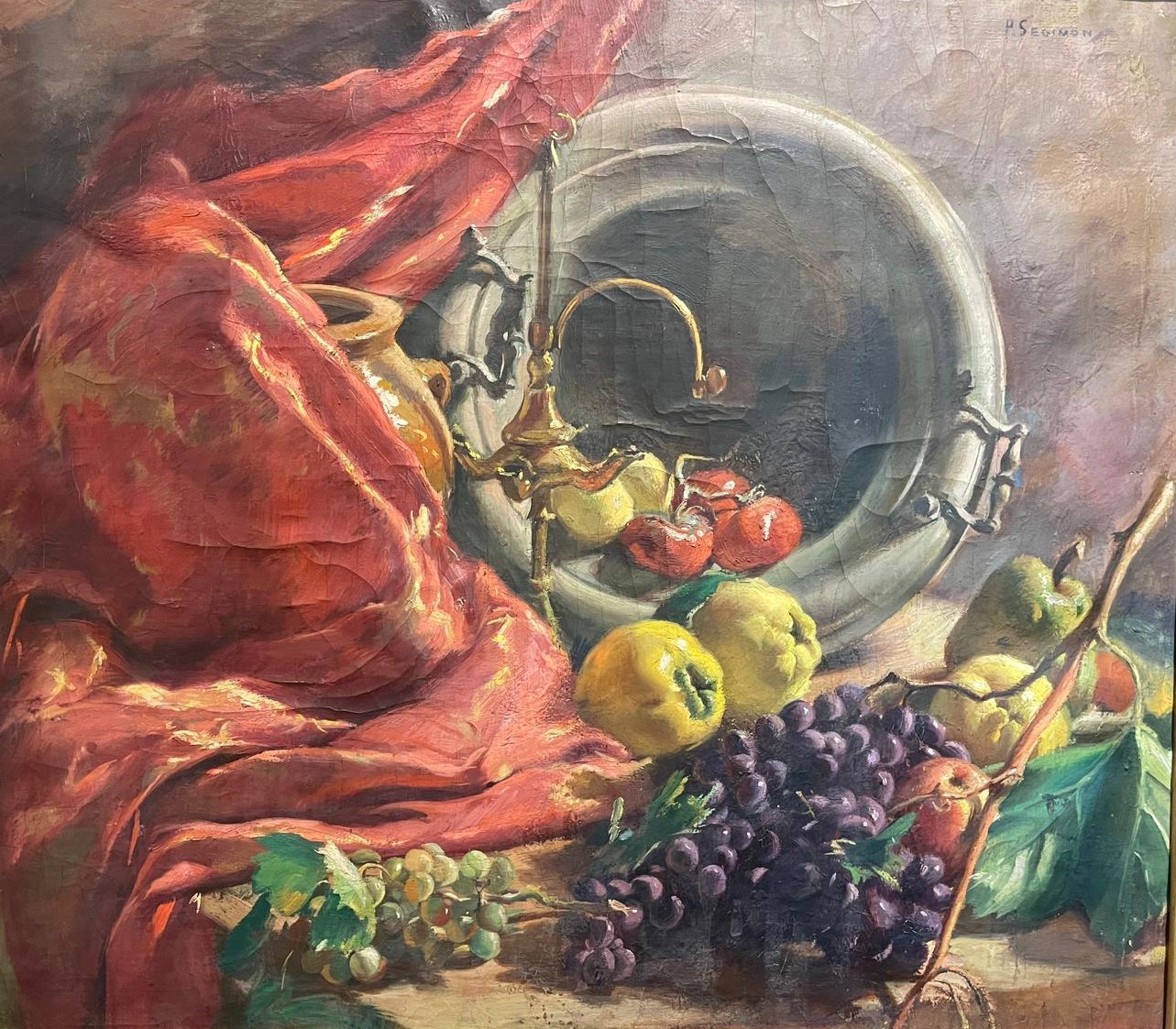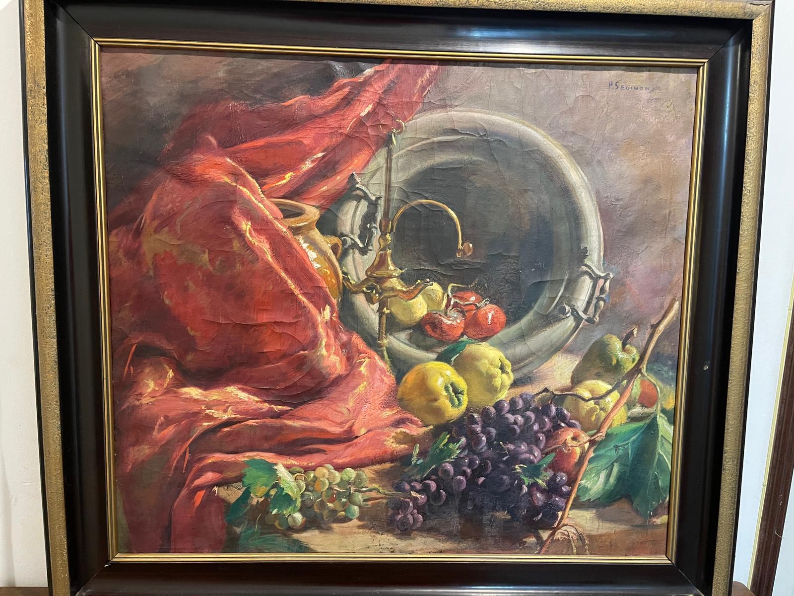 VER IMÁGENES PARA COMPROBAR EL ESTADO REAL.  LAS IMÁGENES FORMAN PARTE DE LA DESCRIPCIÓN.  BODEGÓN CON FRUTAS, PAÑO ROJO Y BRASERO.  FIRMADO EN LA ESQUINA SUPERIOR DERECHA: P. SEGIMON (PERE SEGIMON I CISA).  ACADEMICISMO-REALISMO.  MARCO DE MADERA CON BORDES DORADOS, LIGERAMENTE EROSIONADOS.  LIENZO CON GRIETAS Y CRAQUELADOS. PEQUEÑAS PÉRDIDAS DE PINTURA.  81 X 77 NOTA HISTÓRICA:  Llotja fue discípulo de Fèlix Mestres. Completó sus estudios en París, donde expuso. En 1923 presentó un retrato ecuestre del rey y algunas naturalezas muertas en la Sala Parés de Barcelona. Copió a los maestros del Museo del Prado en Madrid (1927). Exponía repetidamente en las Galerías Augusta (1947-52) y en otras salas de Barcelona. Se especializó principalmente en la figura, y también en flores y naturalezas muertas.