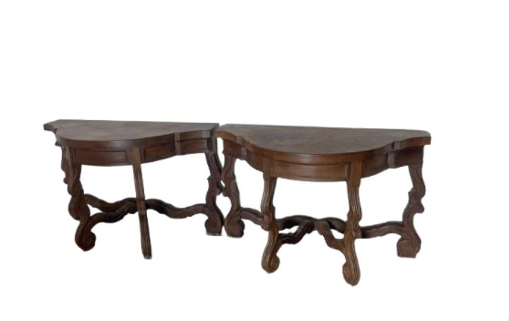 PAREJA DE CONSOLAS O MEDIAS LUNAS. ESTILO BARROCO. MADERA DE NOGAL. ESPAÑA. S. XX
