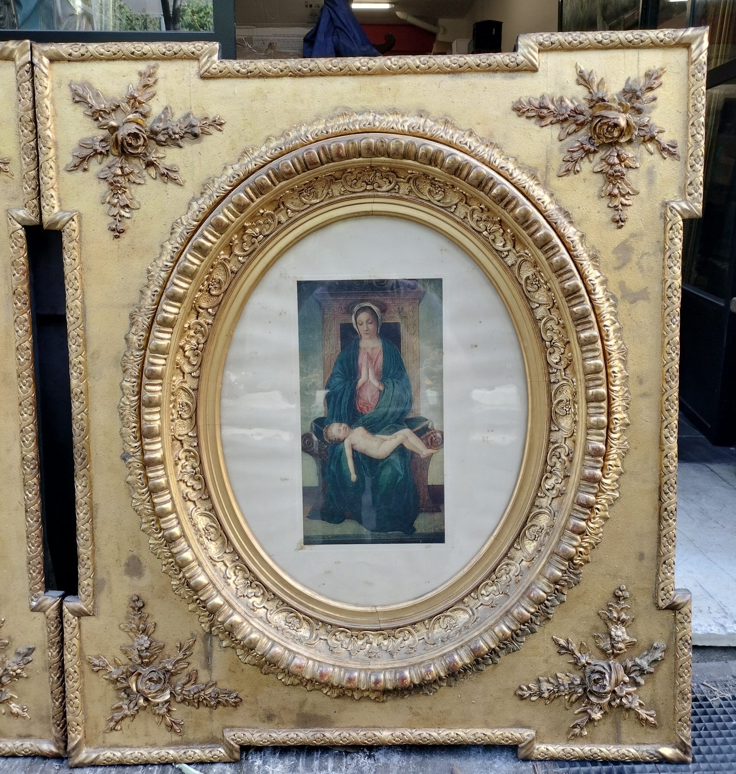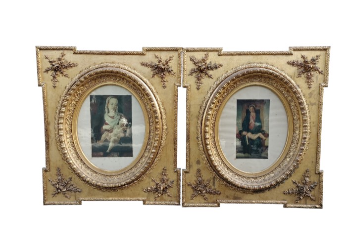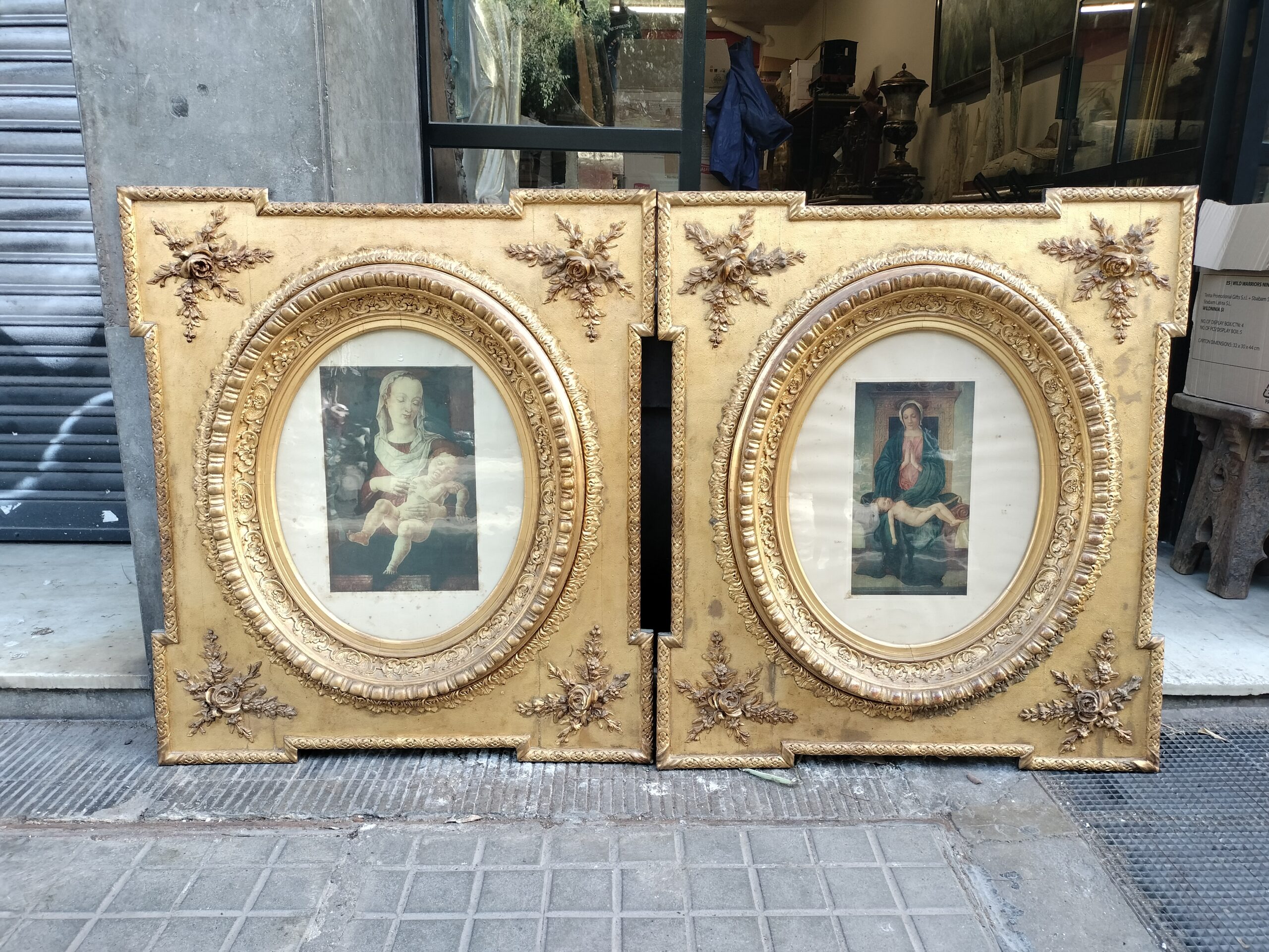 VER IMÁGENES PARA COMPROBAR EL ESTADO REAL. LAS IMÁGENES FORMAN PARTE DE LA DESCRIPCIÓN. PAREJA DE MARCOS. MADERA Y ESTUCO DORADO. GRABADOS ILUMINADOS EN EL INTERIOR. REPRODUCCIÓN DE PINTURAS RELIGIOSAS. VIDRIO PROTECTOR. MARCO OVALADO EN EL INTERIOR, CON CUATRO NIVELES. CENEFAS ORNAMENTADAS CON MOTIVOS VEGETALES. FLORES EN LAS ESQUINAS. PRESENTAN EROSIONES DEBIDO AL TIEMPO. PEQUEÑAS ROTURAS Y MANCHAS. ES RECOMENDABLE UNA RESTAURACIÓN. PAPEL INTERIOR CON MANCHAS DE HUMEDAD. MEDIDAS APROX: 86 ANCHO X 98 LARGO SOLO ESPACIO INTERIOR: 41,5 X 52,5