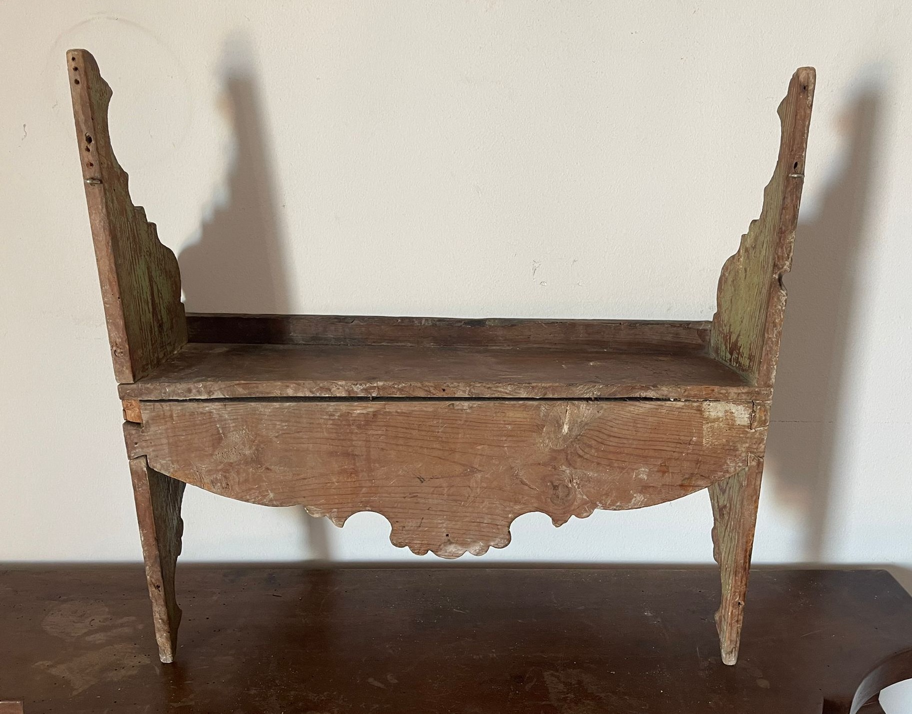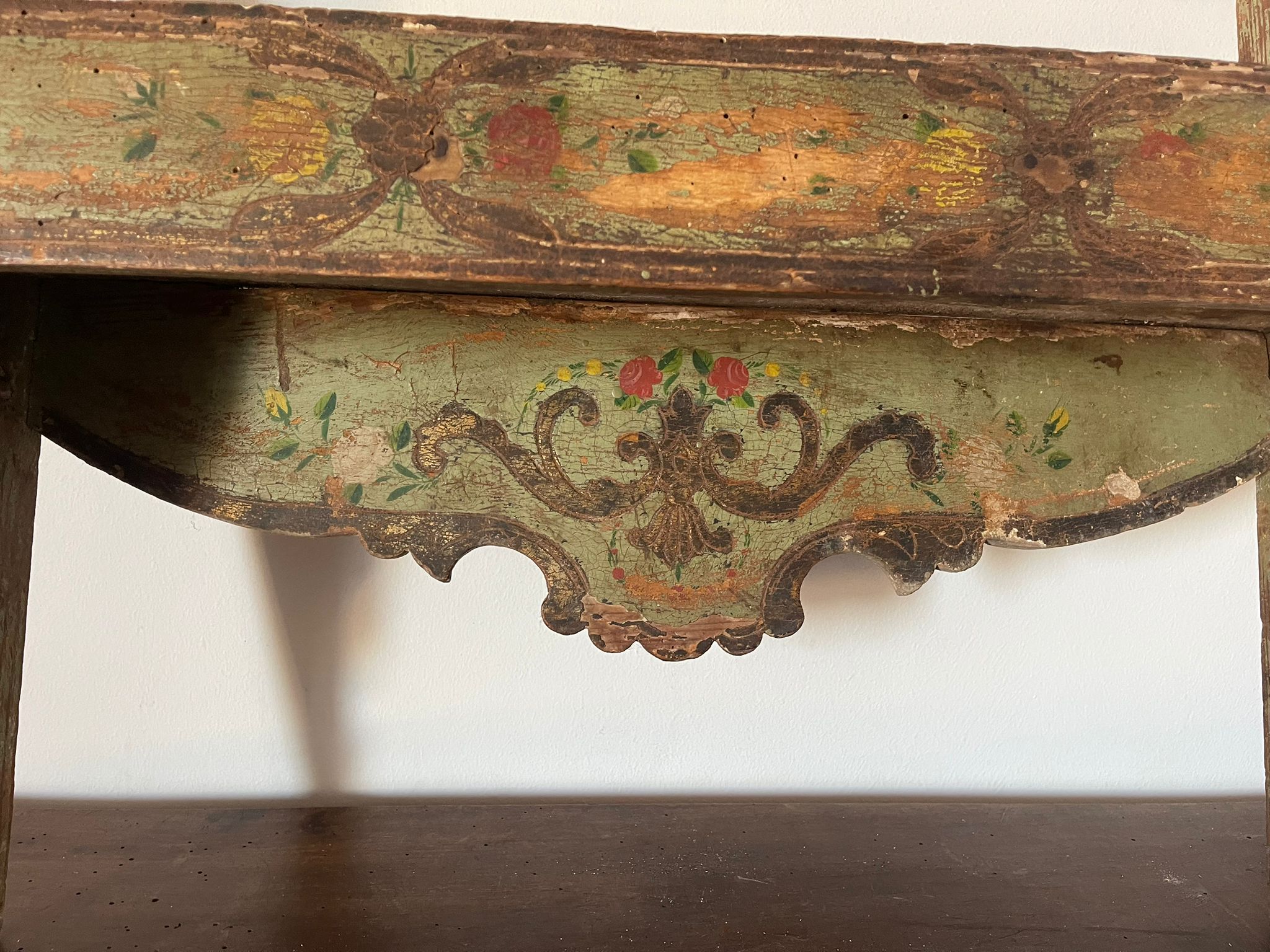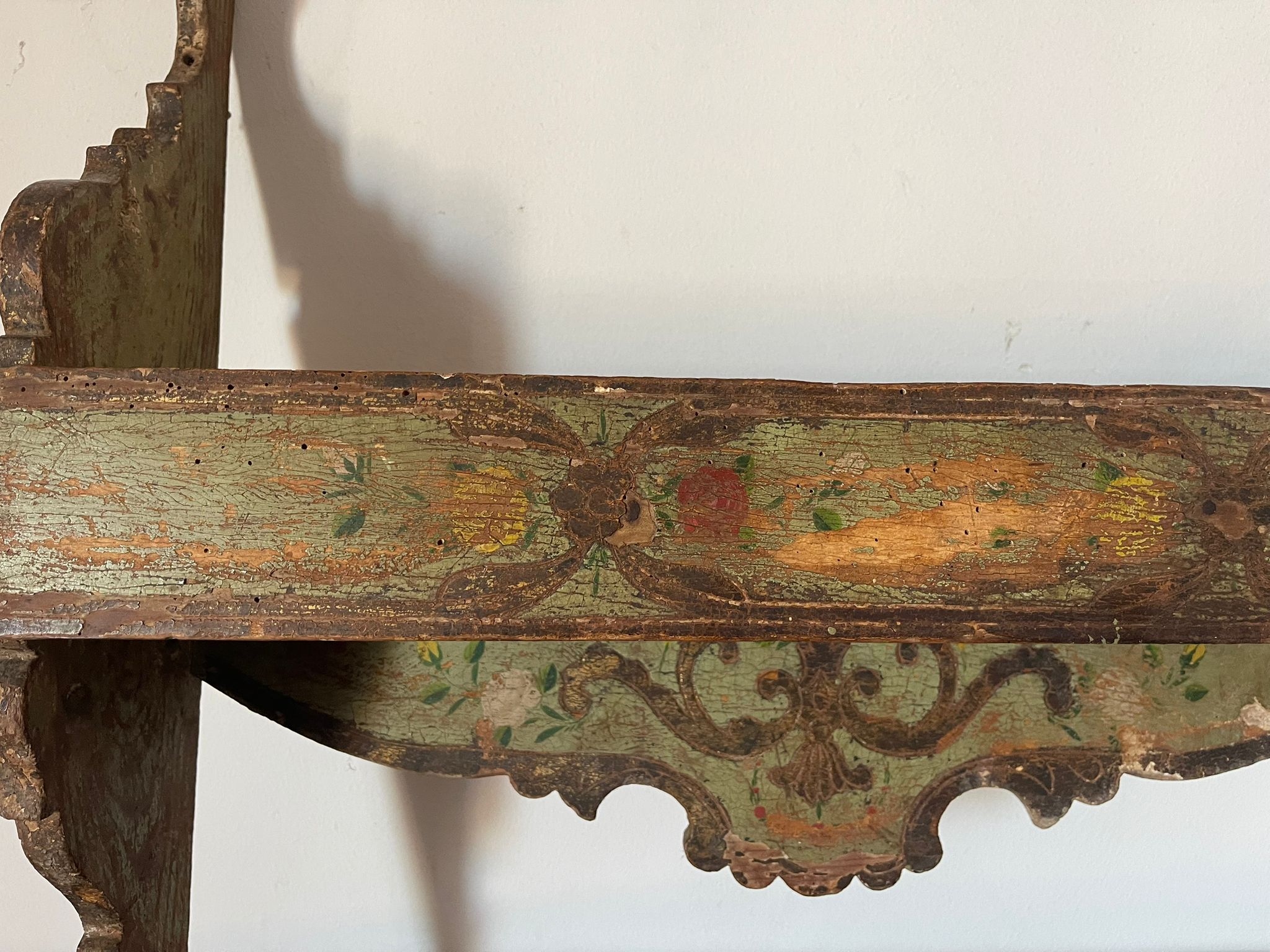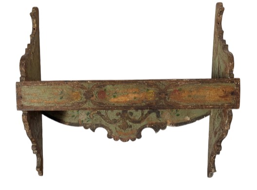 VER IMÁGENES PARA COMPROBAR EL ESTADO REAL. LAS IMÁGENES FORMAN PARTE DE LA DESCRIPCIÓN. REPISA O ESTANTE DE ESTILO BARROCO. DE PARED. MADERA POLICROMADA. TONALIDADES VERDES. ORNAMENTADA CON MOTIVOS VEGETALES. PRESENTA UNA NOTABLE PÉRDIDA DE LA SUPERFICIE PICTÓRICA, ESPECIALMENTE EN LAS ALAS LATERALES. SE APRECIA CRAQUELADO Y RESTOS DE CARCOMA. EROSIONES GENERALES DEBIDO AL USO.
