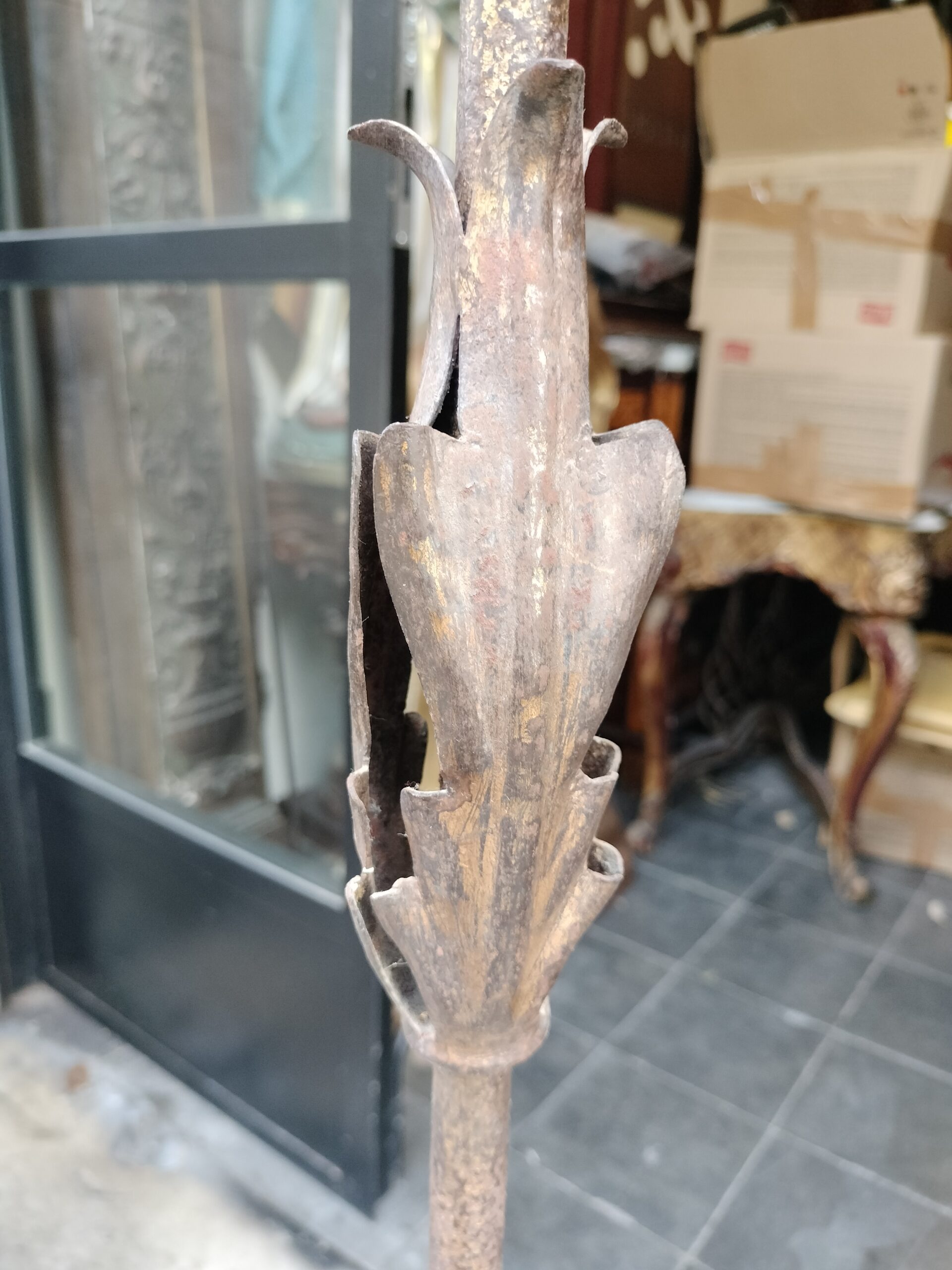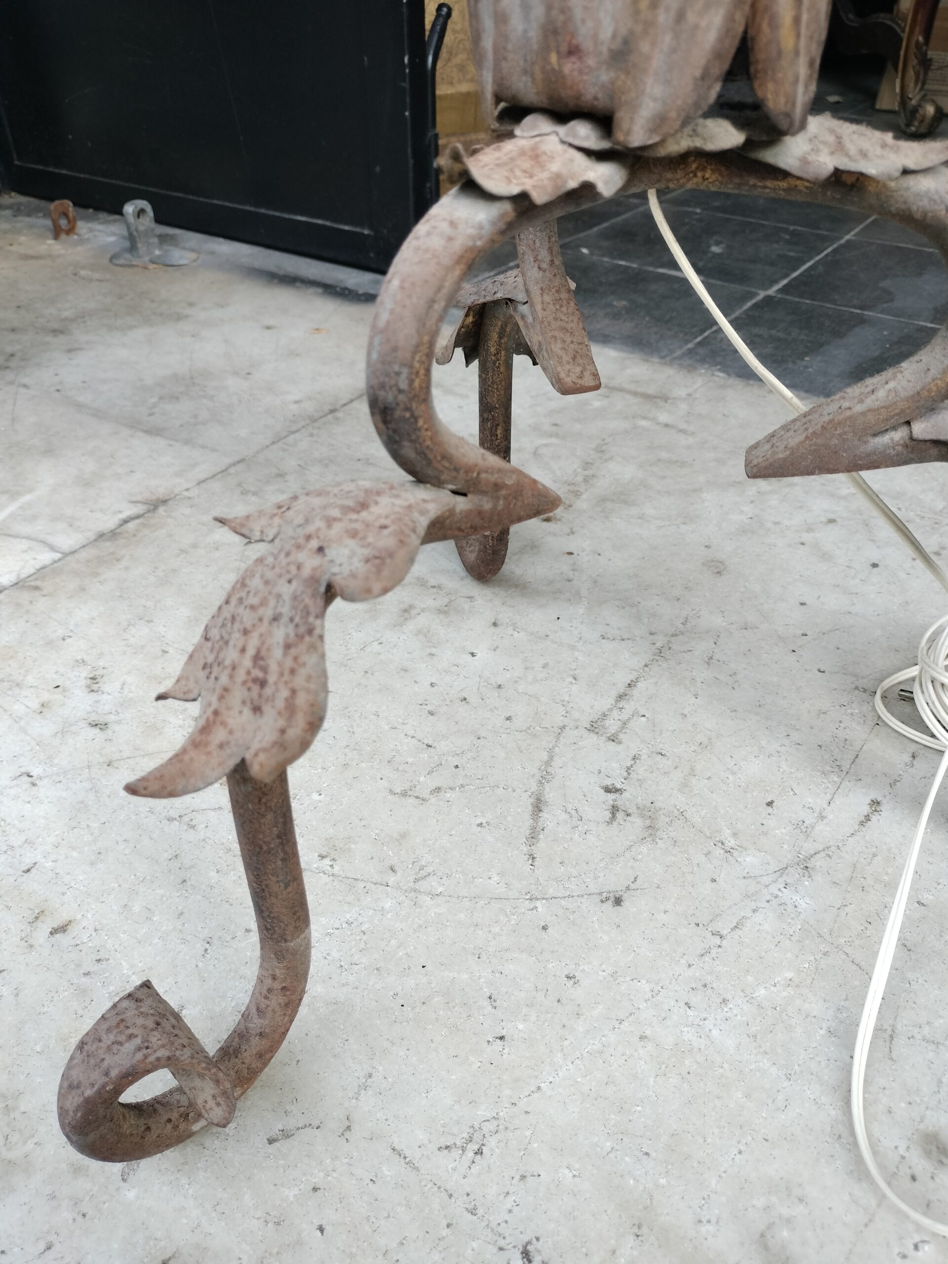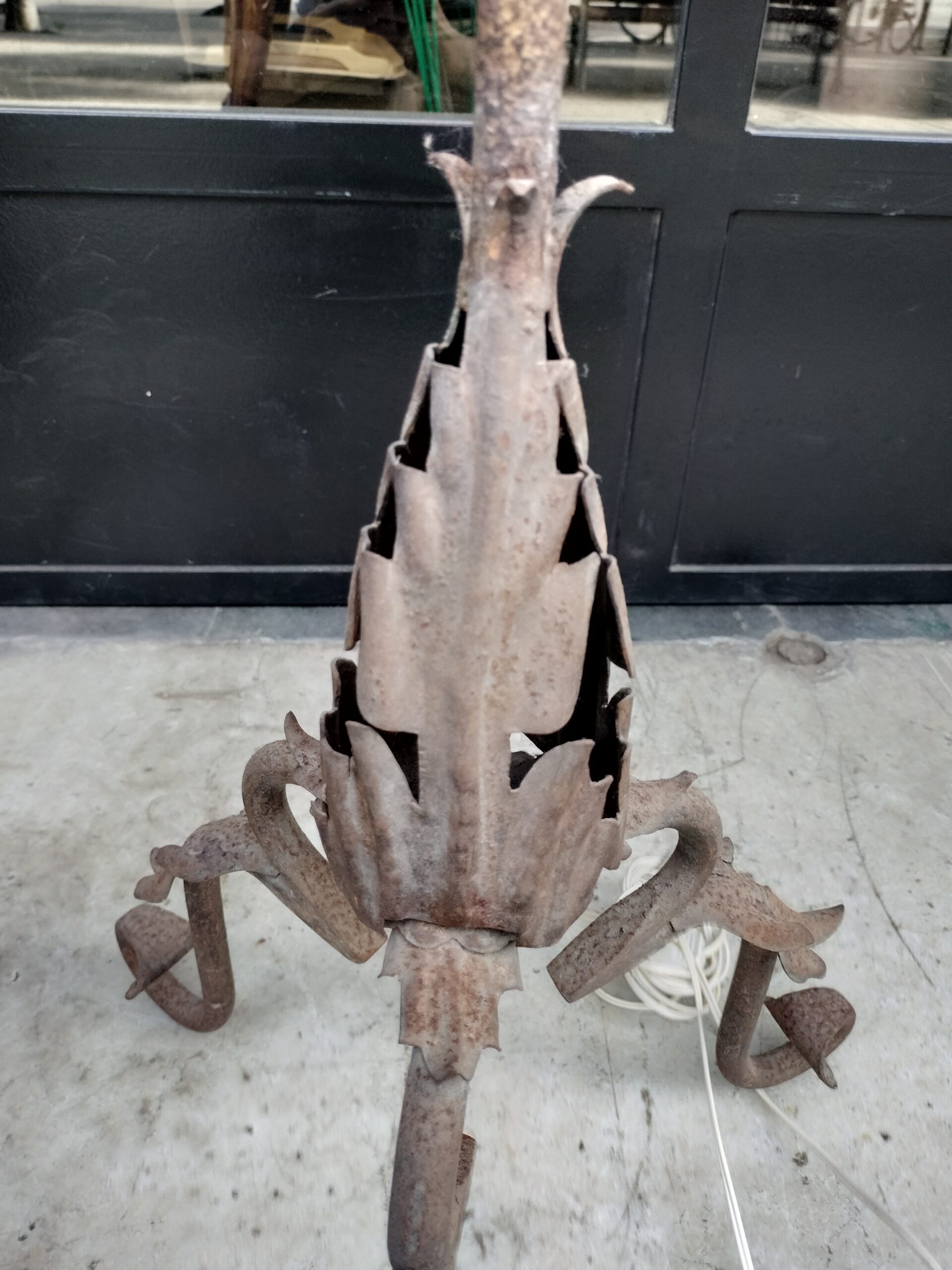 LÁMPARA-HACHERO DE IGLESIA. HIERRO FORJADO. PANTALLA DE PIEL. ESPAÑA. XX