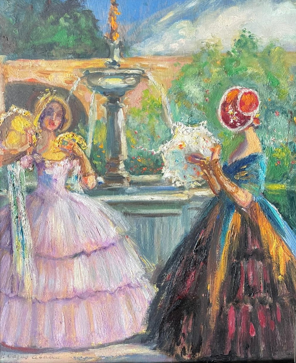 CASAS ABARCA. MUJERES EN EL JARDÍN. ÓLEO SOBRE MADERA. ESPAÑA. XIX-XX