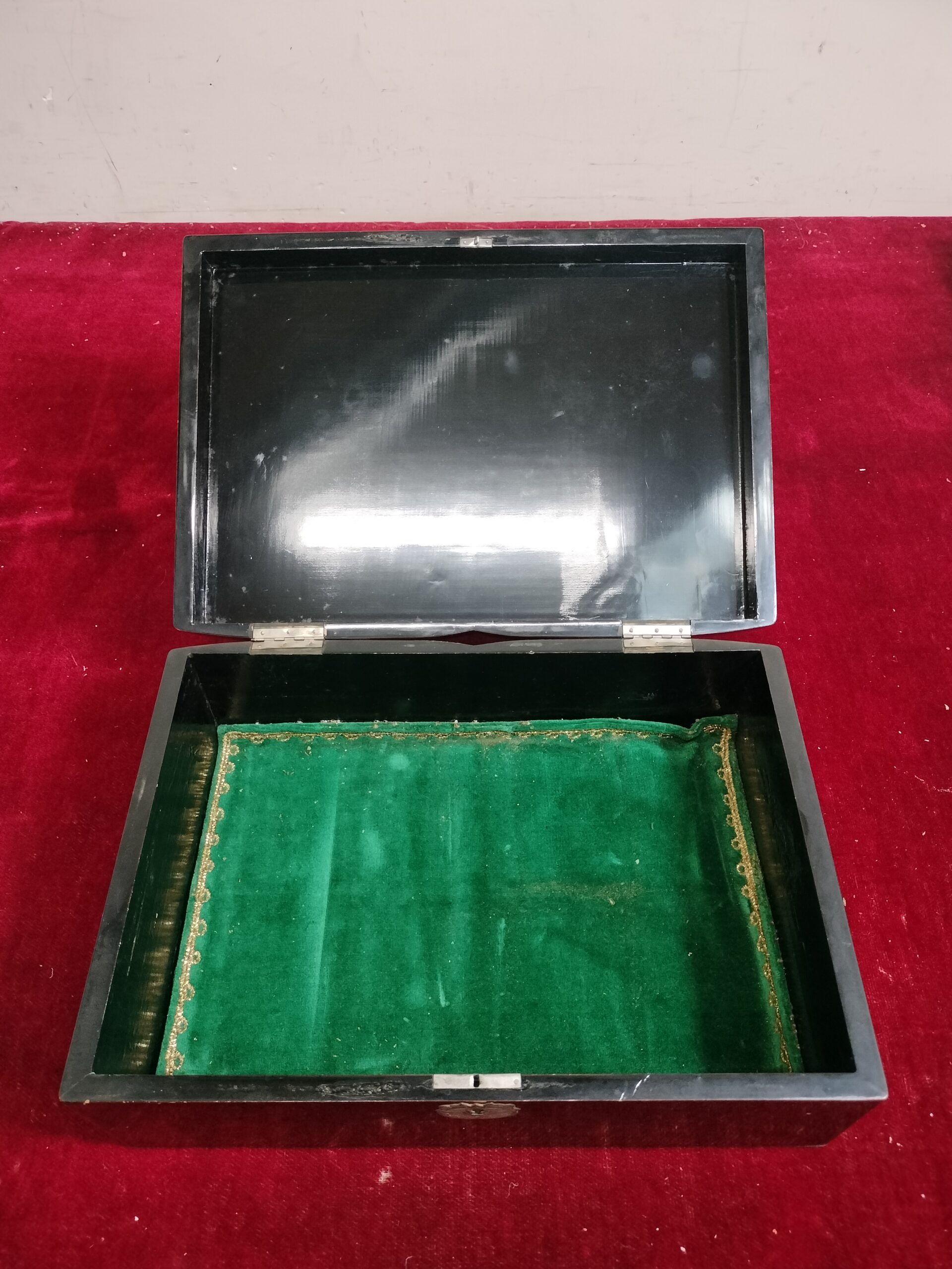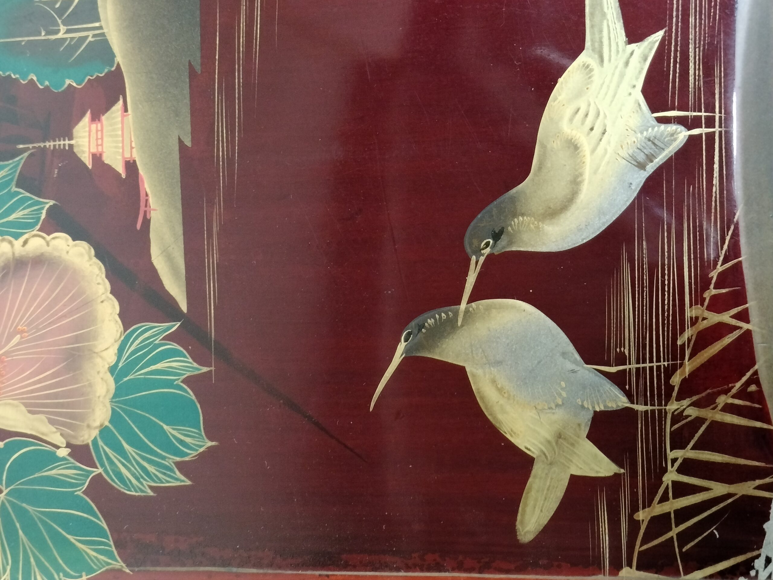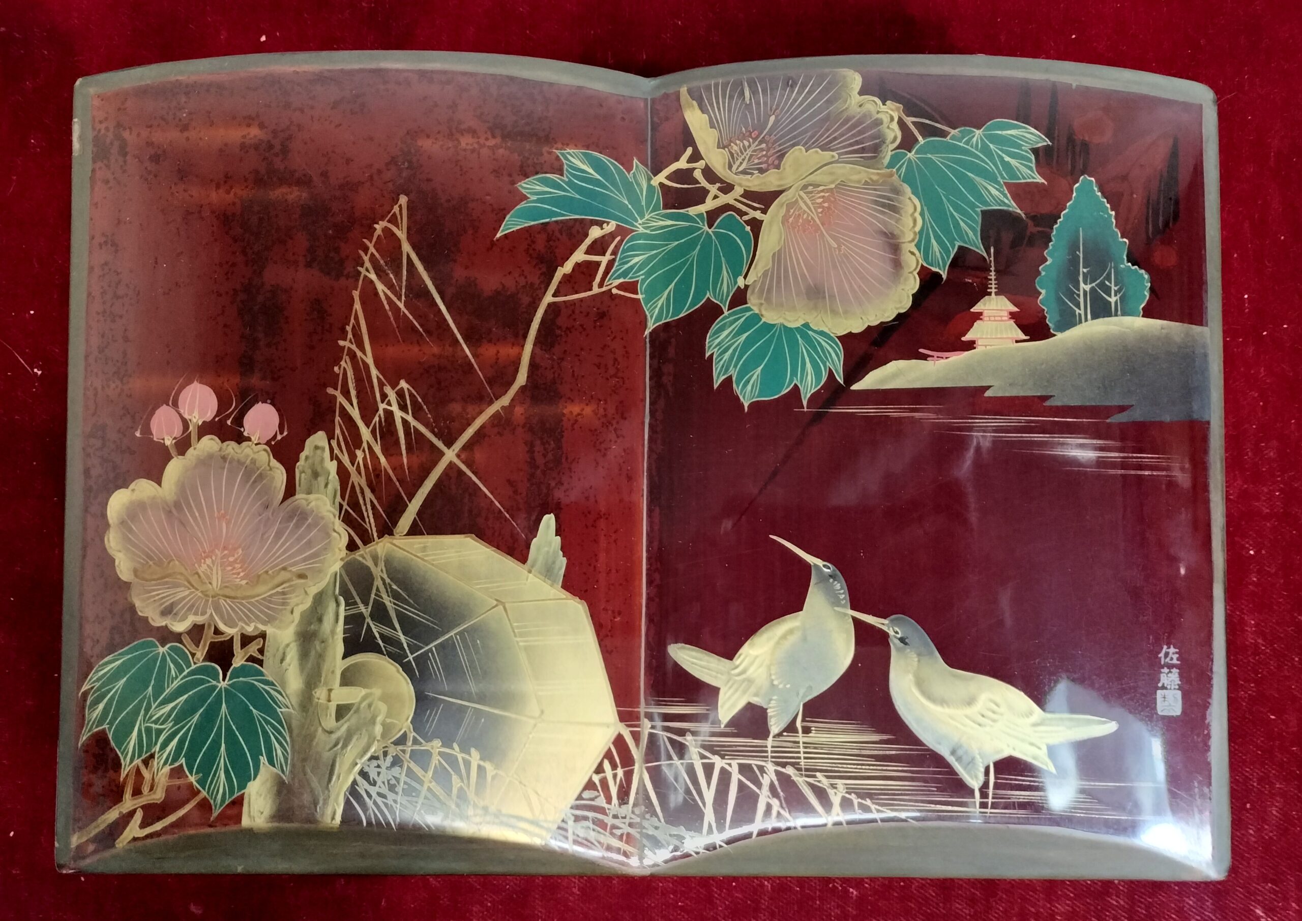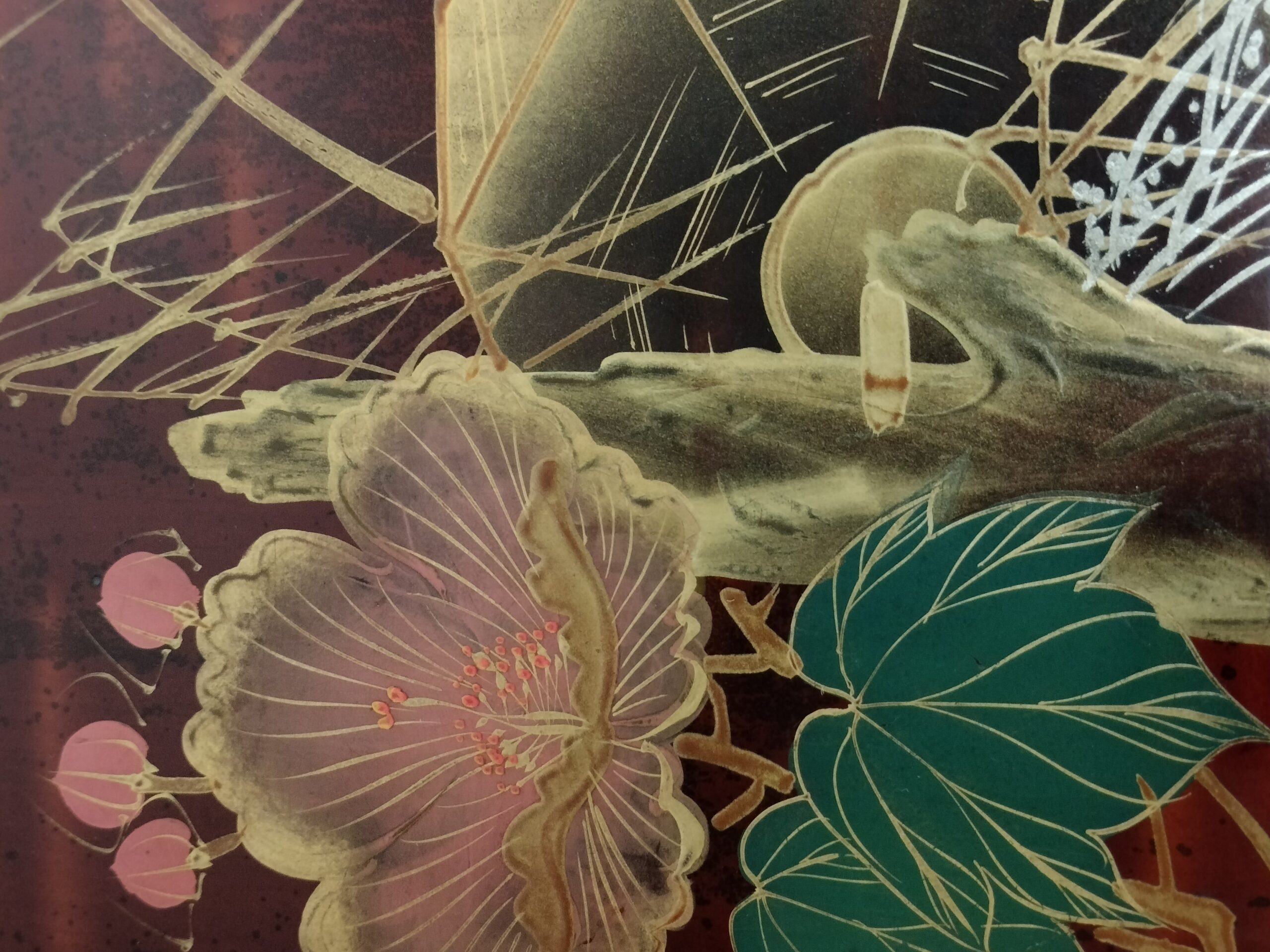 VER IMÁGENES PARA COMPROBAR EL ESTADO REAL. LAS IMÁGENES FORMAN PARTE DE LA DESCRIPCIÓN. SIN LLAVE. PINTURA FIJADA EN LACA, CON LÍNIAS EN RELIEVE (TAKAMAKI-E) Y EN PLANO (HIRAMAKI-E). CON MOTIVOS DE FLORES, HOJAS Y PÁJAROS. TAPA ABOMBADA Y FONDO MARRÓN ROJIZO BRILLANTE. INTERIOR FORRADO. FIRMADO. PRESENTA LIGEROS RASGUÑOS Y EROSIONES.