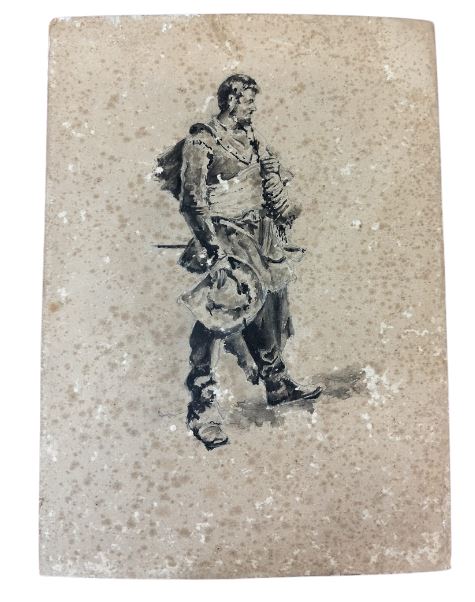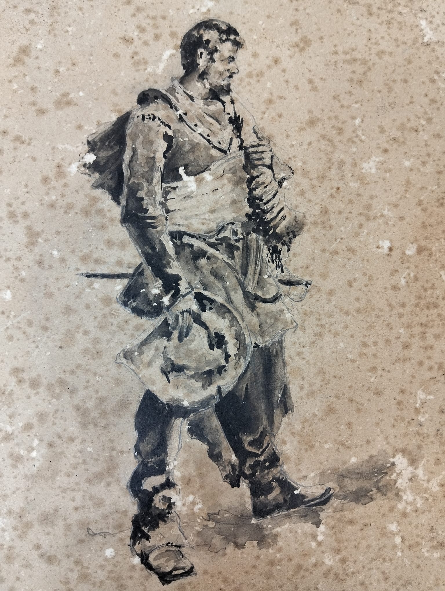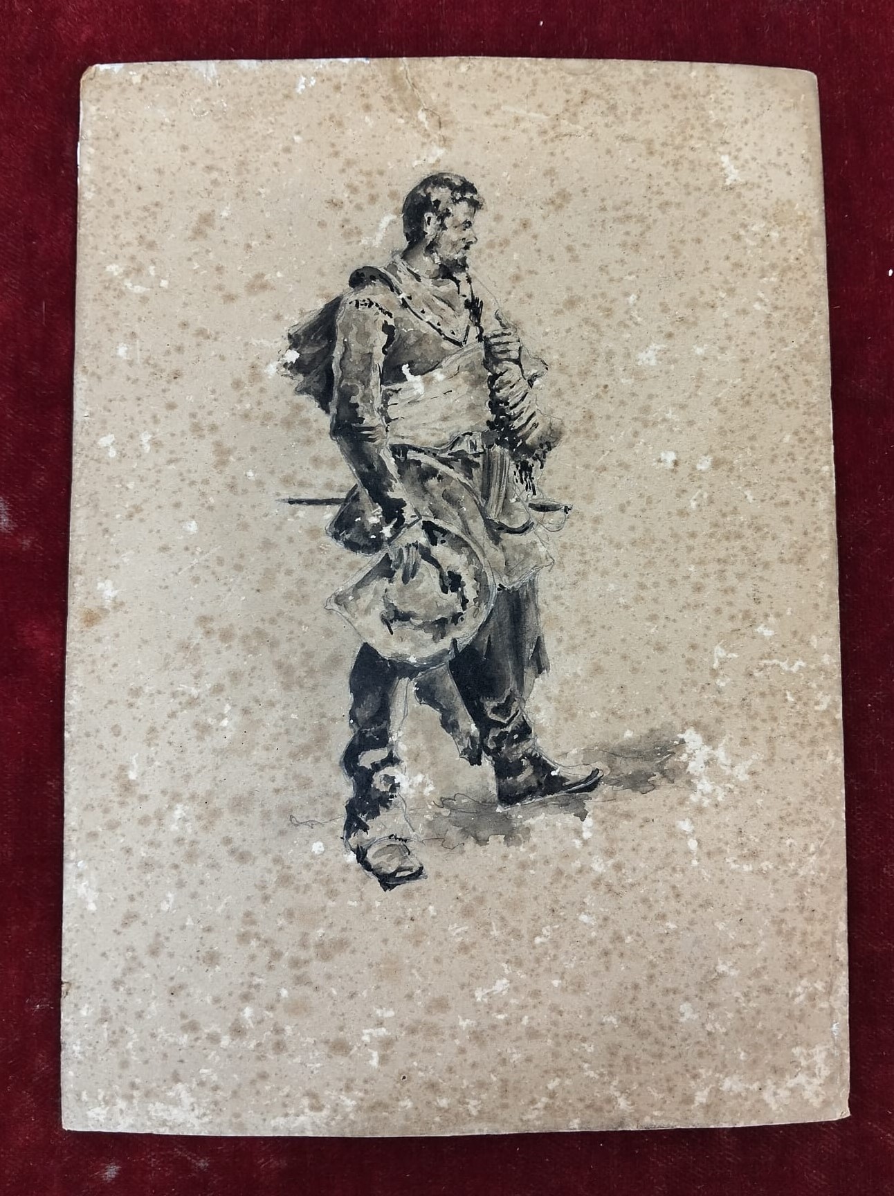 ESCENA DE ESPADACHÍN DIECIOCHESCO. TINTA AGUADA Y PLUMILLA SOBRE CARTÓN. ESPAÑA. XIX