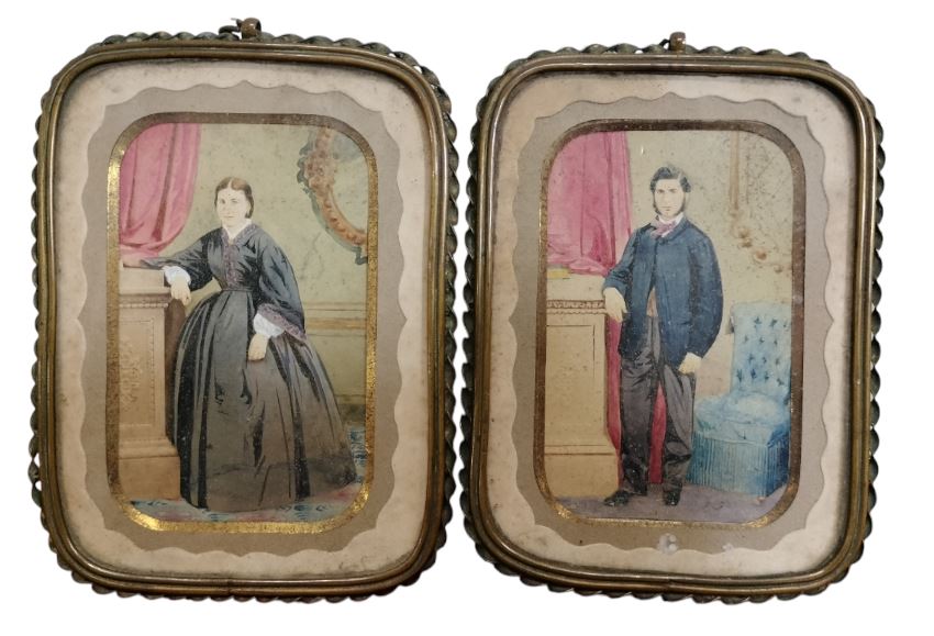 PAREJA DE RETRATOS. ALBÚMINA COLOREADA A MANO. TÉCNICA MIXTA. ESPAÑA (?). SIGLO XIX