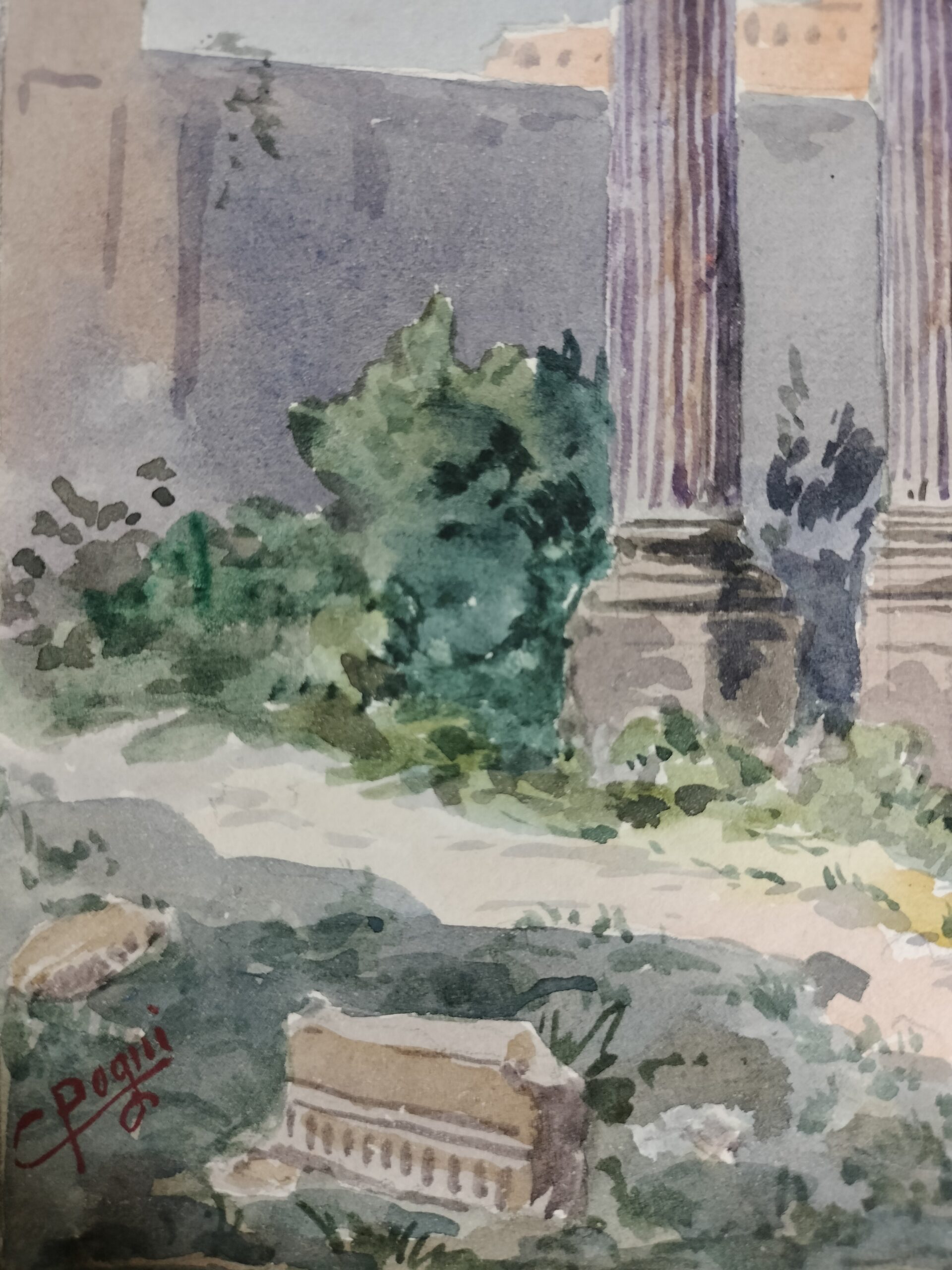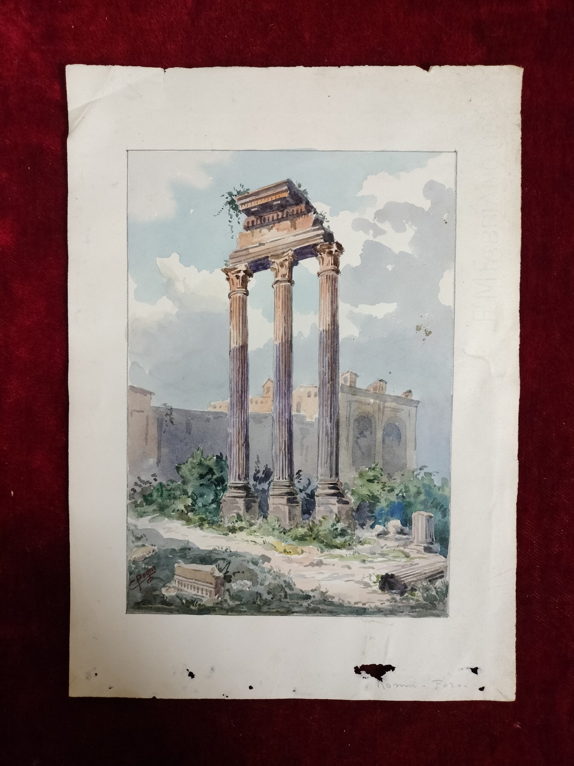 VER IMÁGENES PARA COMPROBAR EL ESTADO REAL.  LAS IMÁGENES FORMAN PARTE DE LA DESCRIPCIÓN.  PAREJA DE ACUARELAS PAISAJÍSTICAS. ITALIA (?). SIGLOS XIX-XX.  FIRMADAS C. POGMI (?). VISTAS DEL FORO ROMANO TEMPLO VESPASIANO Y TEMPLO DE CÁSTOR Y PÓLUX.  SIN ENMARCAR.  PRESENTA VARIAS AGUJEROS Y ROTURAS. VER IMÁGENES. ROTURAS EN LOS BORDES.  MEDIDAS APROX:  PAPEL: 25,8 X 33,5 SOLO ACUARELA:  23,5 X 29,3