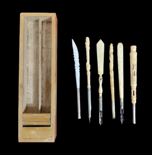 COLECCIÓN DE PLUMAS Y ESTUCHE. HUESO Y NÁCAR. ESPAÑA. SIGLO XIX.