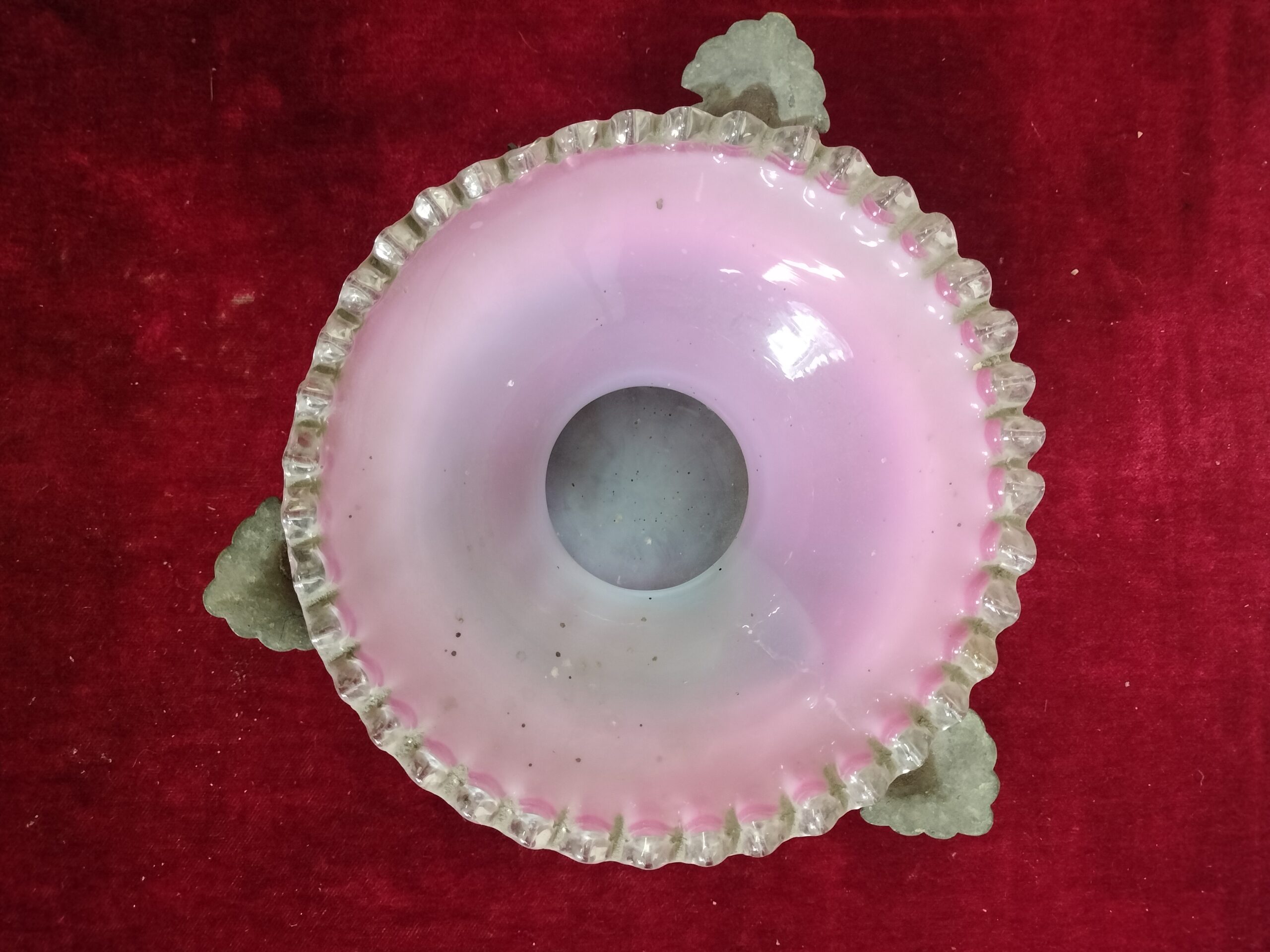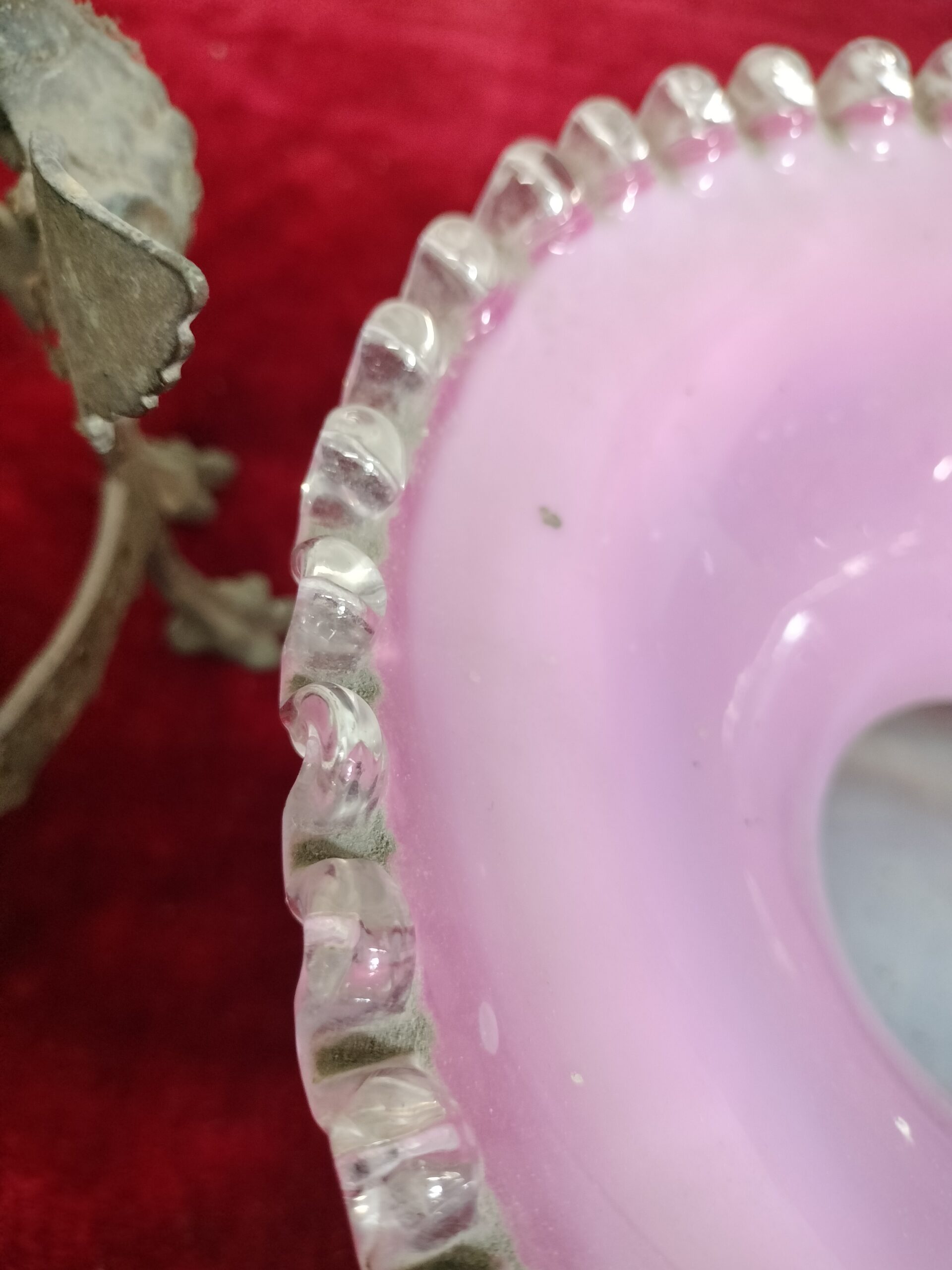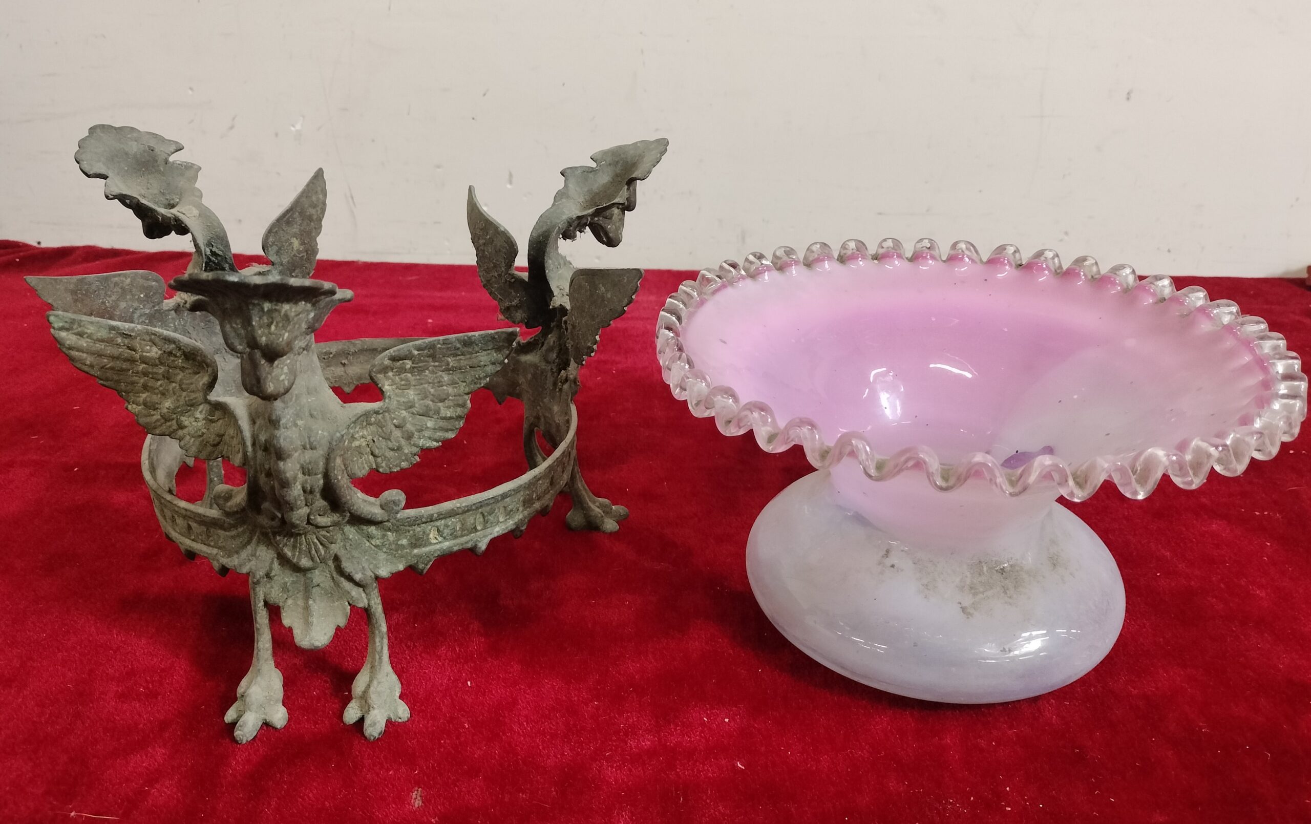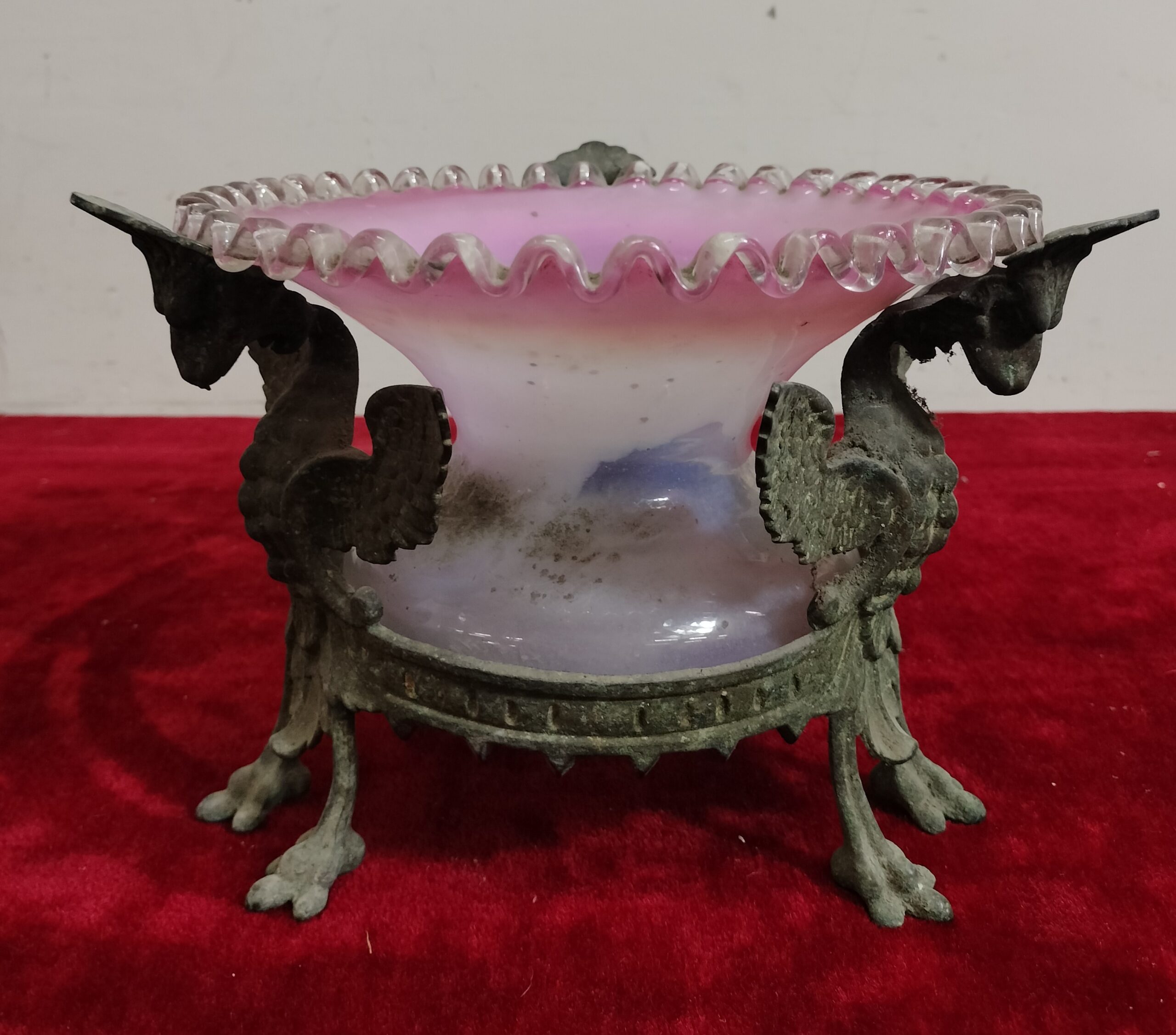 VER IMÁGENES PARA COMPROBAR EL ESTADO REAL. LAS IMÁGENES FORMAN PARTE DE LA DESCRIPCIÓN. JARRÓN DECORATIVO O CENTRO. CRISTAL SOPLADO Y HIERRO FORJADO. ESPAÑA (?). XIX-XX SIN FIRMA NI MARCA DE AUTOR. ESTRUCTURA EN HIERRO FORJADO. ORNADO CON FIGURAS DE GRIFOS. CRISTAL ROSADO, BORDES DECORADOS CON ONDULACIONES. PRECISA LIMPIEZA. SUCIEDAD Y LIGEROS RASGUÑOS. LA ESTRUCTURA DE HIERRO PRESENTA NOTABLES RESTOS DE ÓXIDO. VER IMÁGENES. MEDIDAS APROX: ESTRUCTURA DE HIERRO: 25 X 28 X 18 BOCA JARRÓN: 22,7 X 22 BASE JARRÓN: 14 X 14. ALTO JARRÓN: 12,5