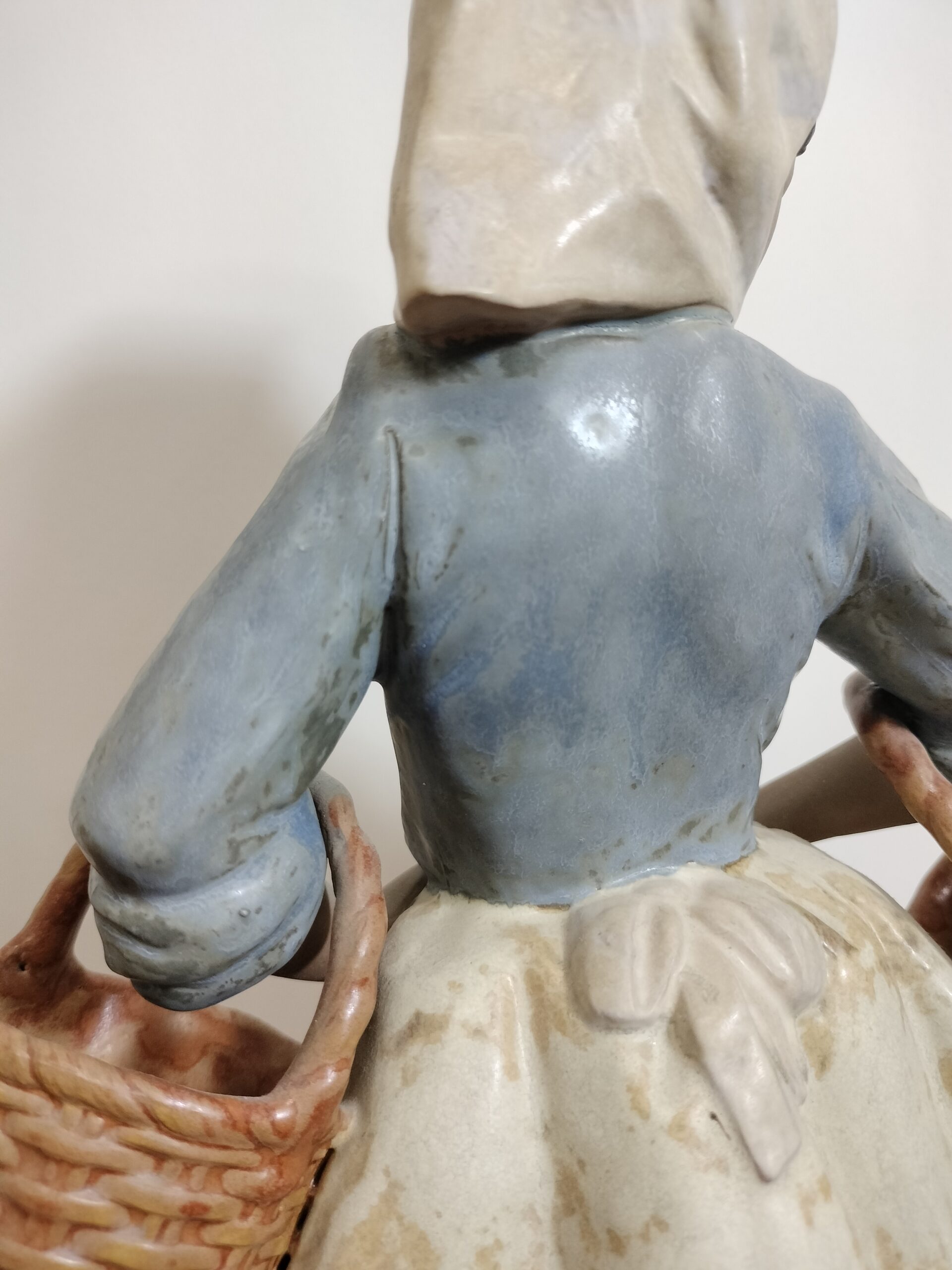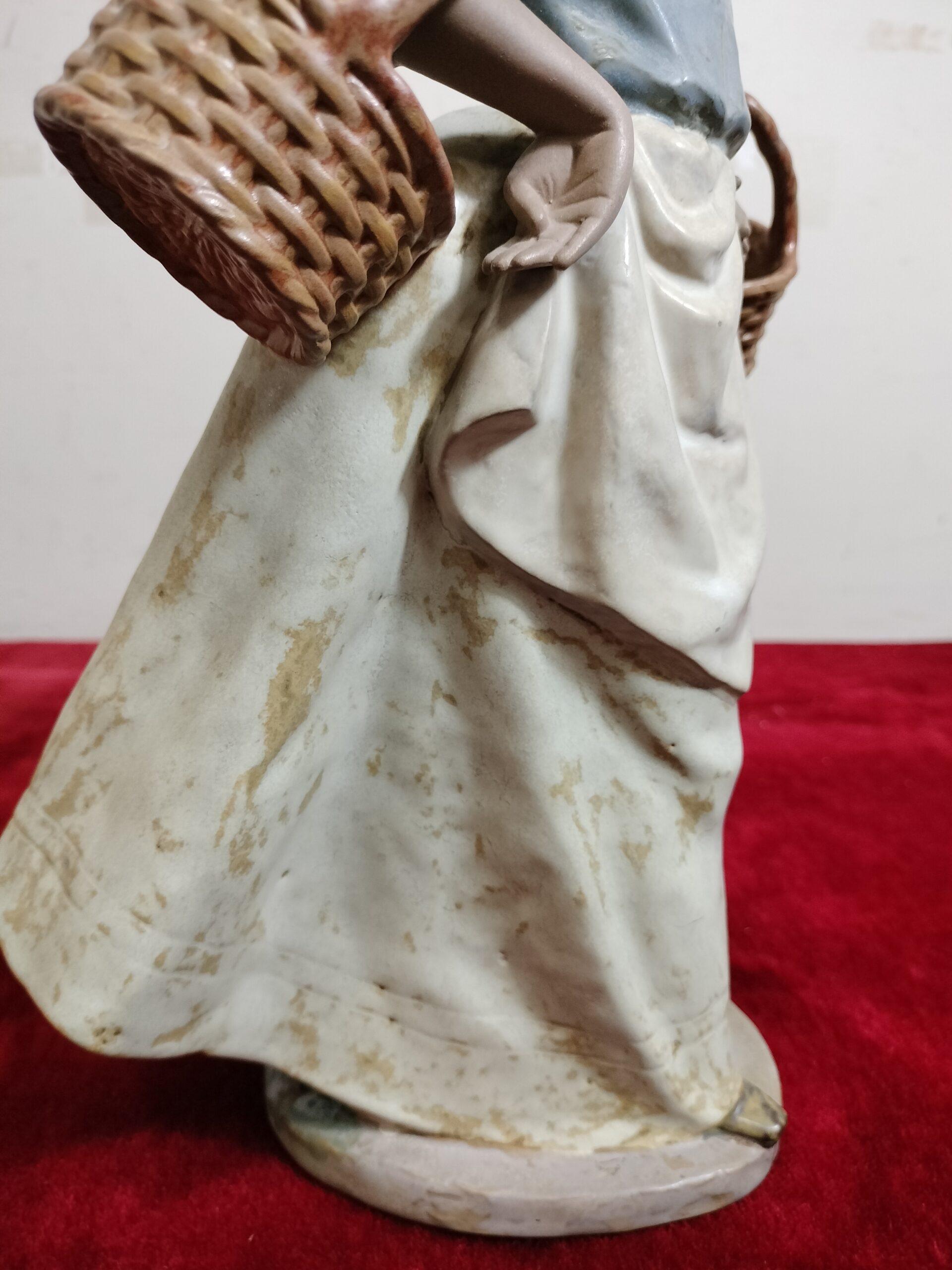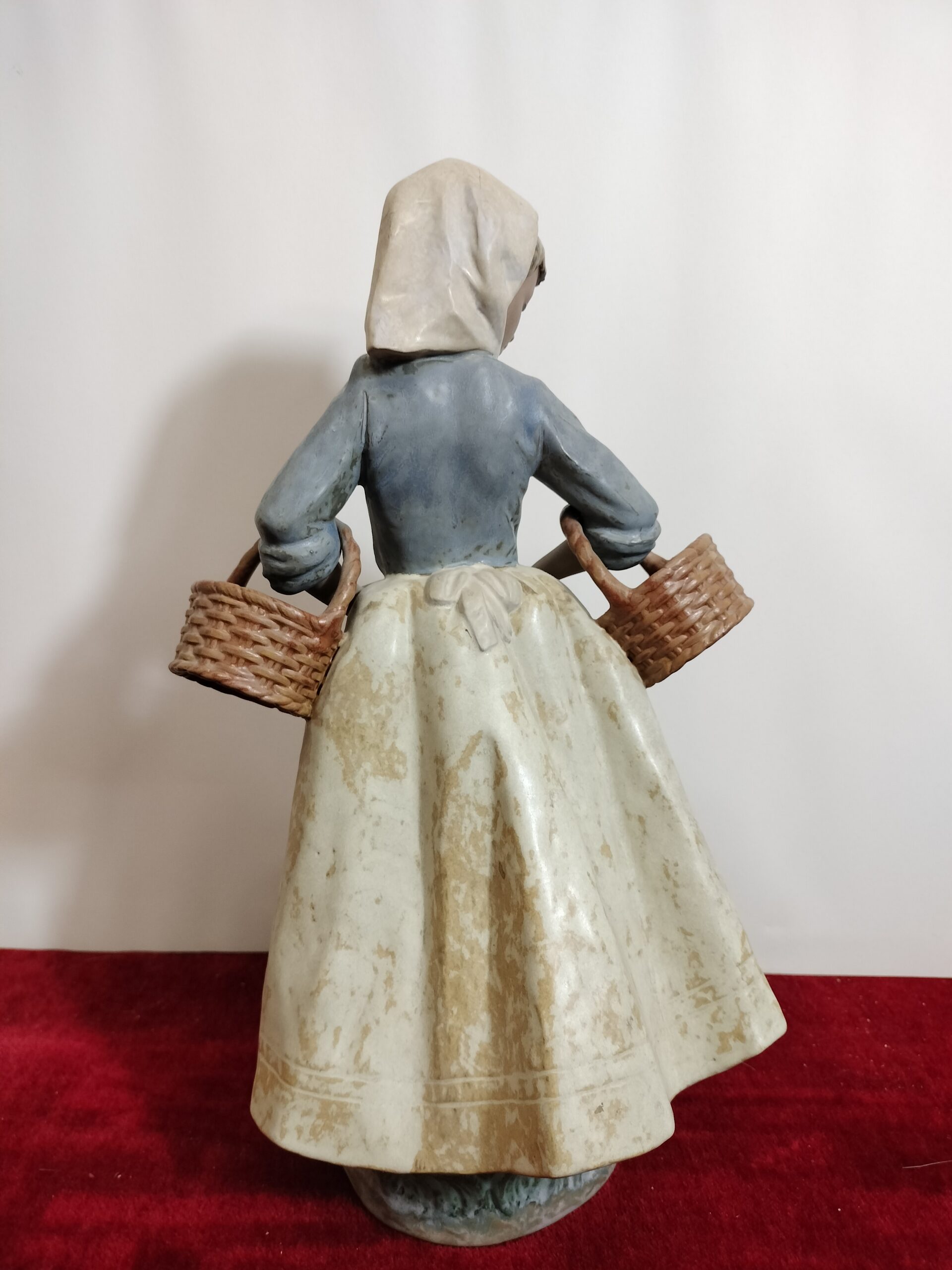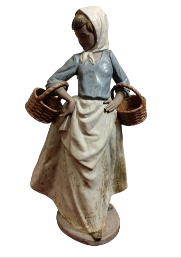 VER IMÁGENES PARA COMPROBAR EL ESTADO REAL.  LAS IMÁGENES FORMAN PARTE DE LA DESCRIPCIÓN.  MUJER CON DOS CESTAS VACÍAS. CERÁMICA DE LLADRÓ. ESPAÑA. XX NAO, MADE IN SPAIN. BY LLADRÓ.  ESMALTADO.  PRESENTA NOTABLES DESGASTES, ESPECIALMENTE EN LA FALDA. PÉRDIDA DE ESMALTE Y MANCHAS. VER IMÁGENES.