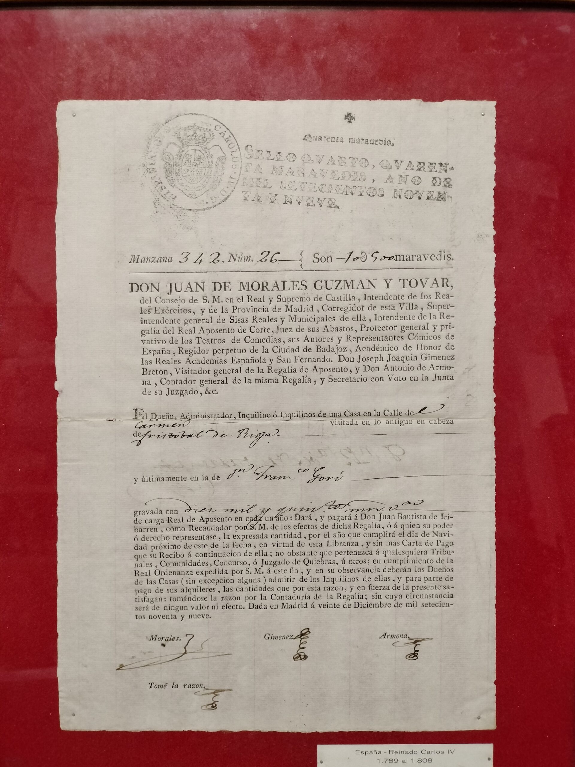 VER IMÁGENES PARA COMPROBAR EL ESTADO REAL. MARCO DE MADERA DORADO, CON LIGEROS RASGUÑOS. VIDRIO PROTECTOR. ANTIGUO DOCUMENTO RELATIVO A LOS DEBERES DE PAGO DE LA CARGA REAL DE APOSENTO DEL PROPIETARIO DE LA CALLE DEL CARMEN, MADRID. FIRMADA EN LA PARTE INFERIOR Y FECHADO: DICIEMBRE, 1799. SOBRE PAPEL VERJURADO. ETIQUETA EN LA PARTE INFERIOR DEL MARCO: ESPAÑA – REINADO CARLOS IV. 1789 A 1808. NO DISPONEMOS DE CERTIFICADO DE AUTENTICIDAD NI PODEMOS GARANTIZARLA. MEDIDAS: MARCO: 34 X 44 DOCUMENTO: 21,5 X 31,5