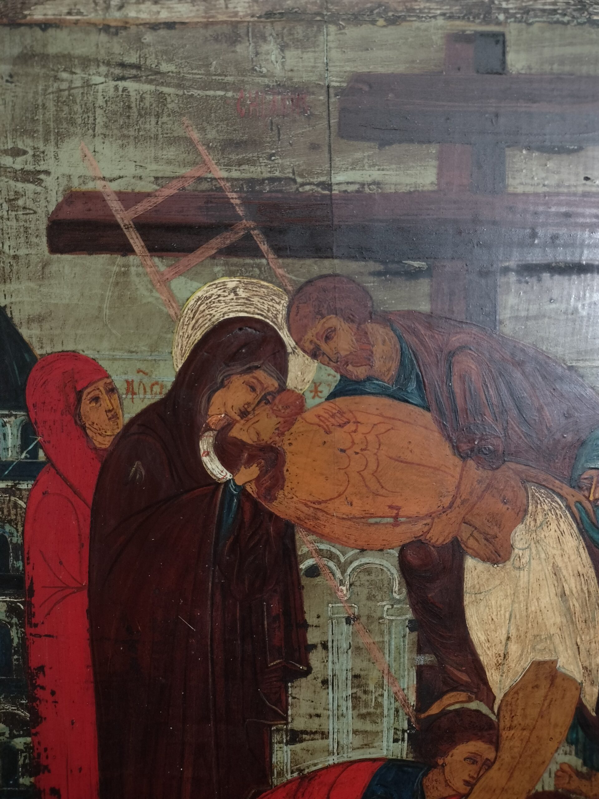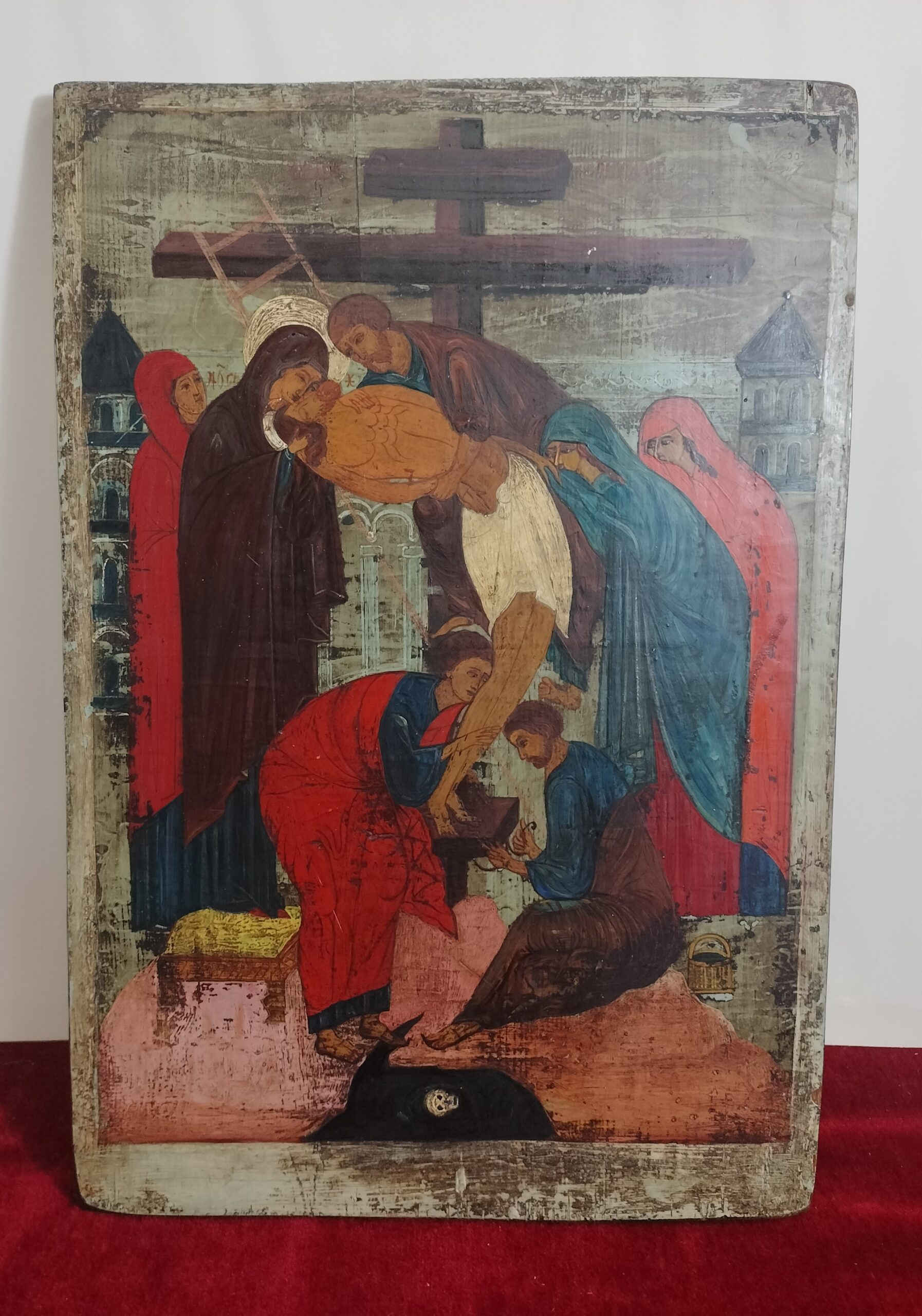 VER IMÁGENES PARA COMPROBAR EL ESTADO REAL. LAS IMÁGENES FORMAN PARTE DE LA DESCRIPCIÓN. DESCENDIMIENTO DE LA CRUZ. TEMPLE SOBRE TABLA. RUSIA. SIGLOS XIX-XX. A PARTIR DE UN ORIGINAL EXPUESTO EN LA GALERIA TRETIAKOV DE MOSCÚ (SIGLO XV). ESTILO GÓTICO BIZANTINO. PRESENTA UNAS PEQUEÑAS INSCRIPCIONES EN ROJO EN LA PARTE SUPERIOR. BARNIZ ENVEJECIDO. RESTOS DE SUCIEDAD. PRECISA RESTAURACIÓN. 32,5 X 48 X 2