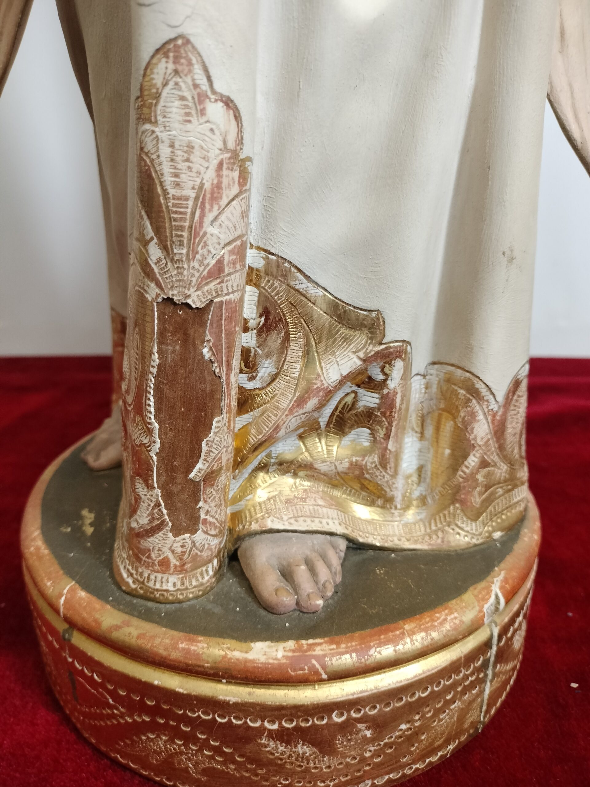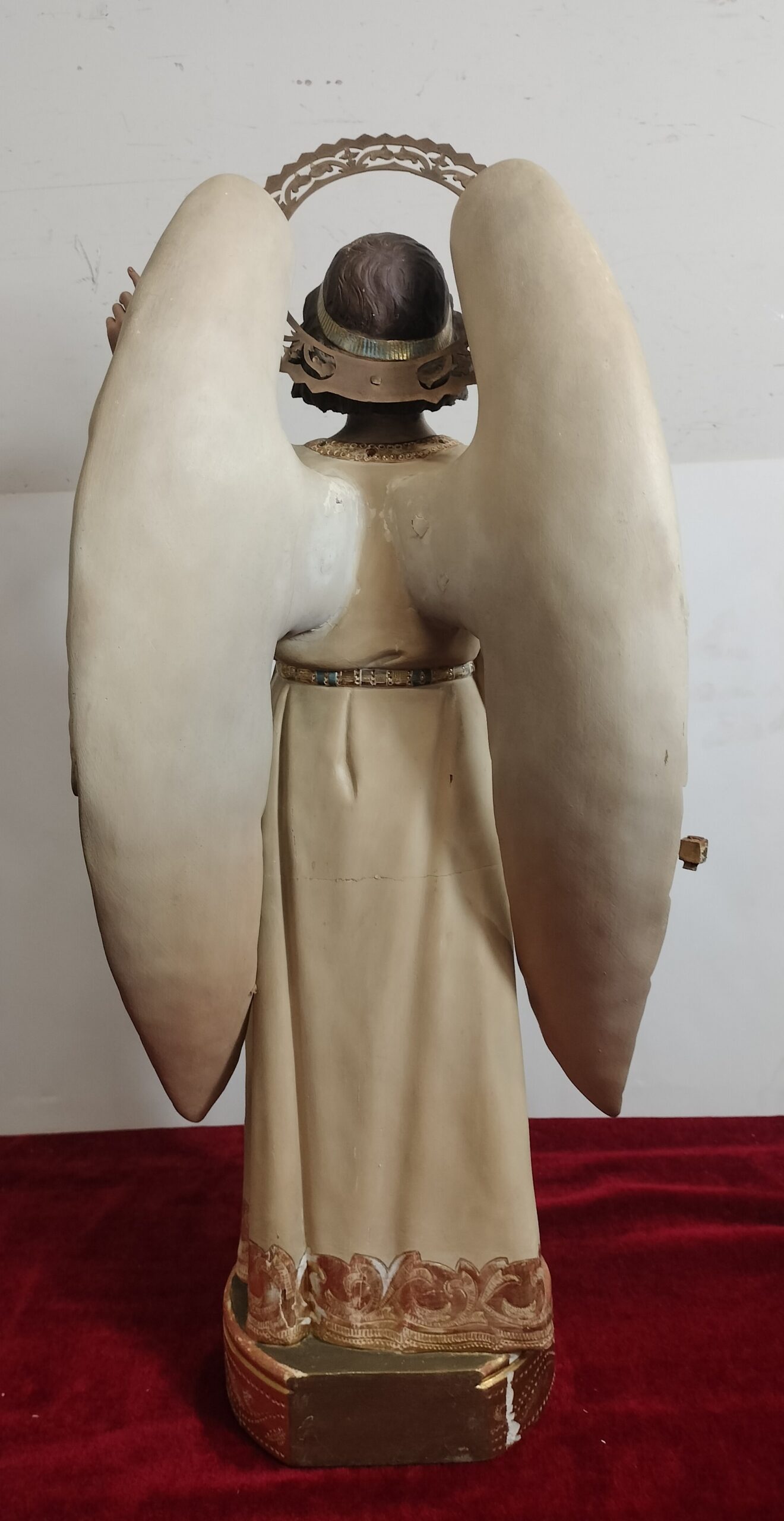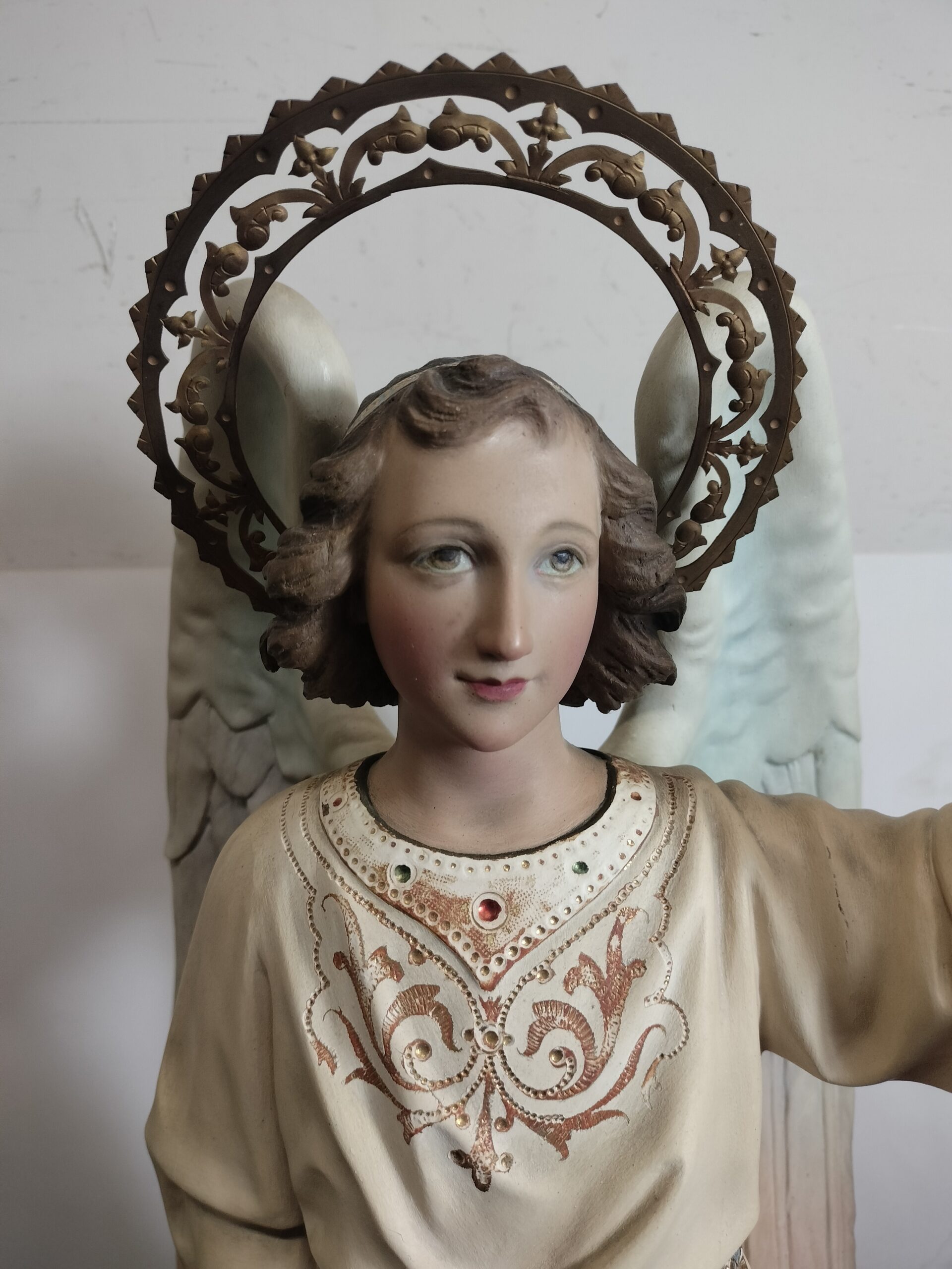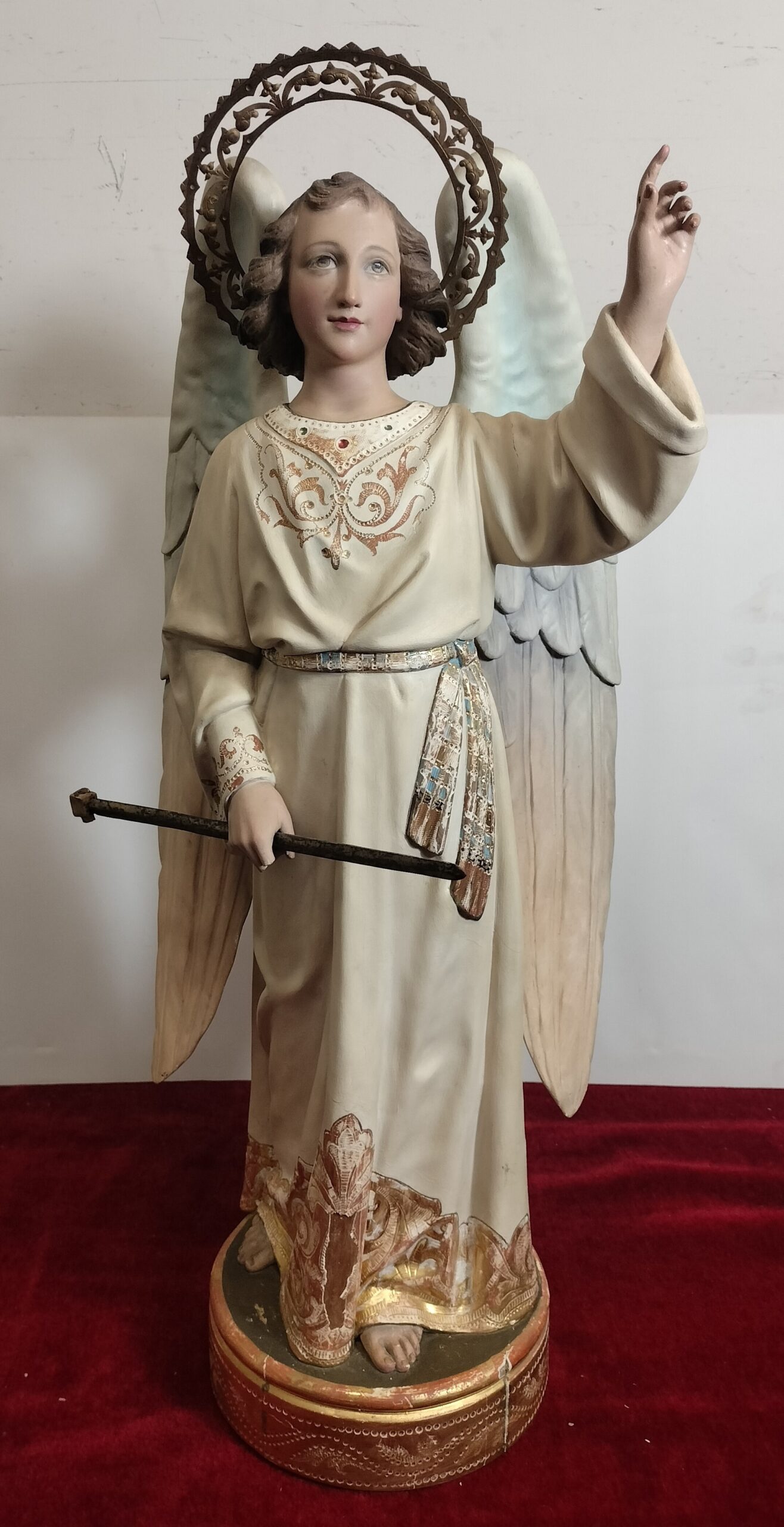 VER IMÁGENES PARA COMPROBAR EL ESTADO REAL. LAS IMÁGENES FORMAN PARTE DE LA DESCRIPCIÓN. ARCÁNGEL SAN RAFAEL. TALLA EN MADERA POLICROMADA. ESPAÑA. SIGLO XIX. CORONA DE LATÓN. SIN MARCA DE AUTOR. LA ESPADA HA PERDIDO LA EMPUÑADURA ORIGINAL. BASE, BORDES DE LA TÚNICA Y CINTURA ORNADOS CON INCISIONES POLICROMADAS EN DORADO, ROJO, VERDE Y AZUL, A IMITACIÓN DE PIEDRAS. ALAS CON UN TONO AZULADO. PRESENTA PÉRDIDAS DE PINTURA Y DESGASTE DE LA MISMA. MARCAS DE RESTAURACIÓN POSTERIOR EN LAS ALAS. PEQUEÑA FRACTURA HORIZONTAL.